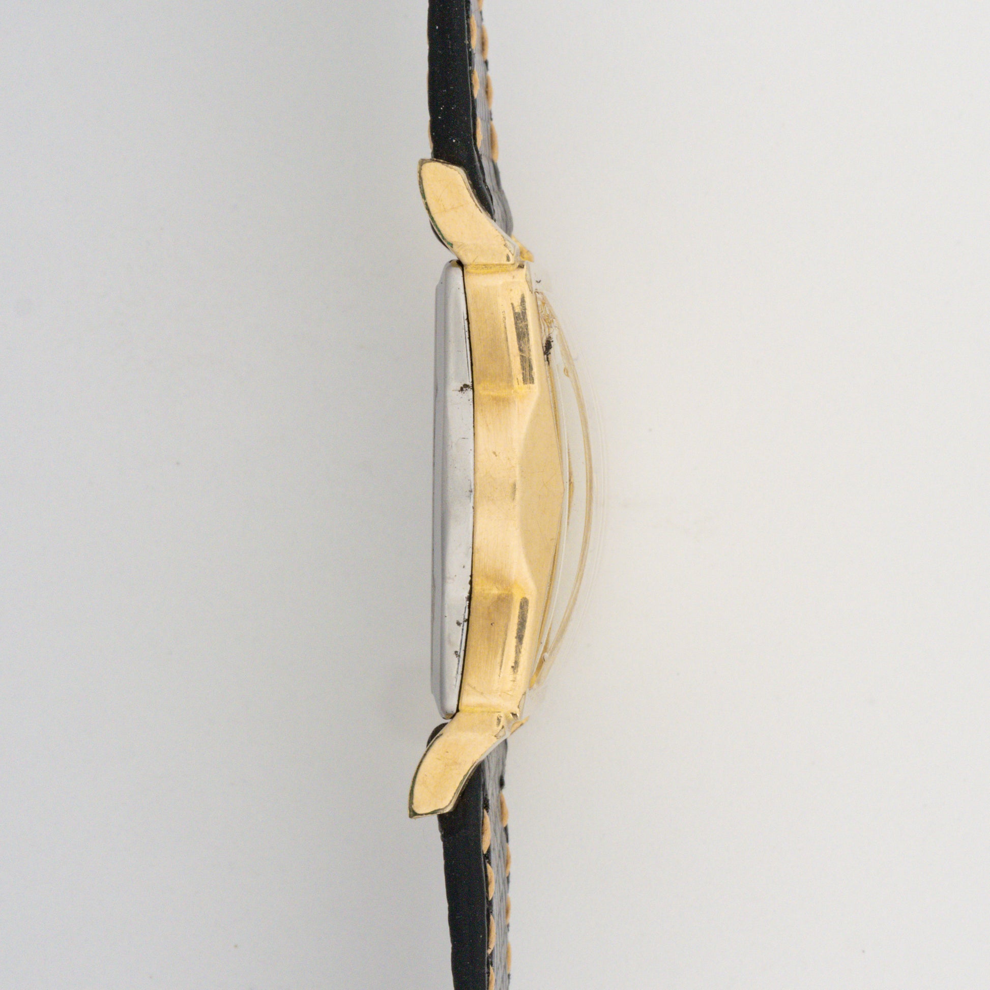 - Case: shows moderate wear consistent with its age, with some visible scratches and minor tarnishing. The original brushed finish on the sides is partially worn, and there's noticeable wear on the lugs where the strap attaches. The two-tone design with the stainless steel back remains intact, though the case back shows surface scratches typical of normal use.