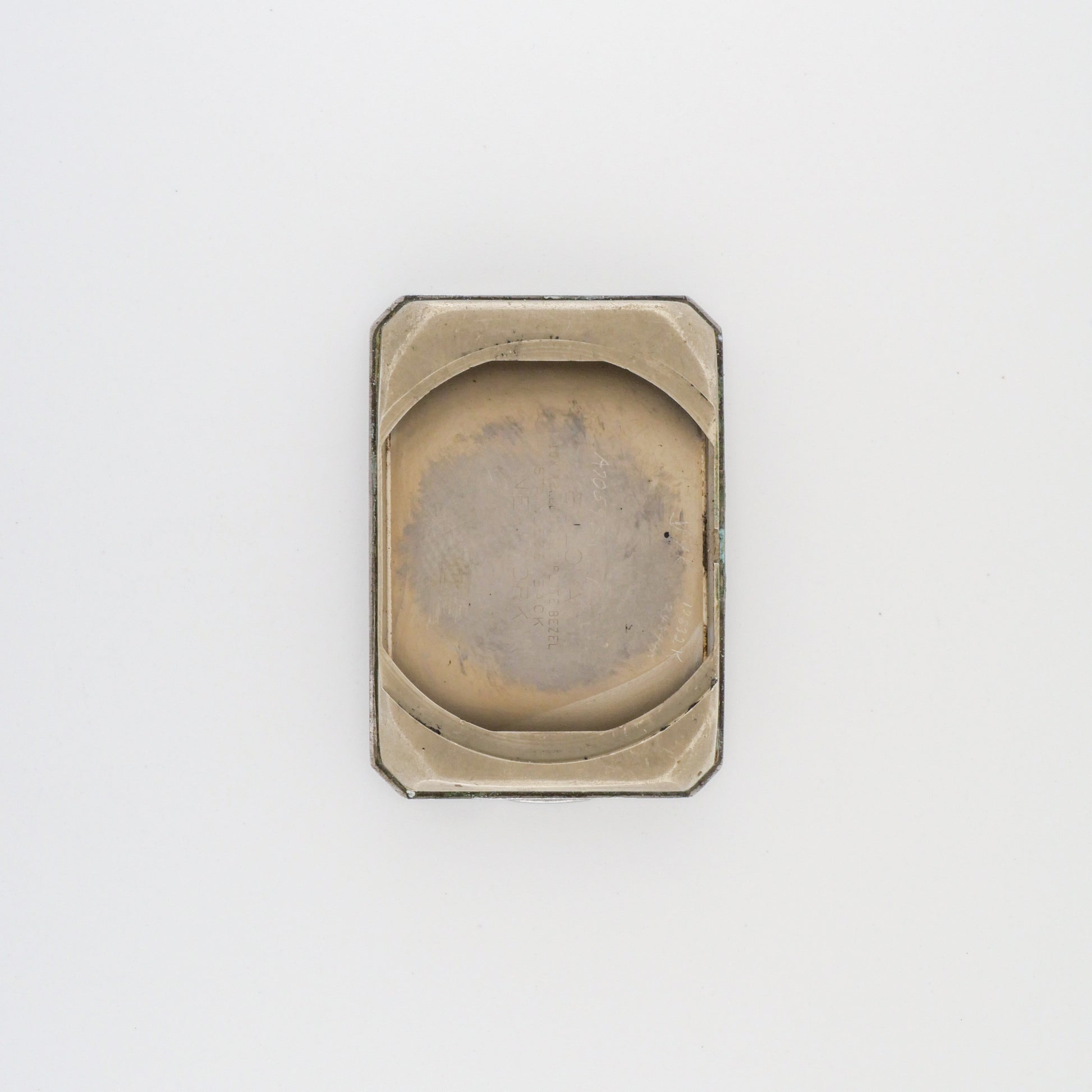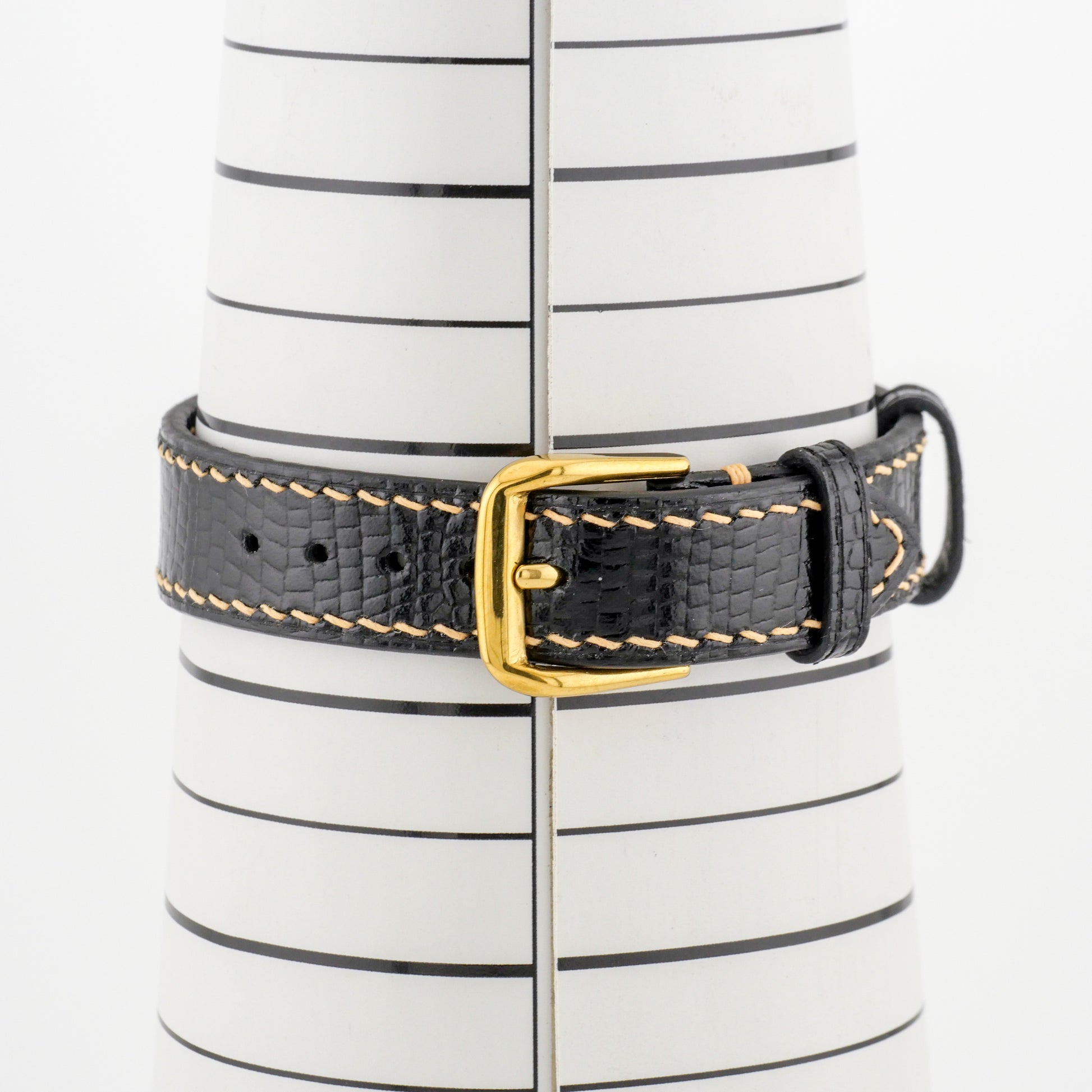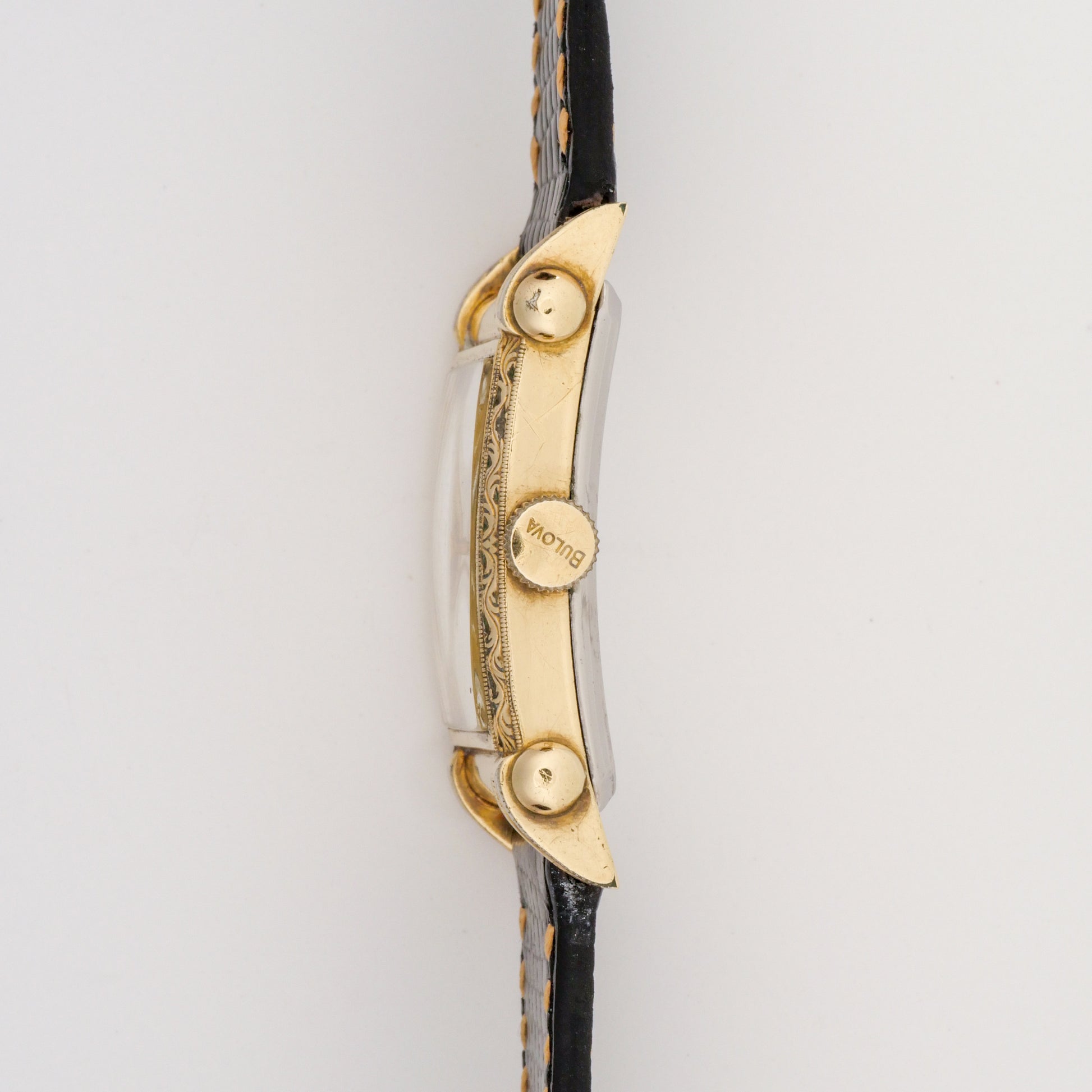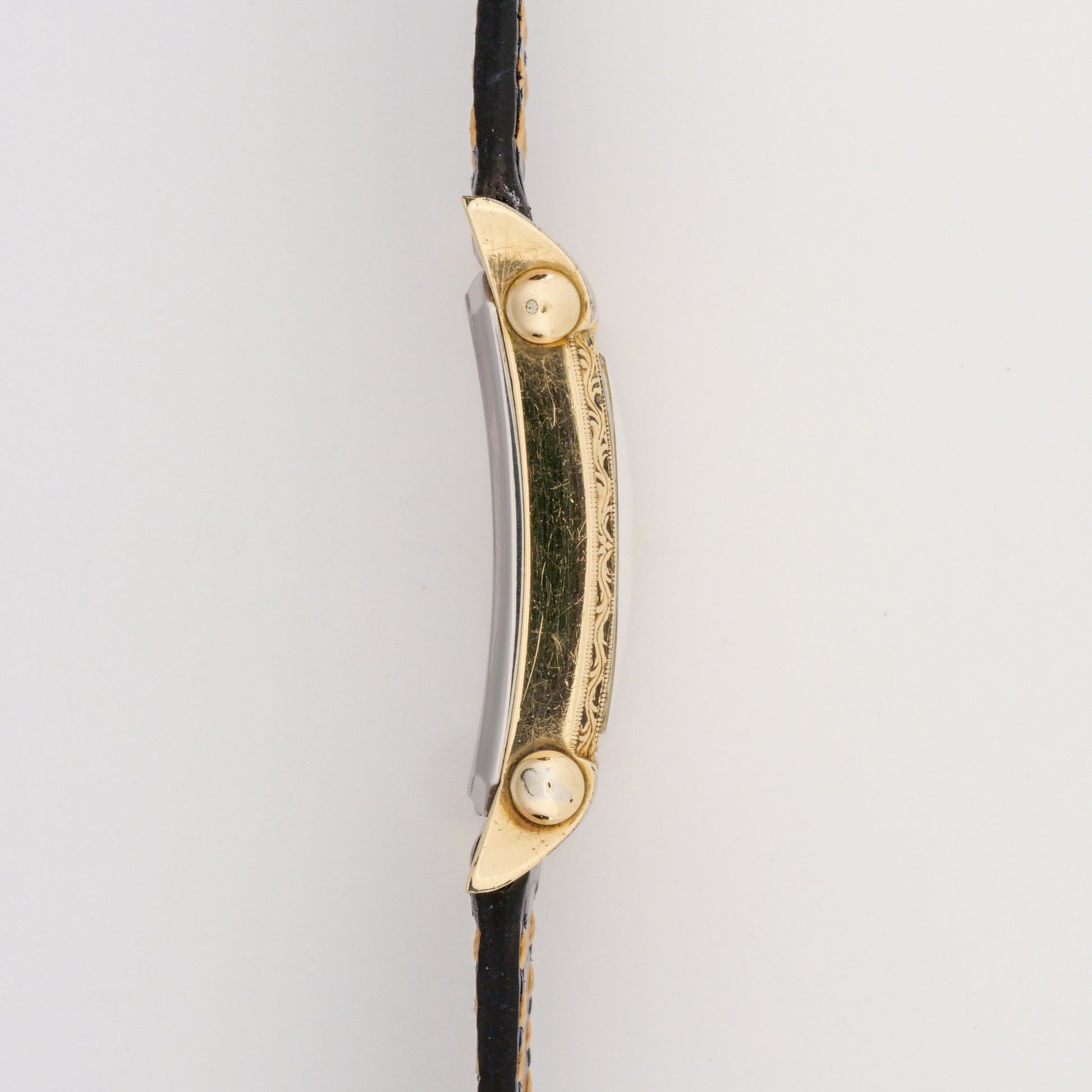 - Case: shows moderate wear consistent with its age. The decorative engraving on the right side remains clear and well-preserved. There appears to be some light scratching and patina on the gold finish, particularly around the lugs and case edges. The case retains its original distinctive curved design with the characteristic stepped edges.
