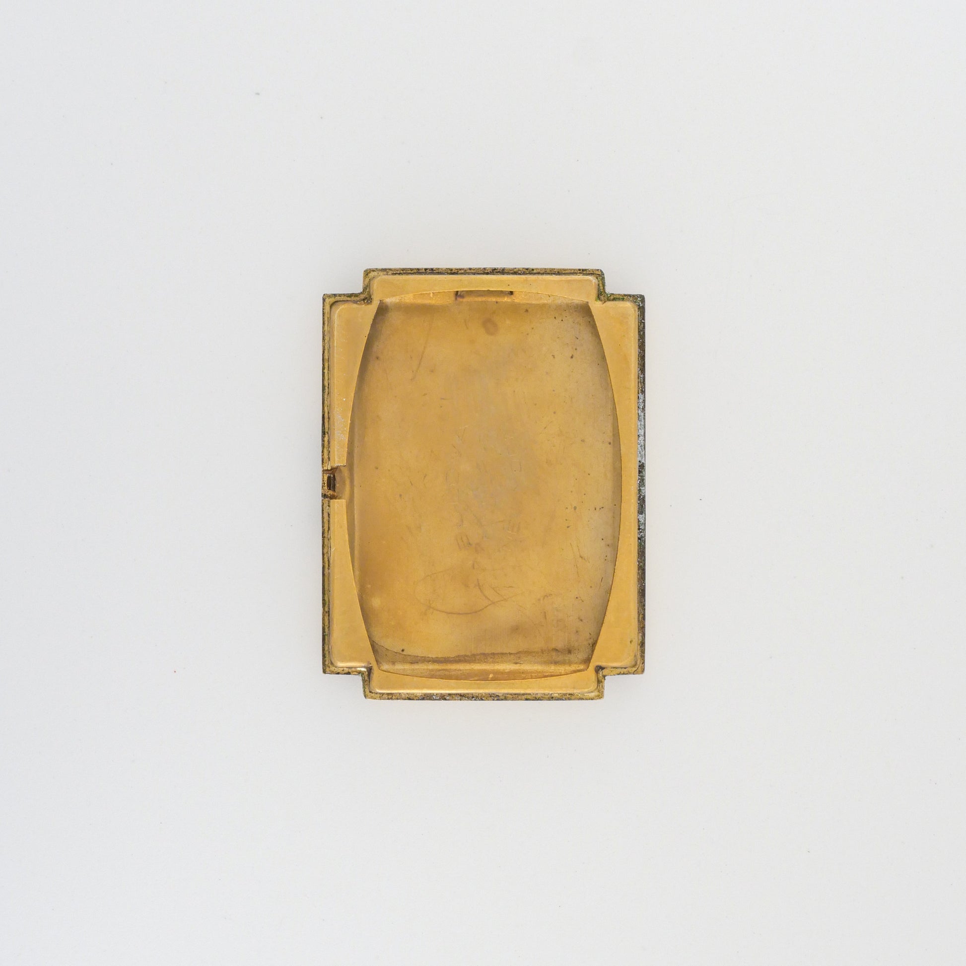 - Case: moderate to heavy wear consistent with age and use. There's visible scratching and scuffing throughout the gold surface, with some areas showing more significant wear where the underlying metal may be starting to show through. The decorative stepped case design remains intact, though the edges show dulling from handling.