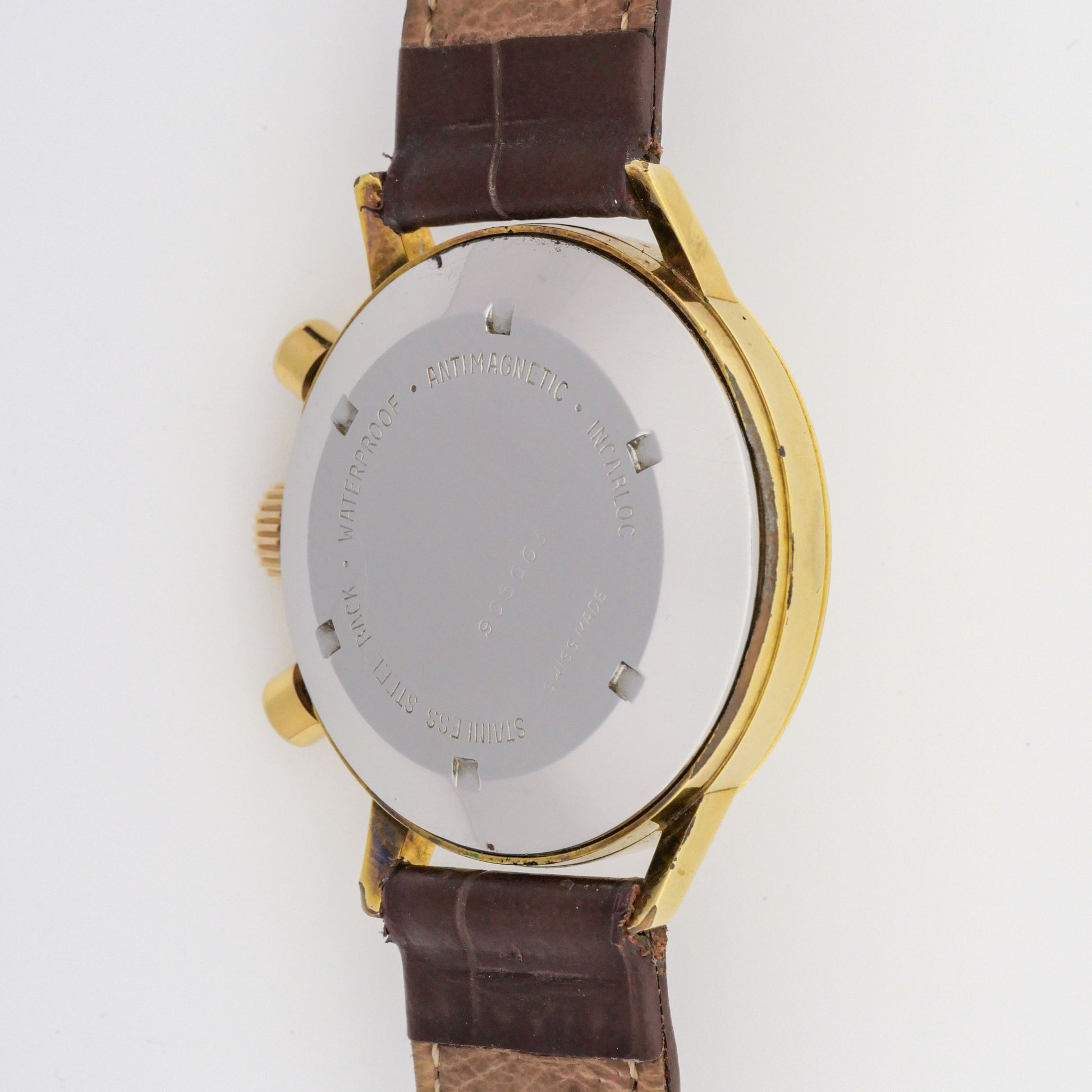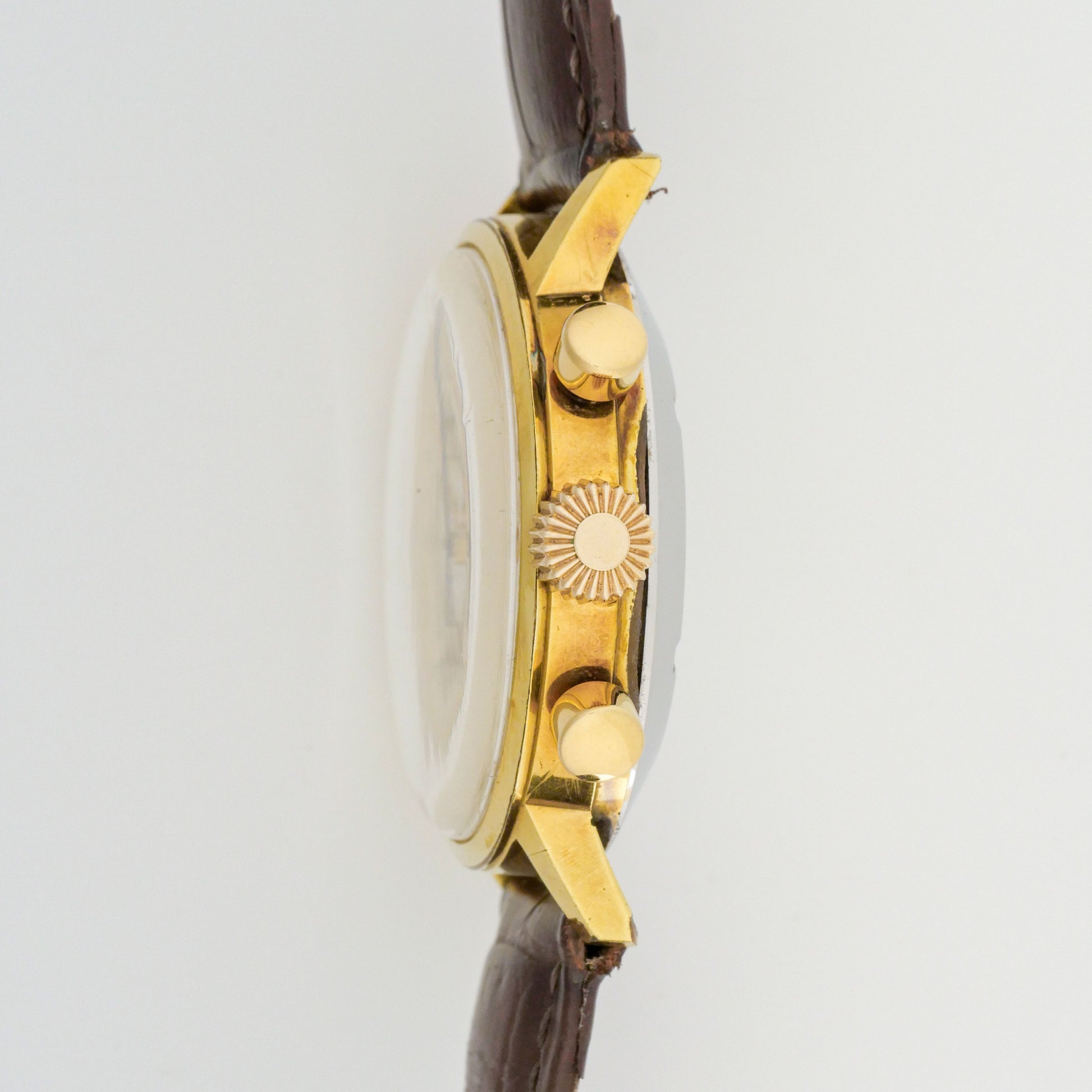 - Case: Shows moderate to significant wear consistent with age and use. Visible scratches and scuffs throughout the case surfaces, particularly on the sides, lugs, and case edges. The gold plating shows notable loss in several areas, especially around the lug roots and case flanks where the base metal is becoming visible. The overall case shape remains good with no major dents. Chronograph pushers retain their original form.