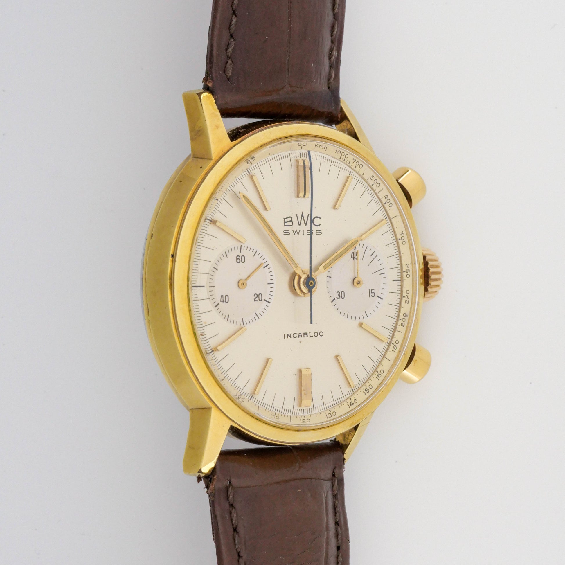 - Dial: Displays considerable aging with noticeable patina across the dial surface, which has developed a warm creamy-ivory tone. Some minor spotting and age-related blemishes are visible. The "BWC SWISS" and "INCABLOC" printing remains legible. The applied gold baton hour markers show their original finish. Both subdials maintain a cream tone consistent with the main dial, showing minor aging.