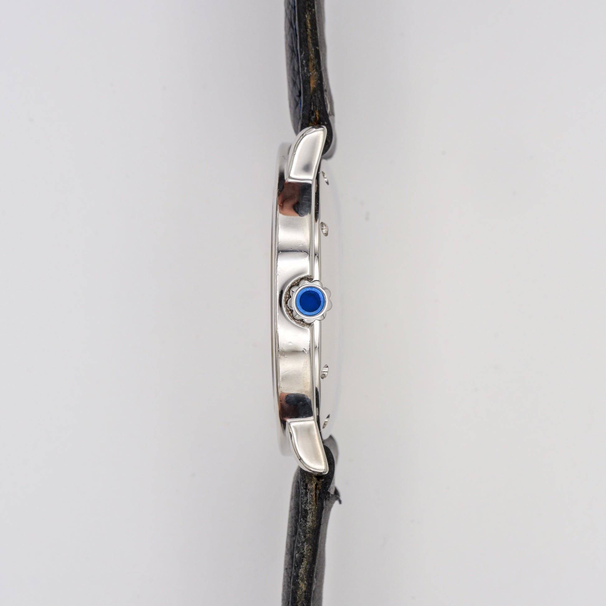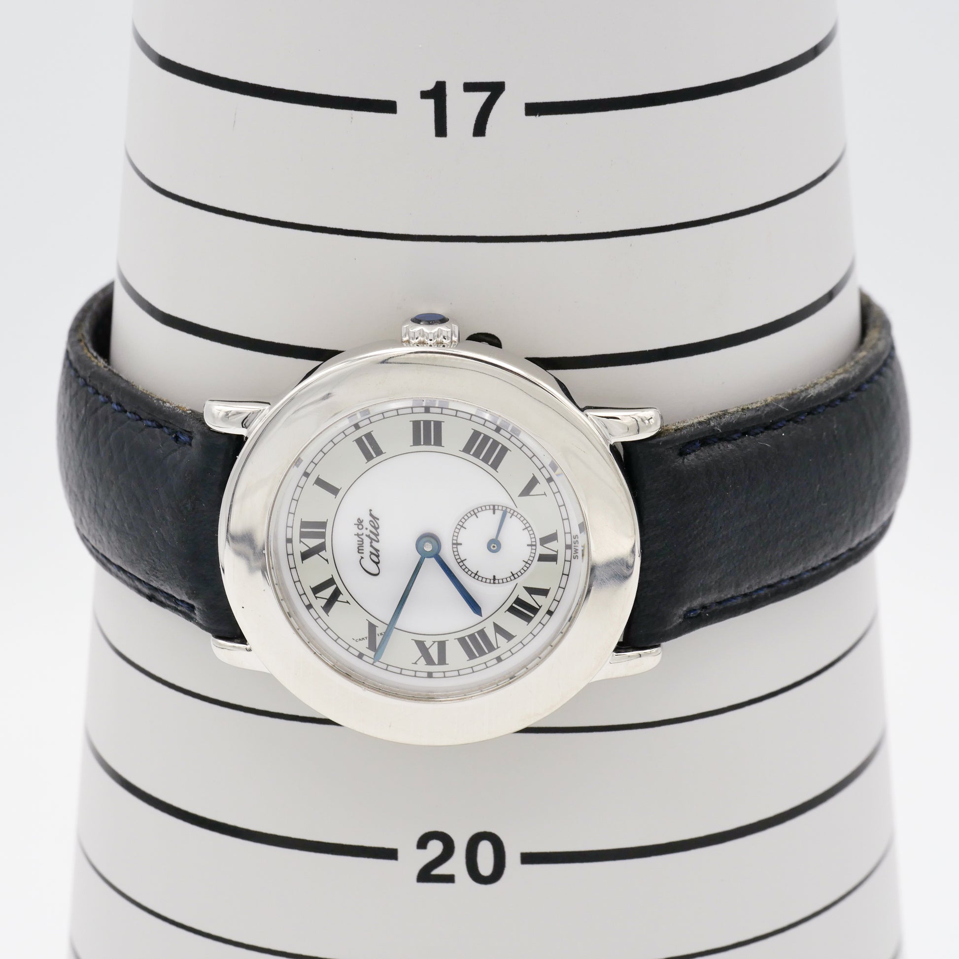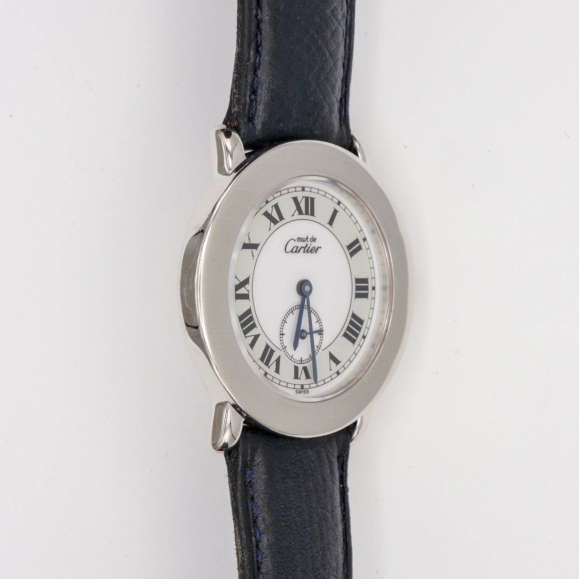 - The white dial seems to be in excellent condition. The black Roman numerals, Cartier logo, and minute markers are crisp and clear. There are no signs of discoloration, fading, or damage to the dial surface.