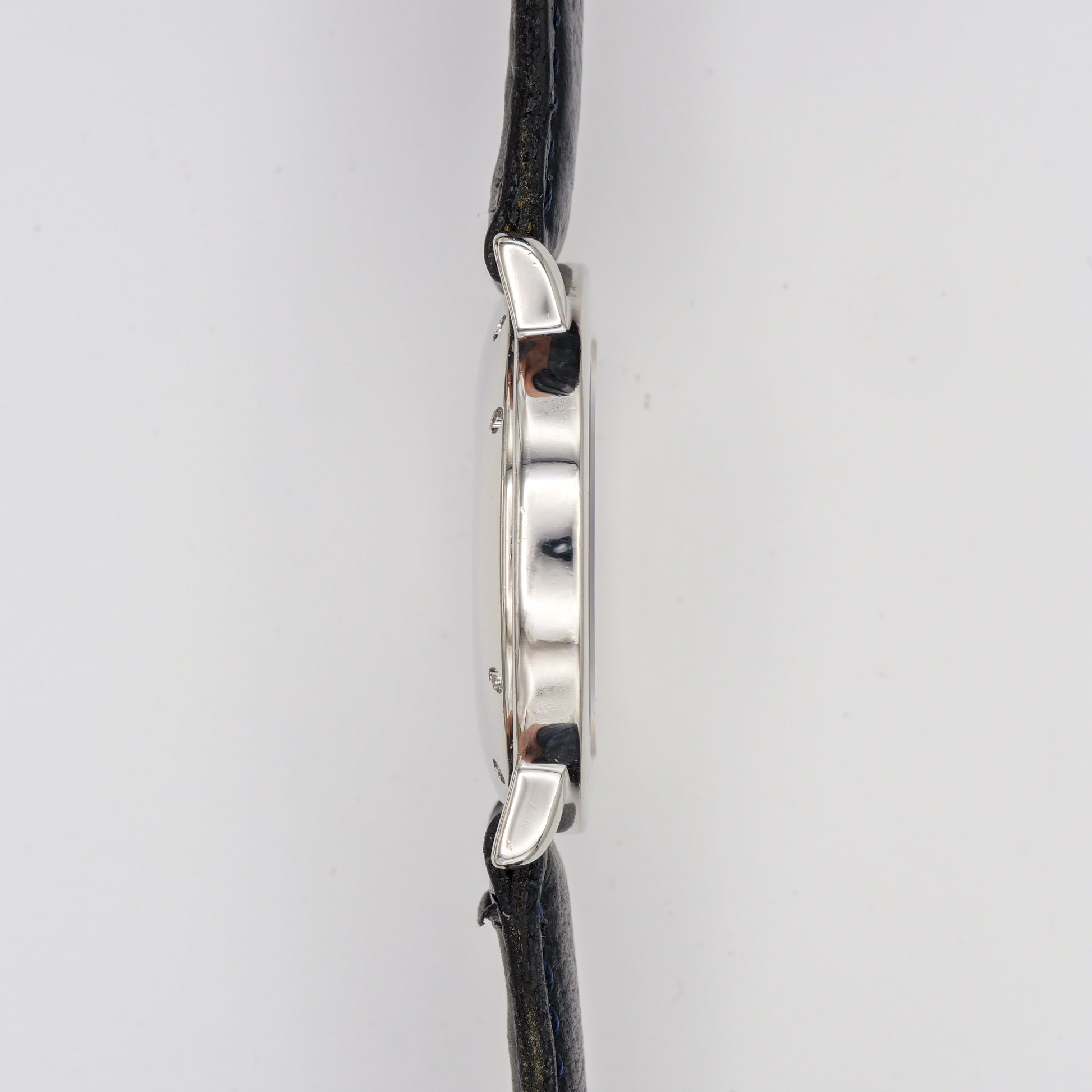 - The silver case appears to be in good condition with only fine-hair surface marks. It maintains its polished finish and smooth edges.
