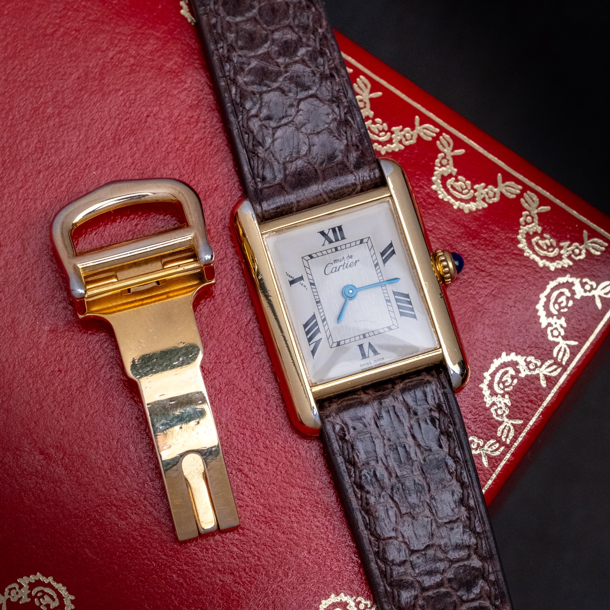 - Dial: is in very good condition, with clean and crisp Roman numeral markers and Cartier branding. The white/off-white face shows minimal aging or discoloration. The blued hands are well-preserved with no apparent corrosion or damage. The overall legibility of the dial remains excellent.