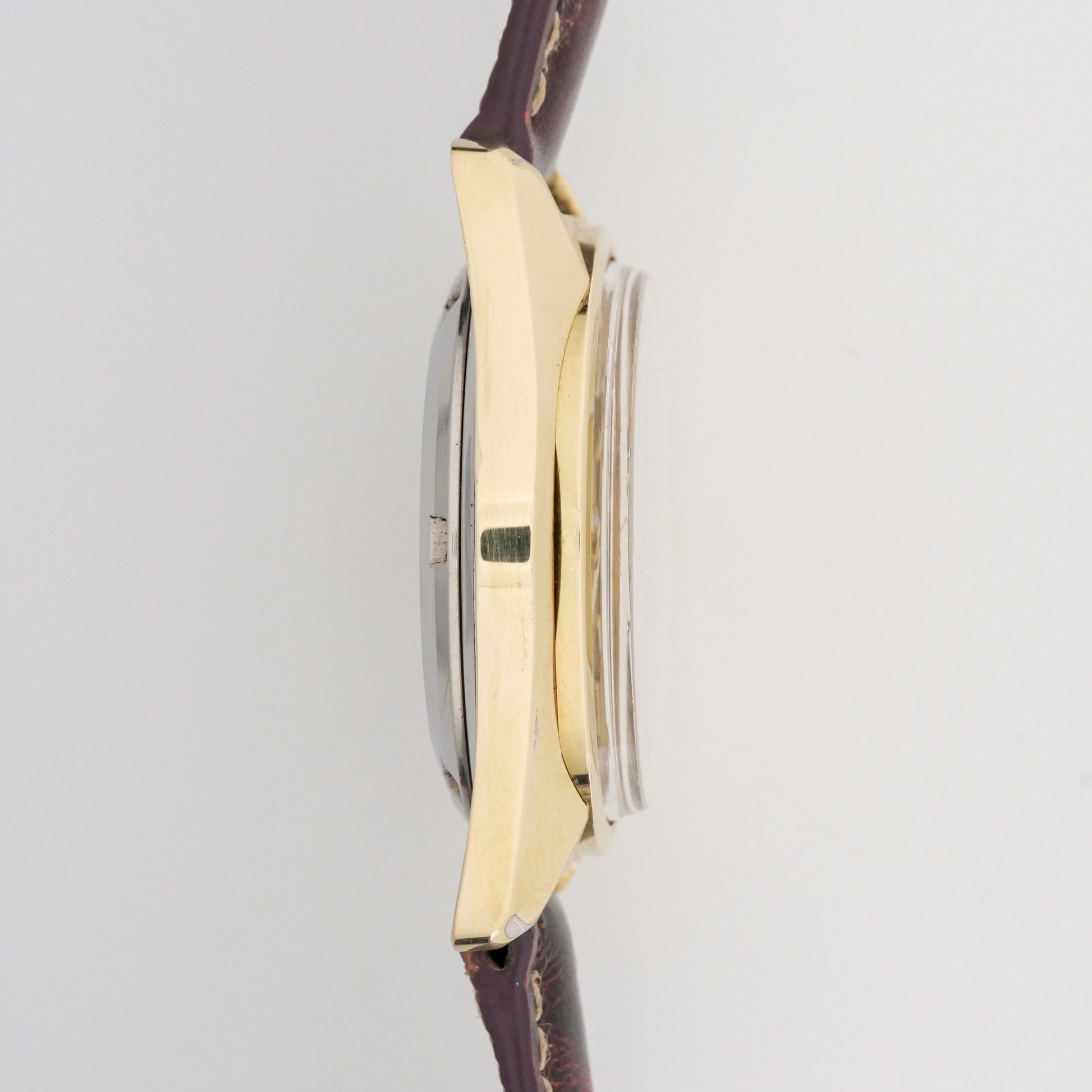 - Dial: has been refinished and is in good condition with an attractive brushed gold center contrasting against the dark outer ring. The hour markers and hands retain their gold finish well. The day-date window at 3 o'clock is clear and legible.