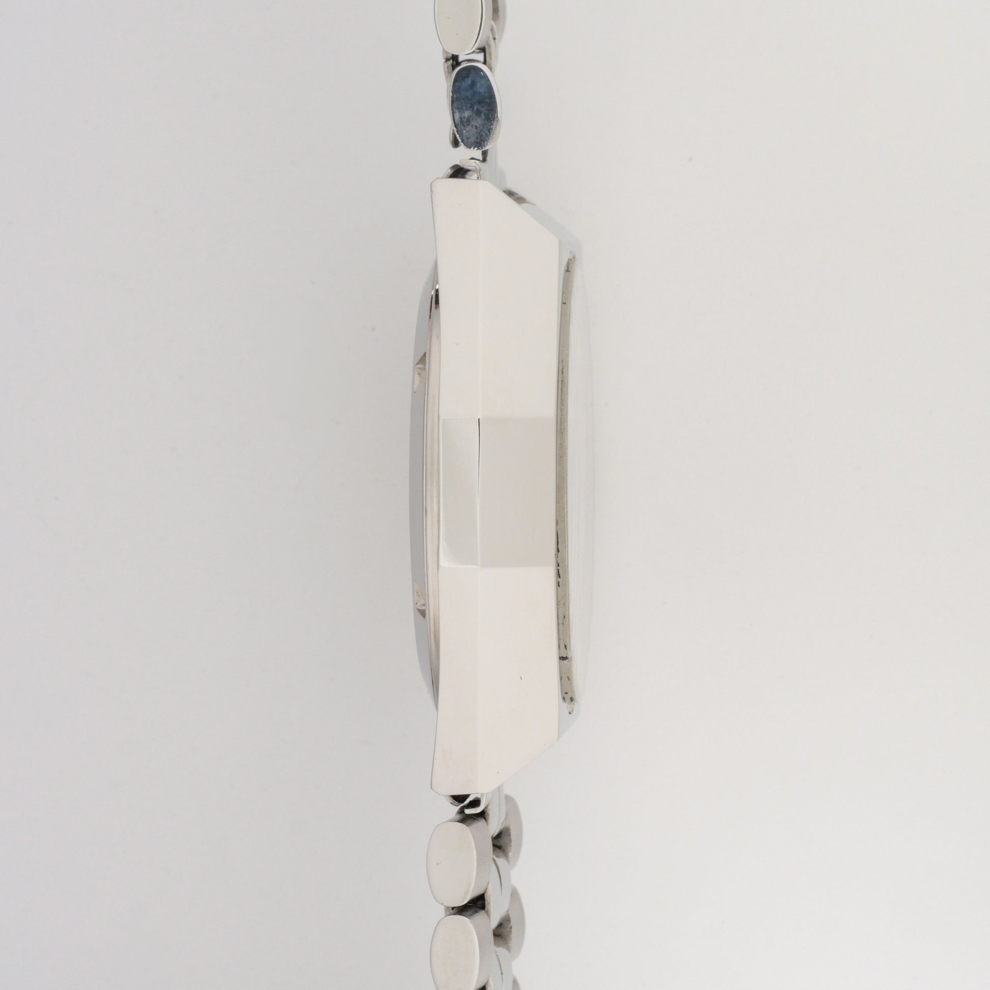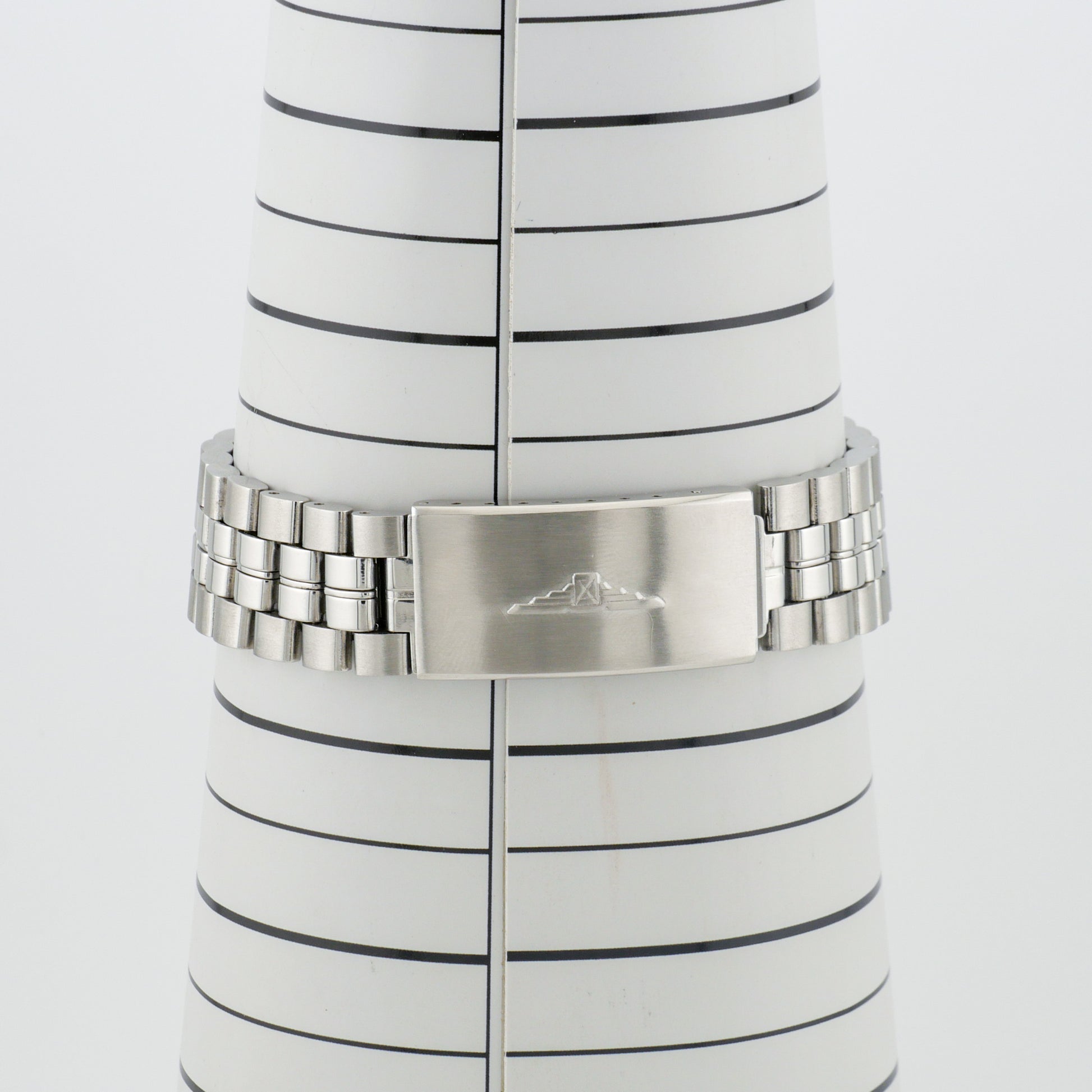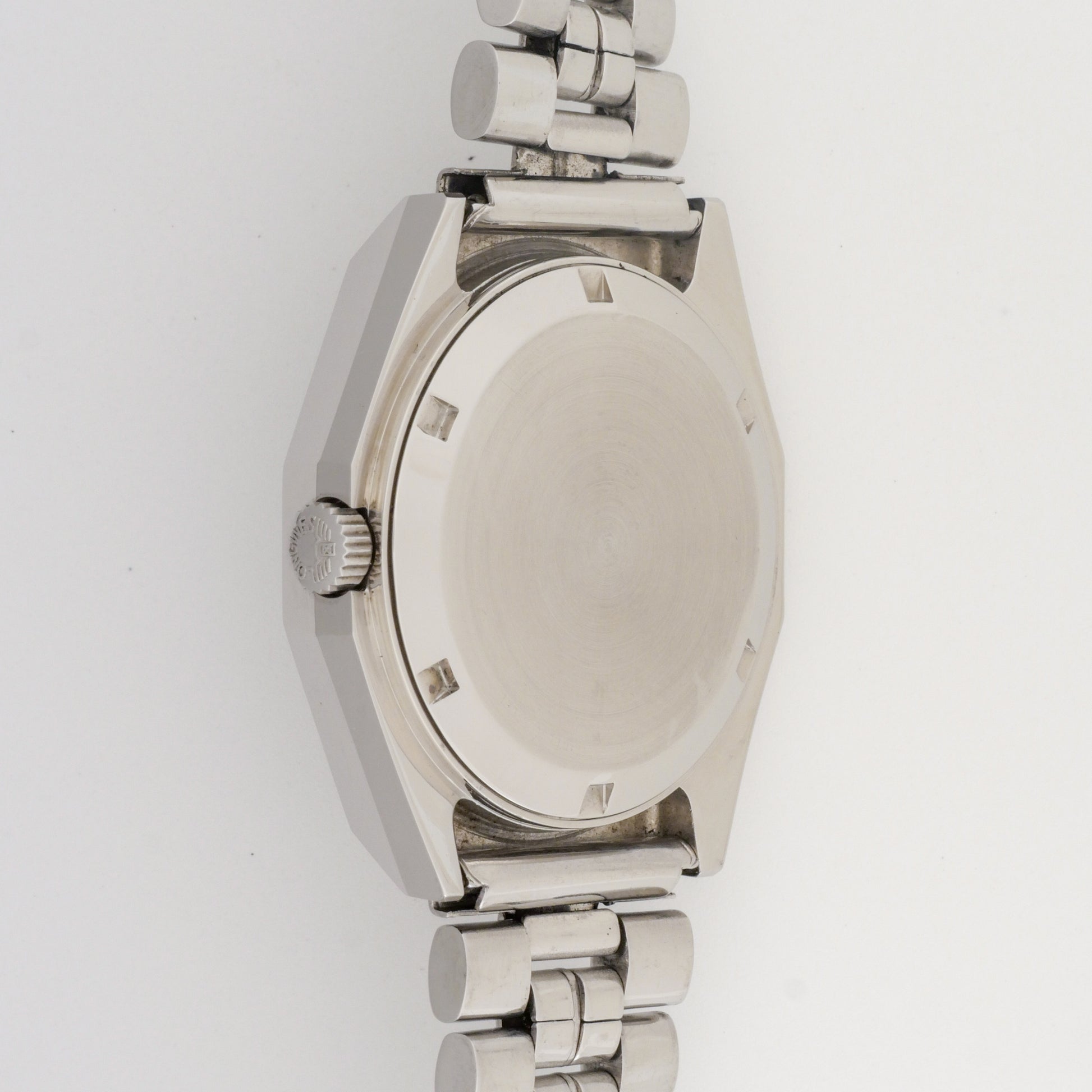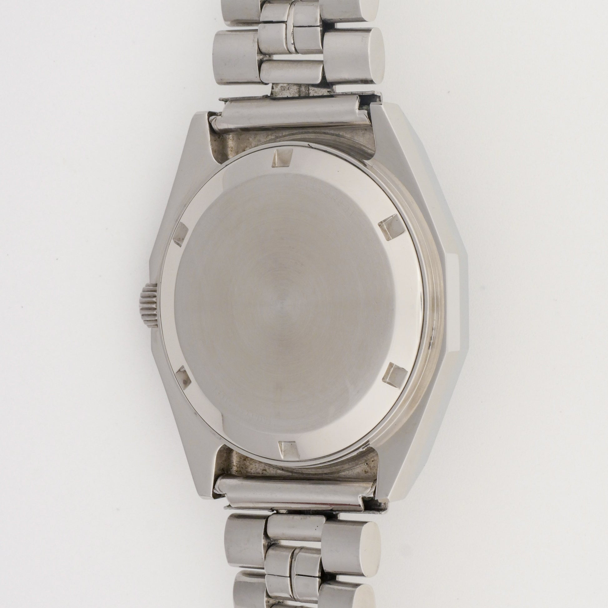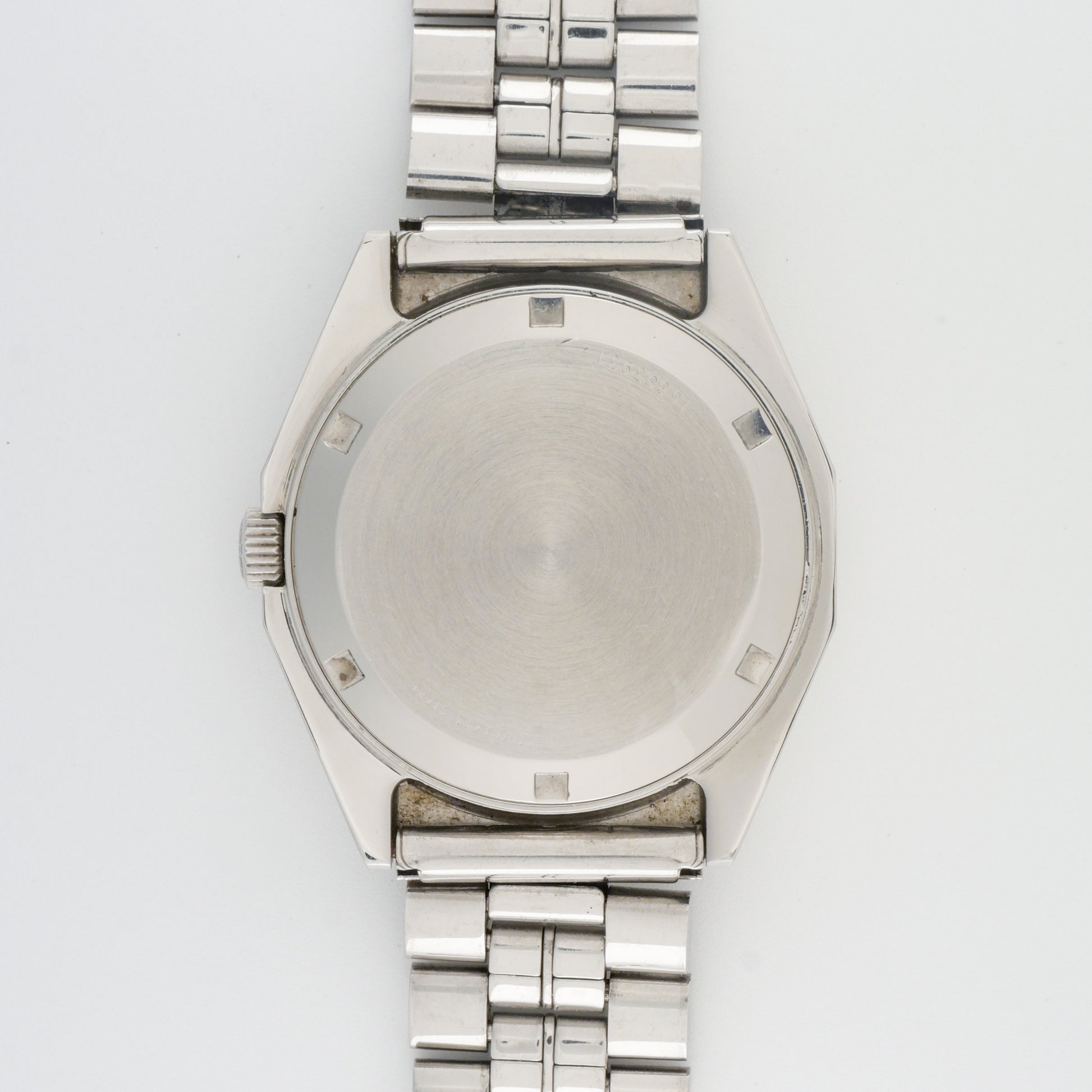 - Case: exhibits moderate signs of wear consistent with age and use. There are visible minor scratches and slight tarnishing on the polished surfaces, particularly on the case edges and lugs. The crown is in good condition with some wear on the fluting. The case back shows circular brushing marks and some edge wear where it meets the bracelet.