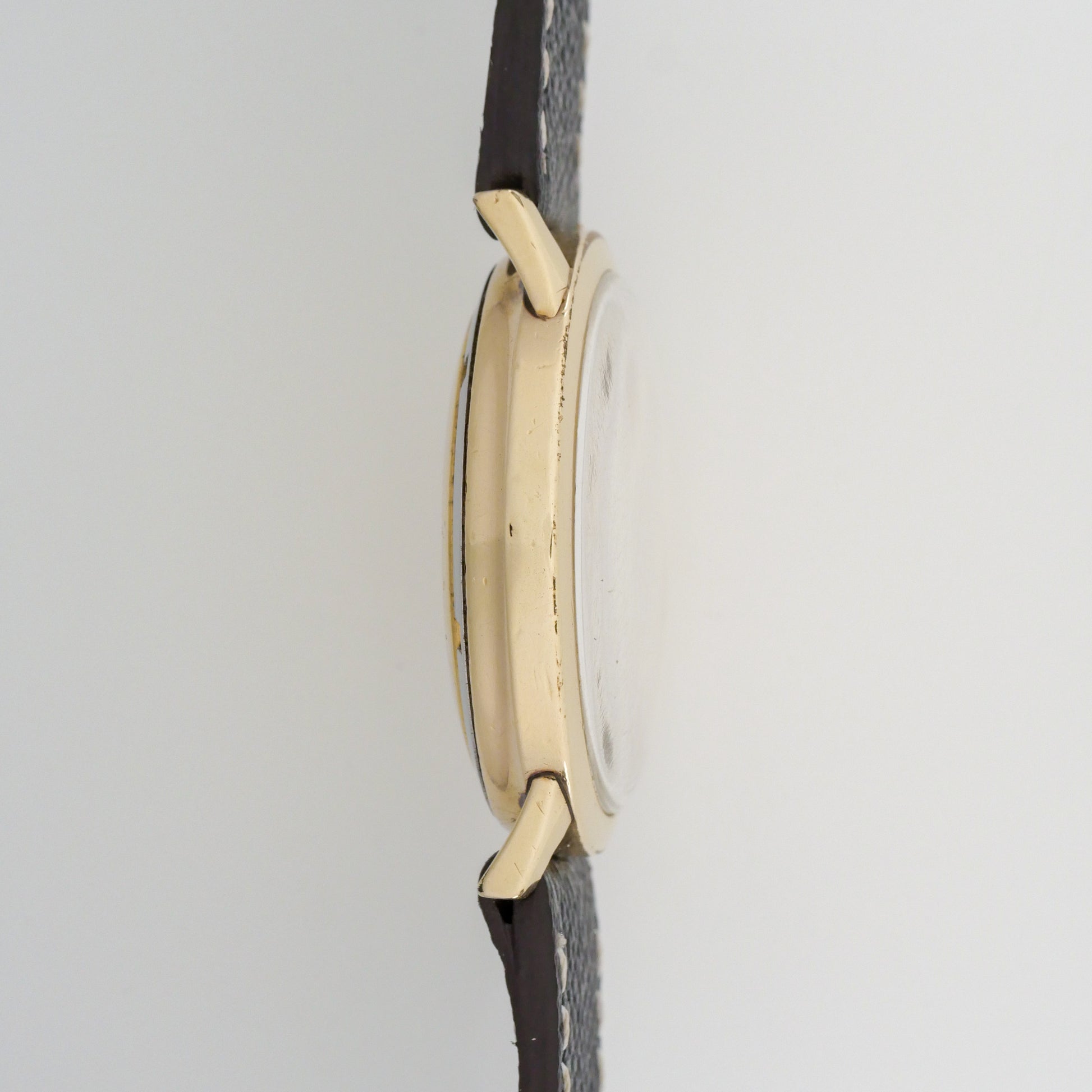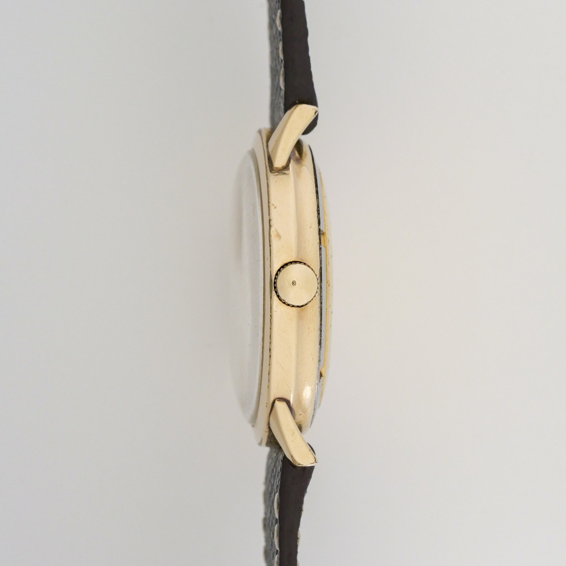 - Dial: is in good condition with minimal aging. The applied gold hour markers and Arabic numerals at 12, 3, 6, and 9 o'clock retain their color well. The dial surface is clean with no significant staining, spotting, or damage visible. The hands show appropriate patina matching the case material.