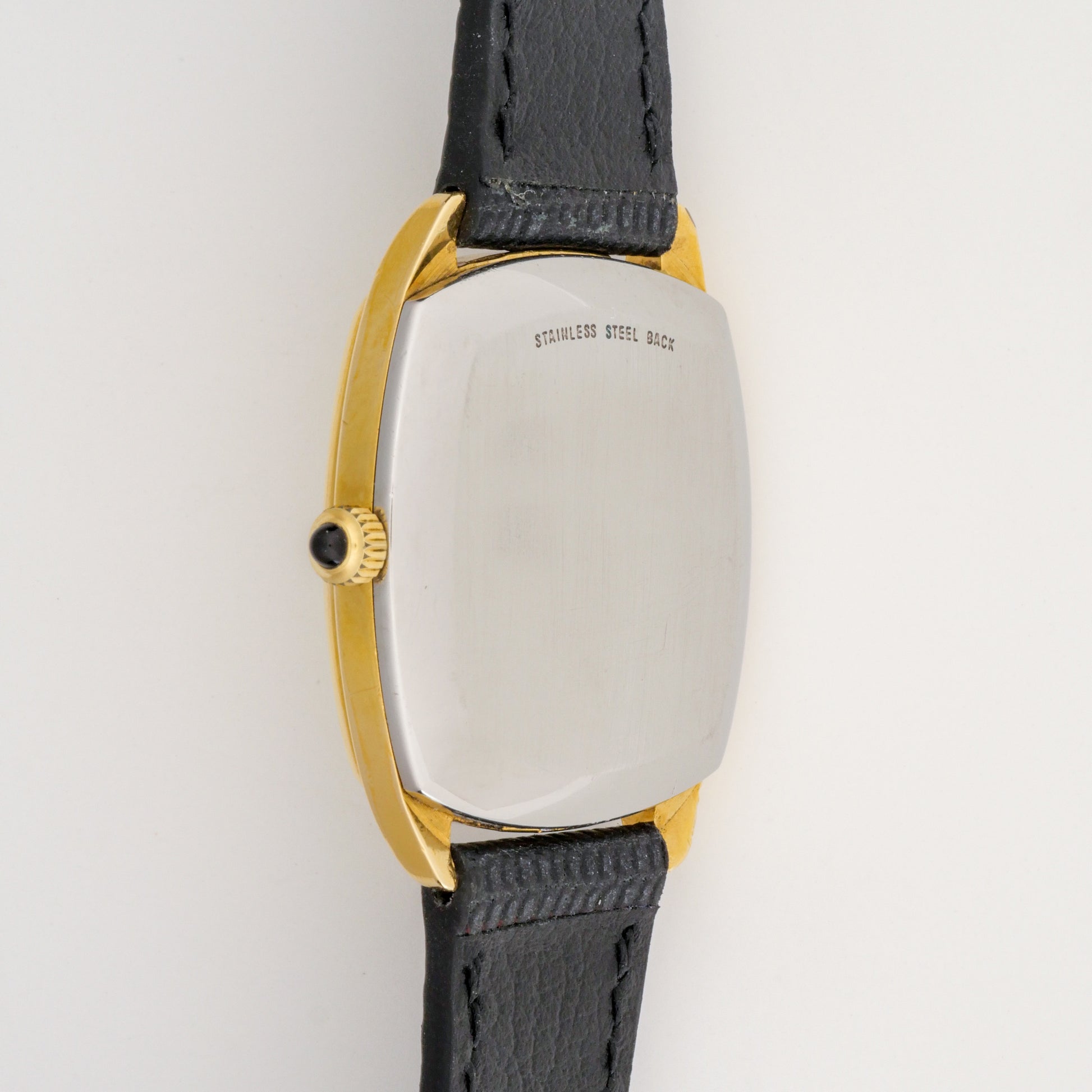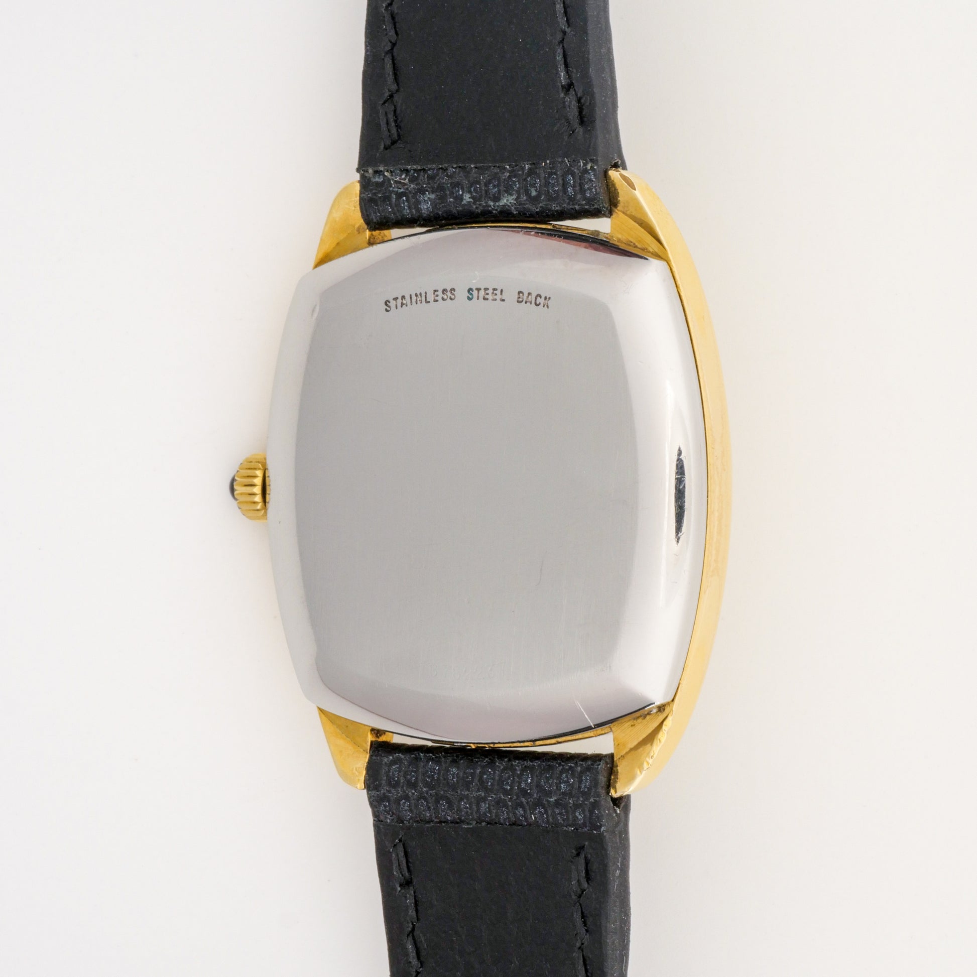 - Case: shows moderate wear consistent with age, including light scratches and some wear to the plating. The stainless steel caseback displays surface scratches and brushing marks. Overall shape remains good with no major dents or damage.