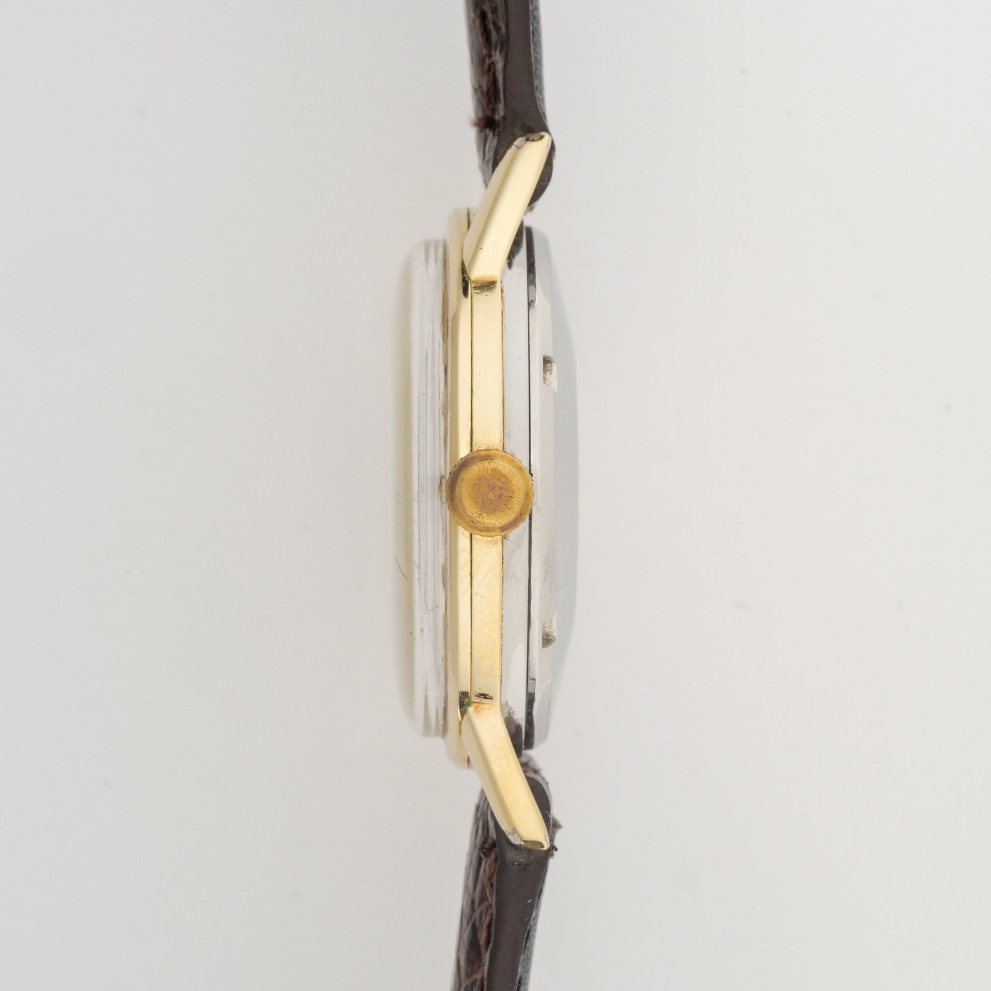 Case: shows moderate wear consistent with age and use. There are visible scratches and scuffs on the lugs and case sides, with some areas showing signs of plate wear where the base metal may be showing through. The case back has some scratches but retains its overall shape well.