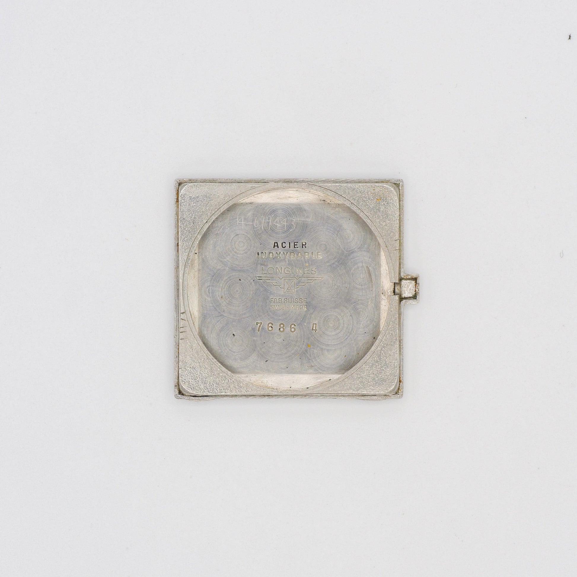 - The stainless steel case shows scratches and scuffs consistent with regular use over time. The case back serial number is visible, indicating it is an authentic Longines timepiece.