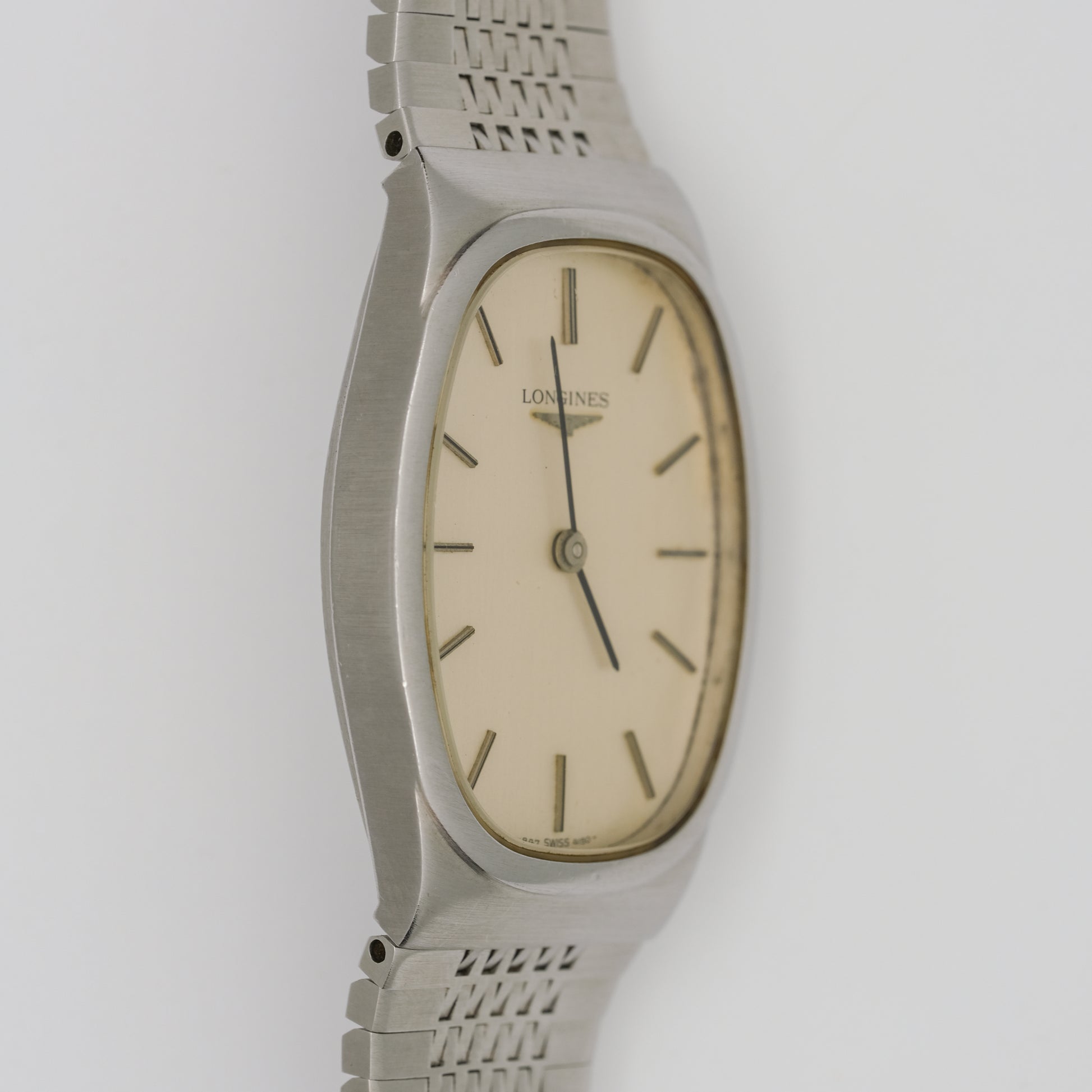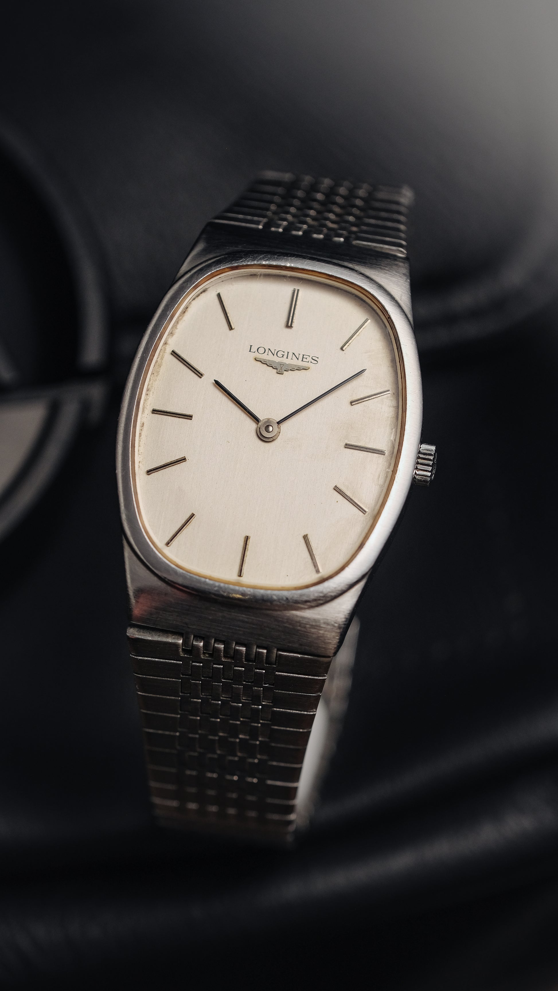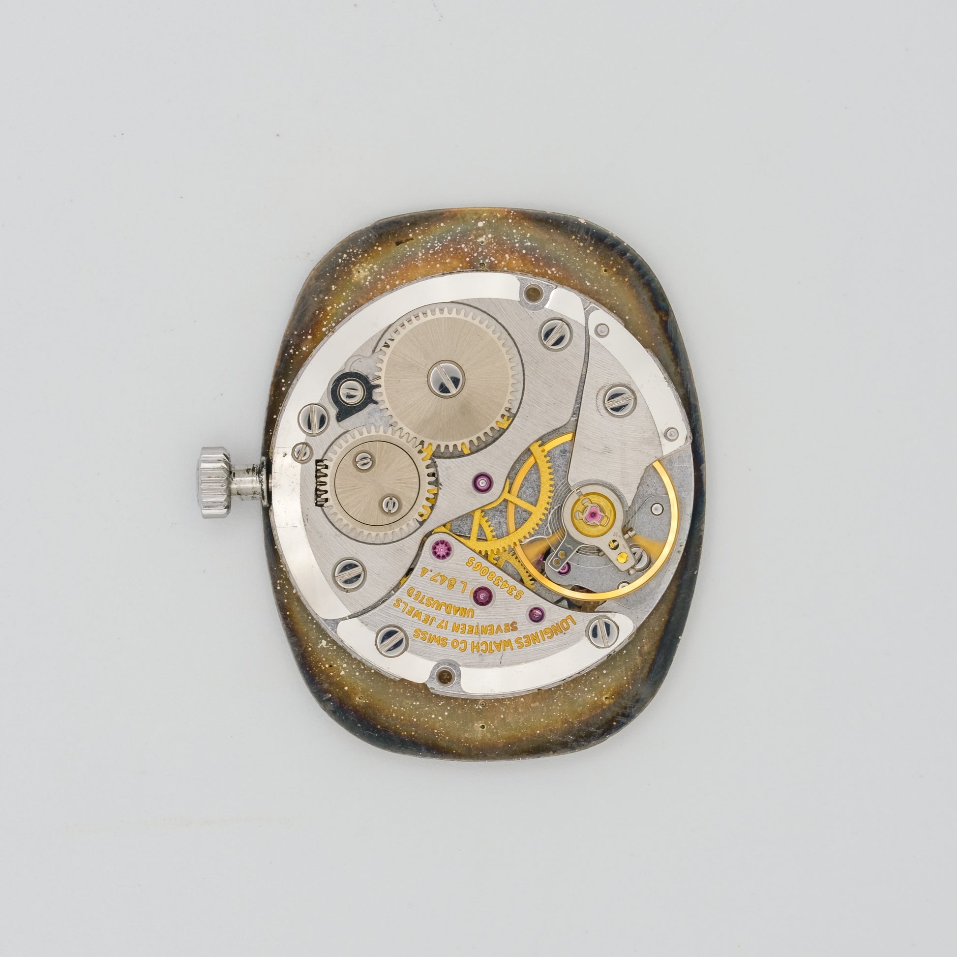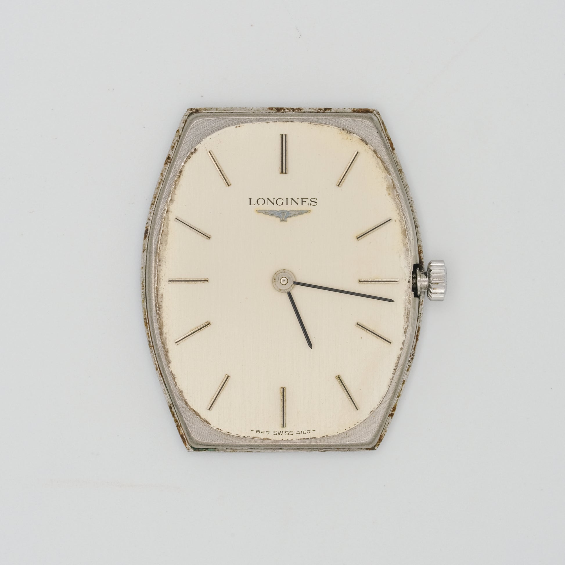 - Dial: is in good condition. The Longines logo and hour markers are clear and legible. There are noticeable stains/discoloration spots, particularly visible around the center of the dial and near some of the hour markers.