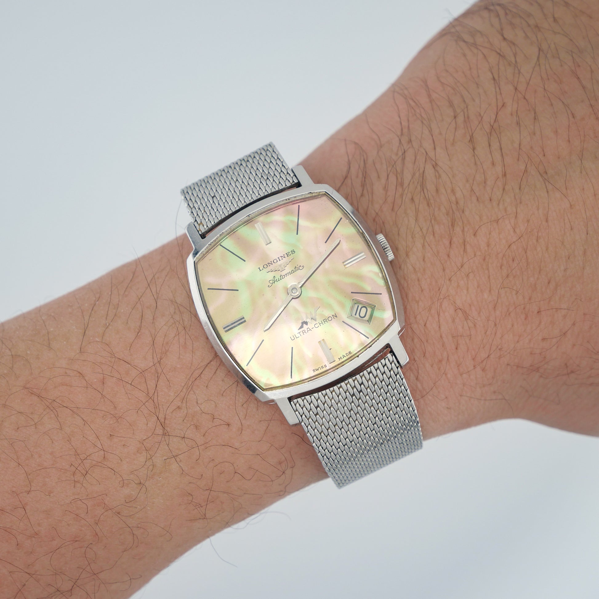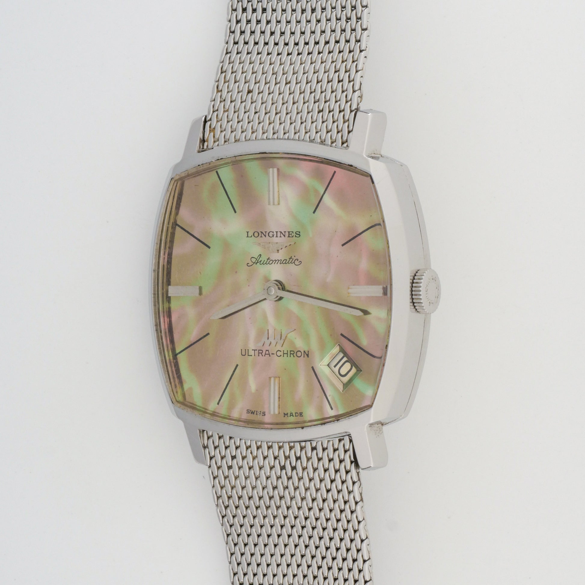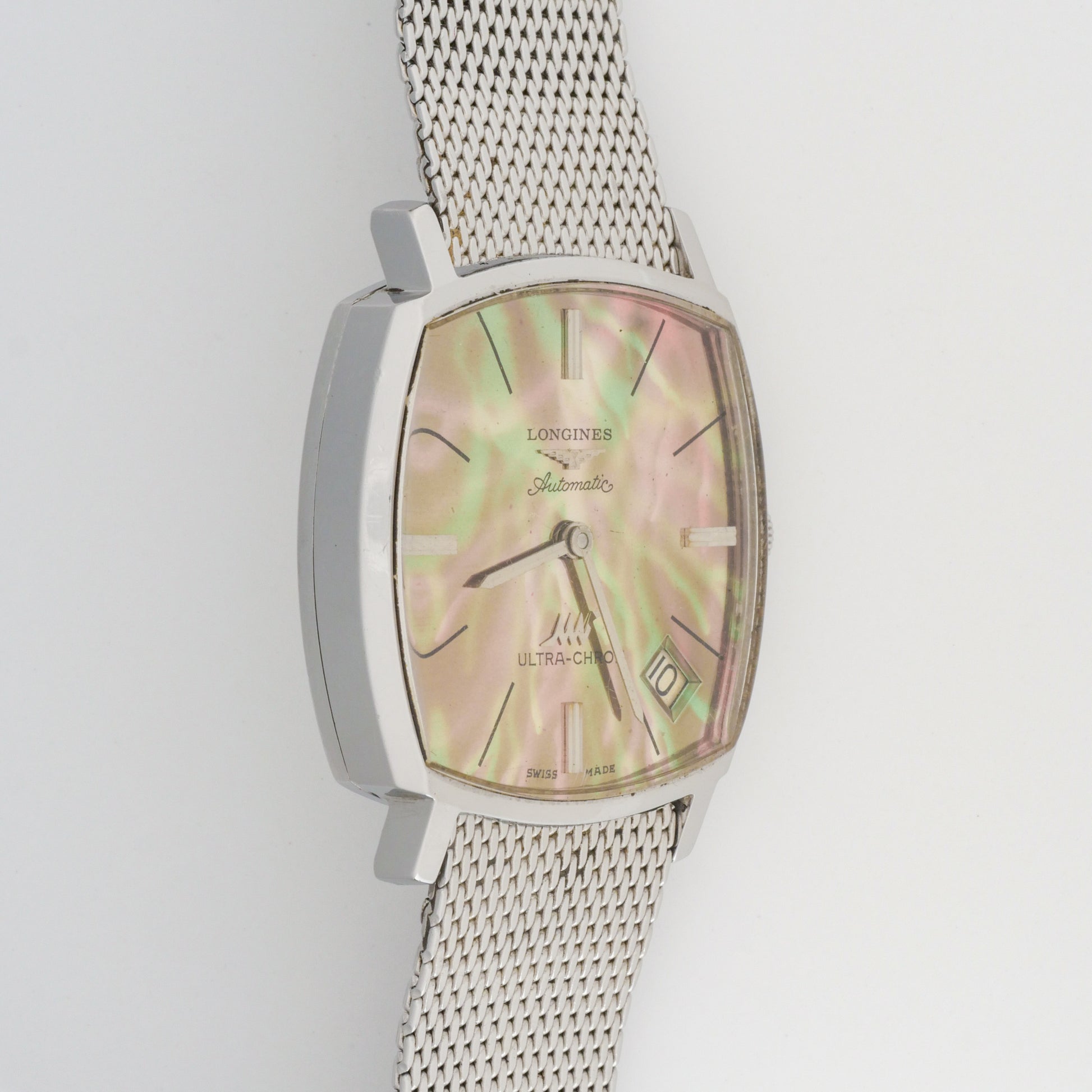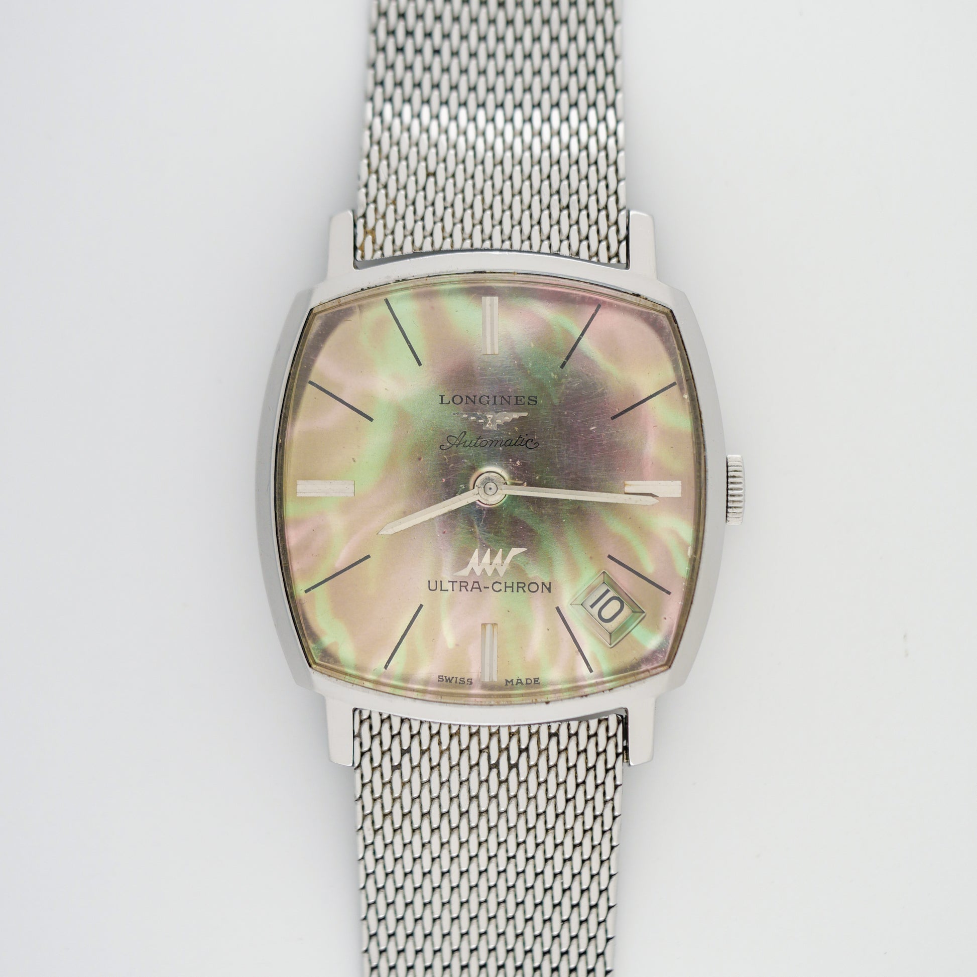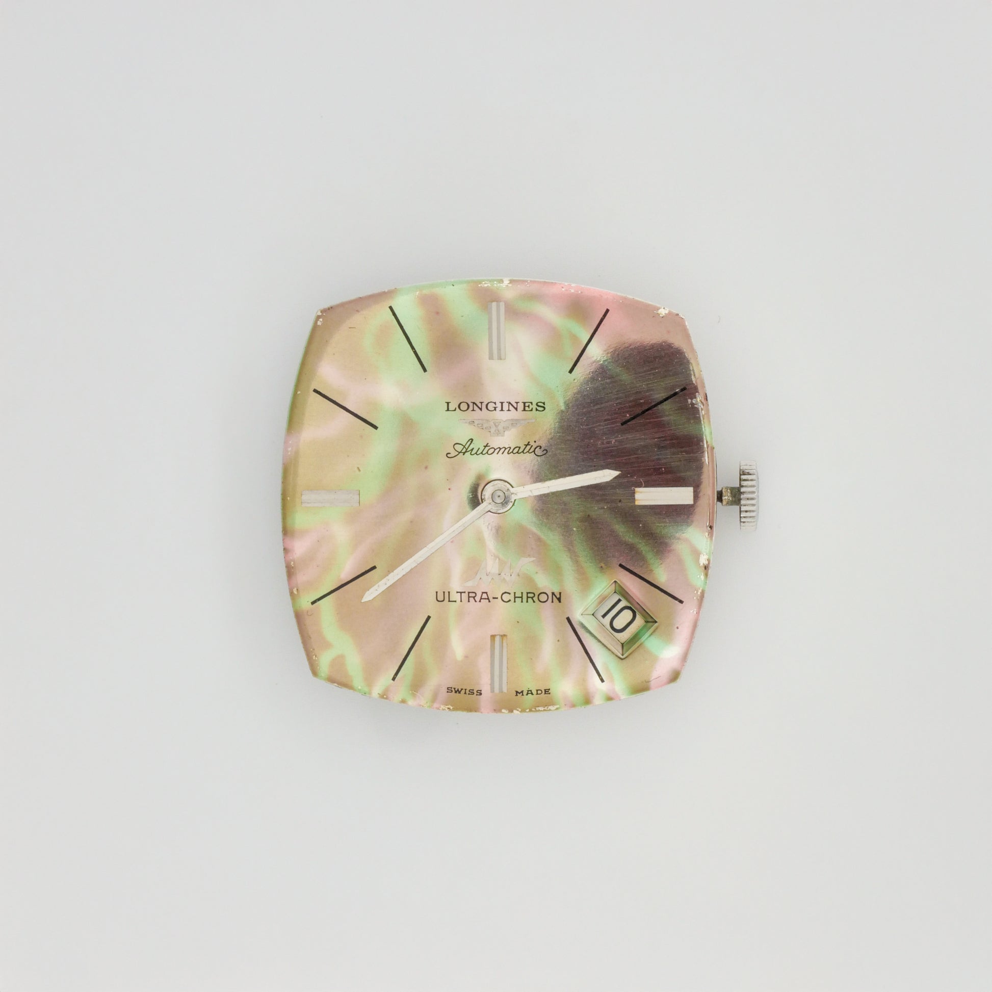 - Dial: has been repainted to a mother-of-pearl-like finish with iridescent green and pink hues. The surface shows some aging patina and light spotting, particularly in the center area. The applied hour markers and logo remain intact.