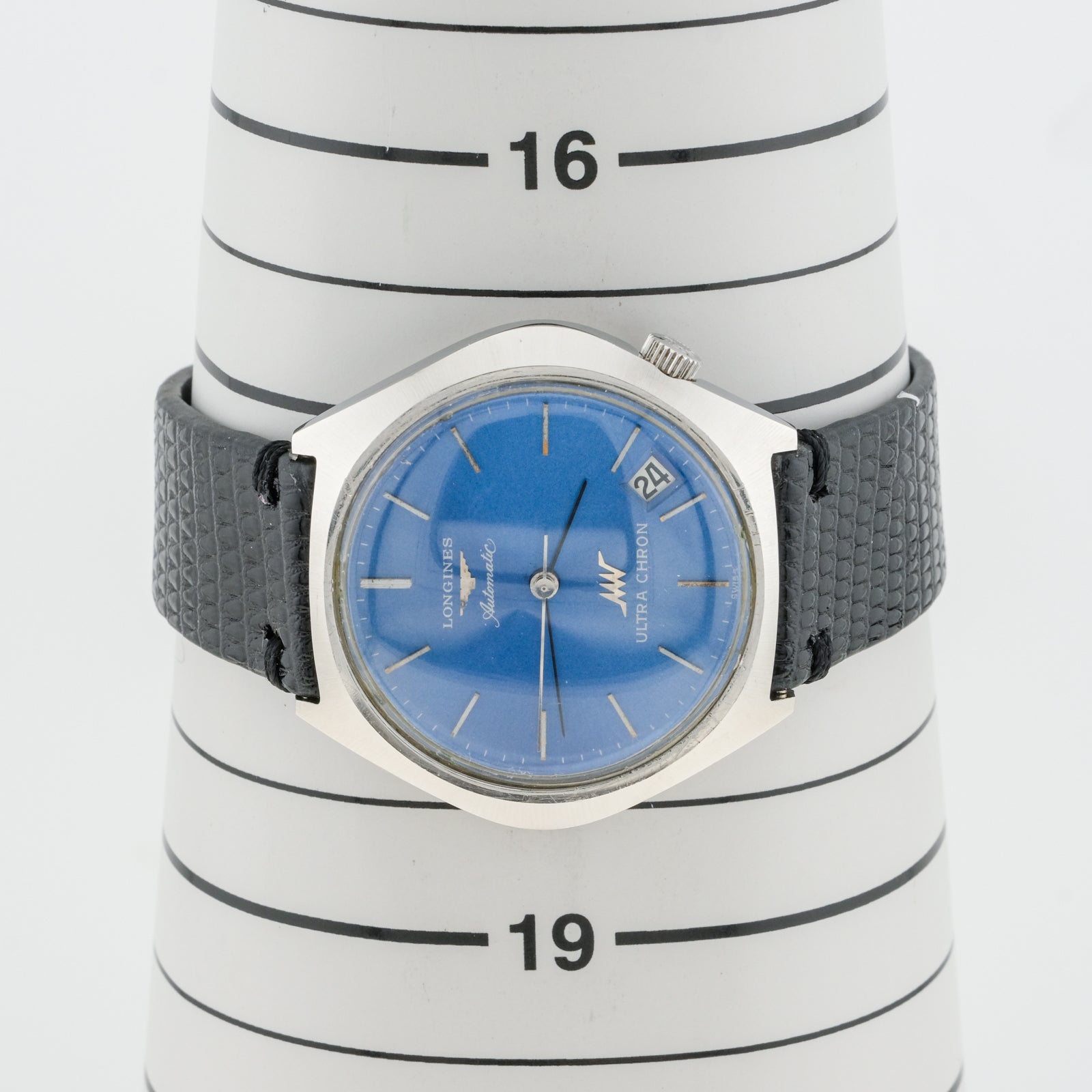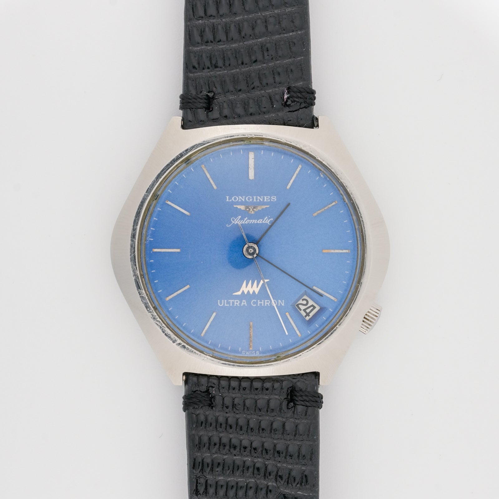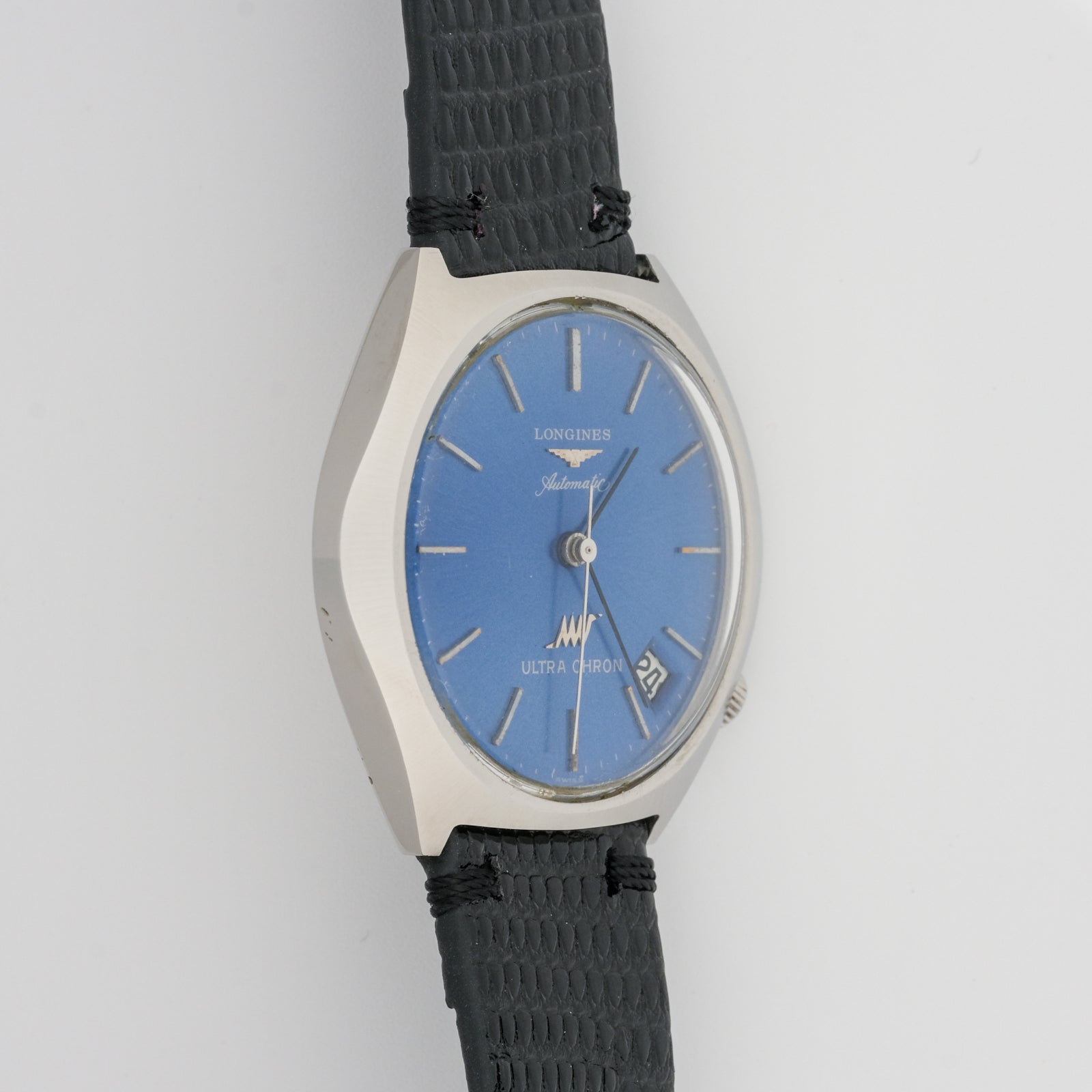 - Dial: features a striking light blue color and is in very good condition for its age. The dial surface shows minimal aging or deterioration, with the original sunburst finish still visible. All hour markers are intact and retain their original finish. The Longines logo, Ultra Chron text, and other dial text are clear and well-preserved. The date window at 3 o'clock is clean and functional. The hands show no significant corrosion or damage.
