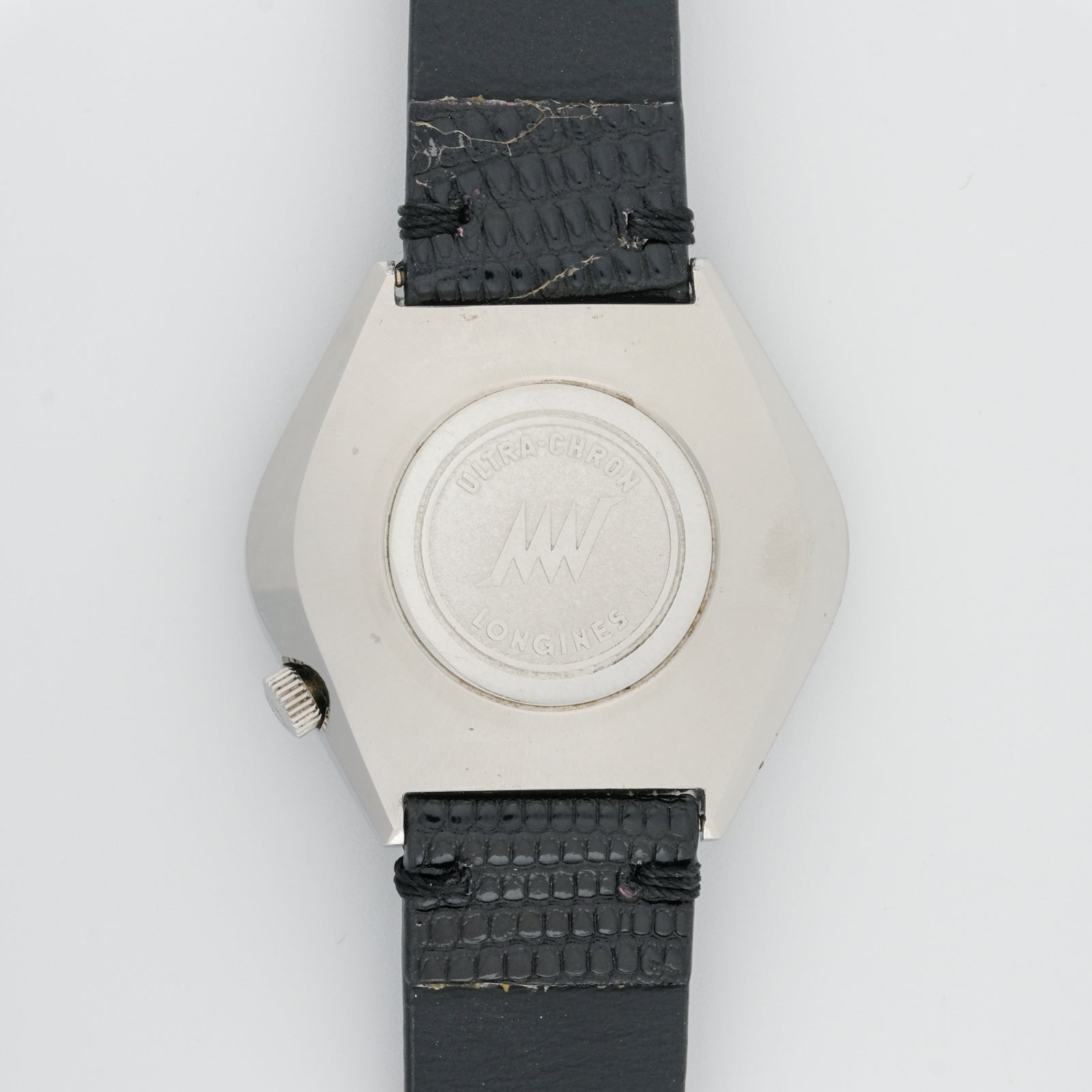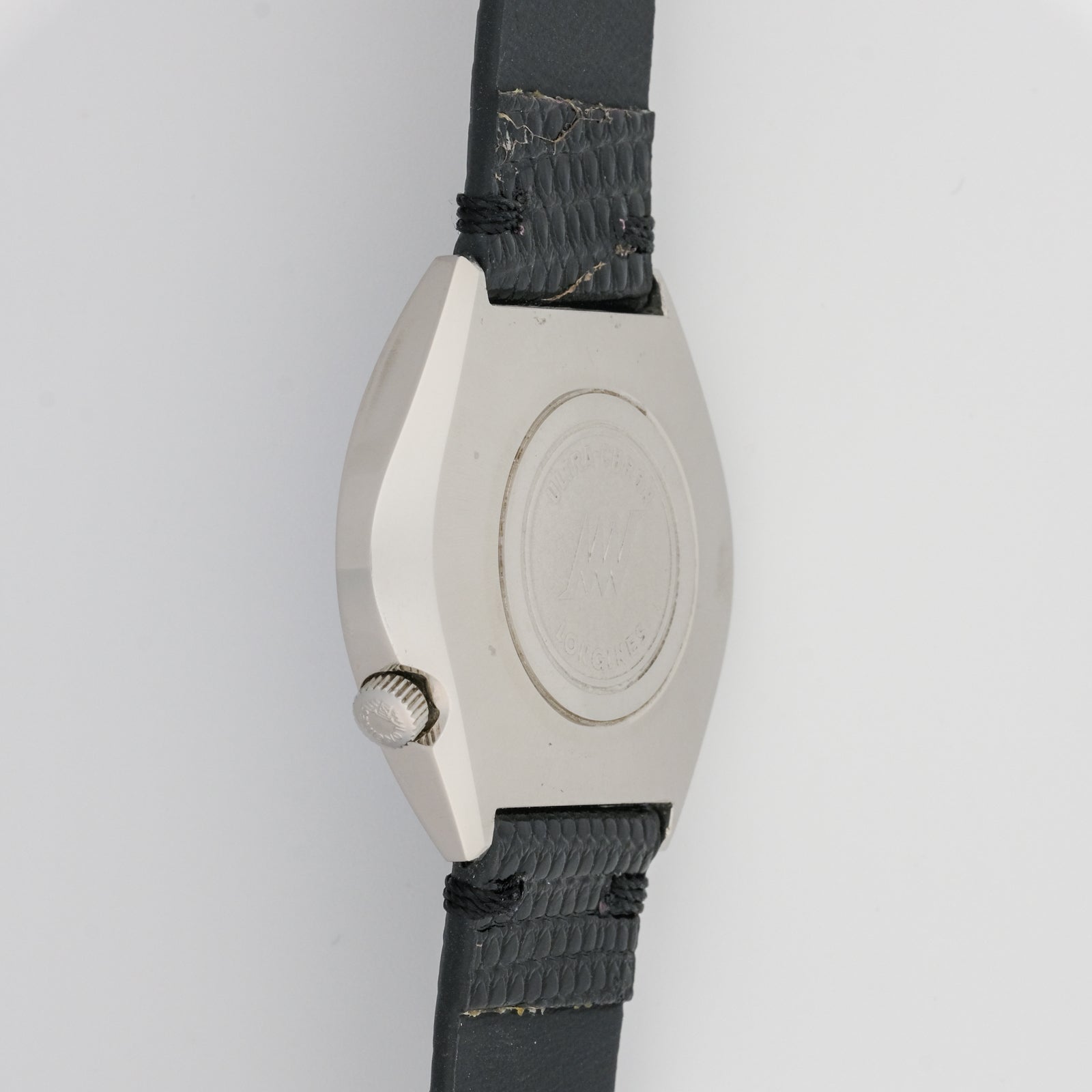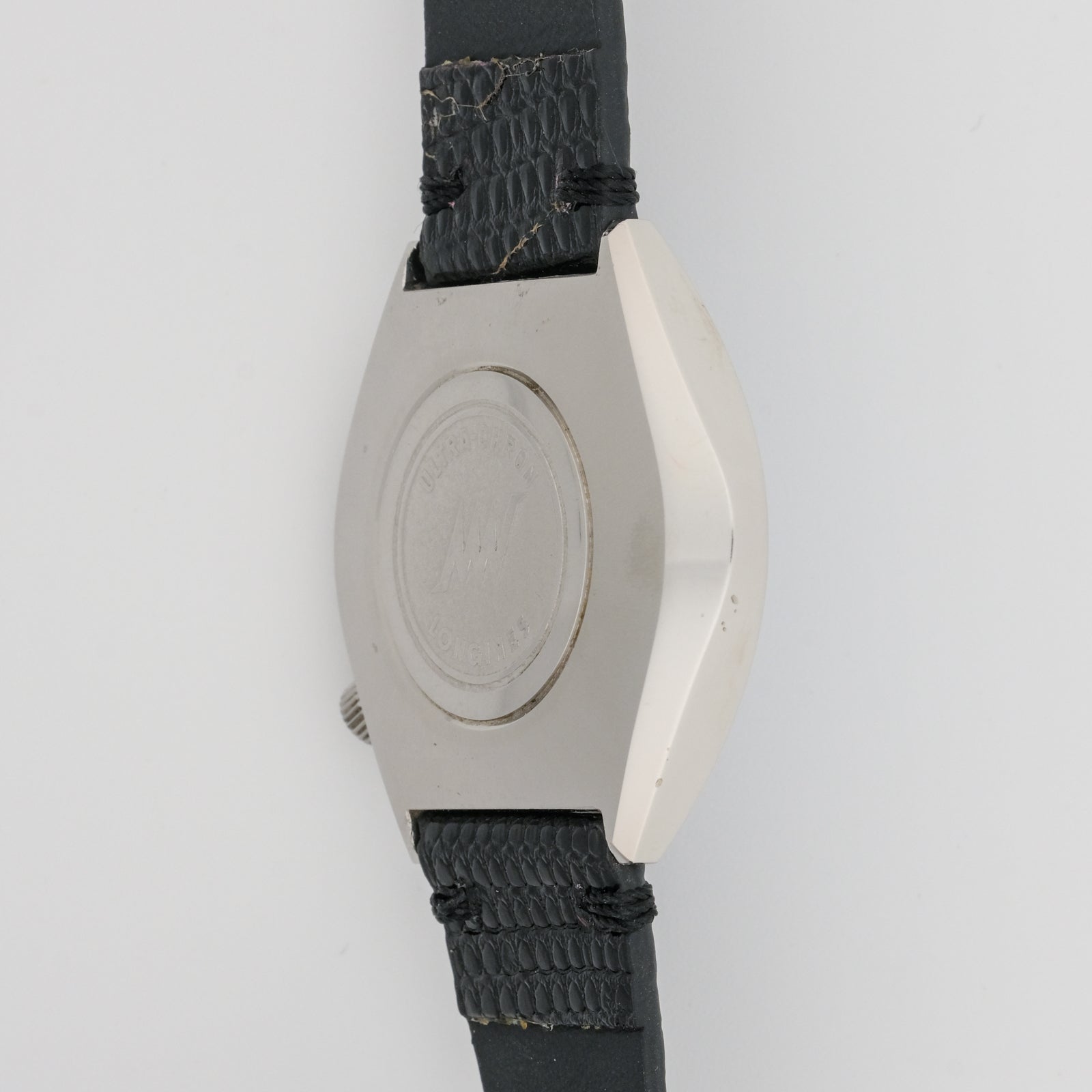 - Case: in good overall condition with some signs of wear. The tonneau-shaped case has a brushed finish that shows minor scratches and aging consistent with regular use. The case edges remain relatively sharp and well-defined. The case back shows clear markings of the Ultra-Chron logo, though there is some visible wear on the case back surface.