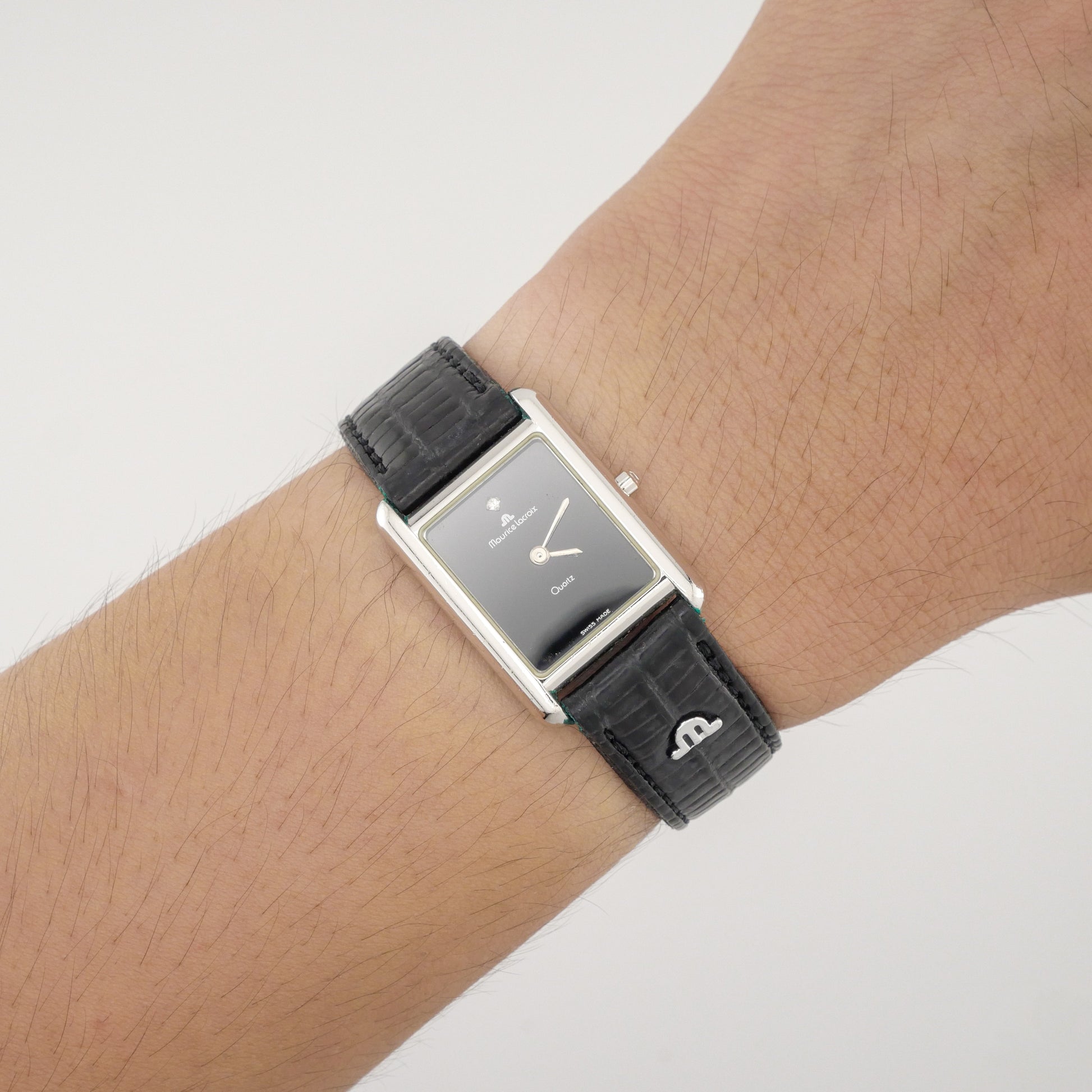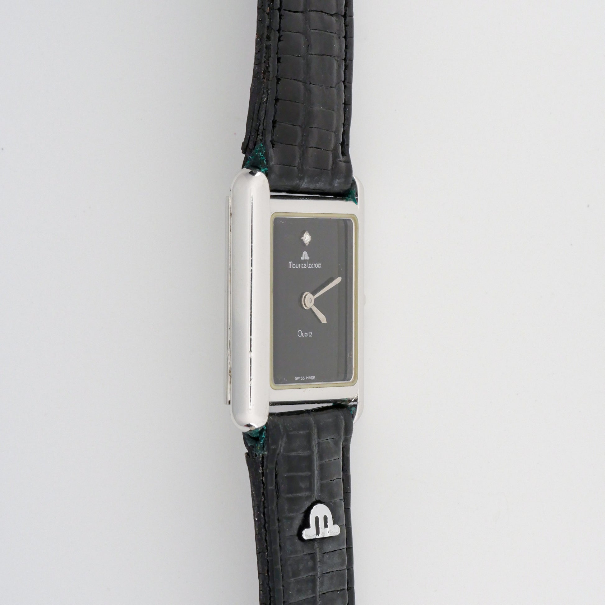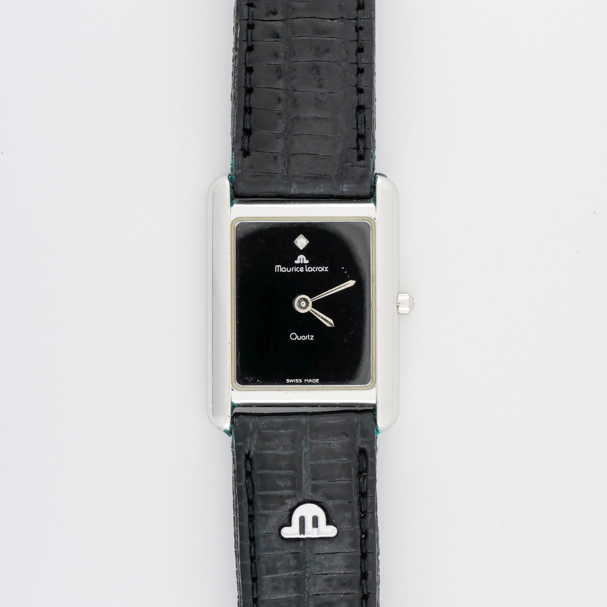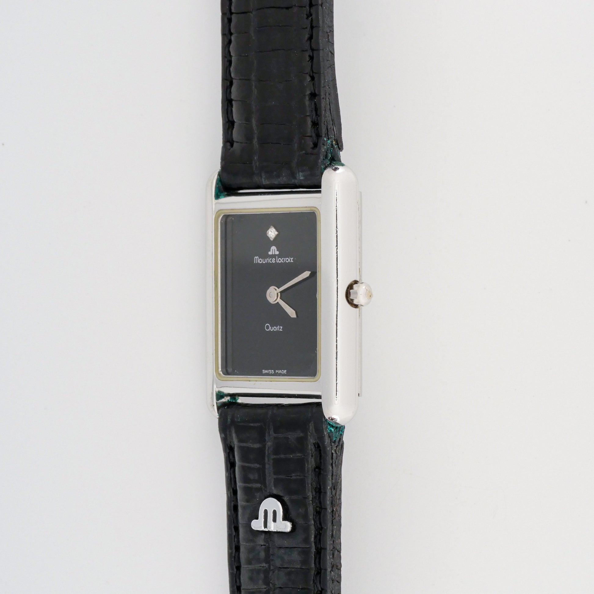 - Dial: is in excellent condition with clean, legible markings throughout. The black dial surface remains pristine with no visible stains or discoloration. The diamond marker at 12 o'clock, Maurice Lacroix signature, and "Quartz" text are all crisp and well-defined. "SWISS MADE" marking at 6 o'clock is clear and intact.