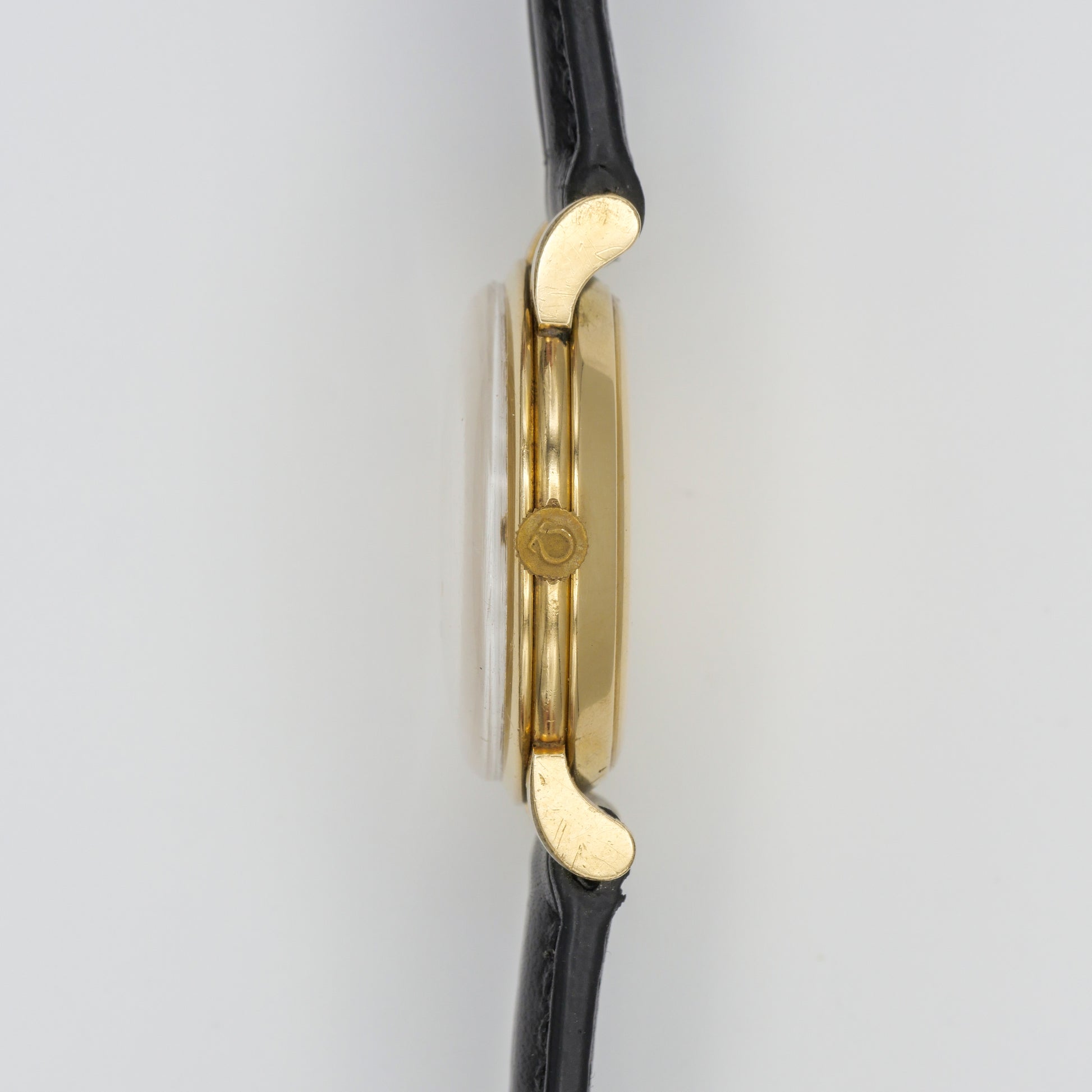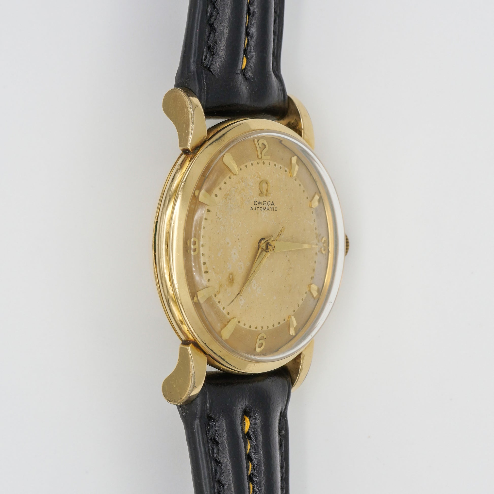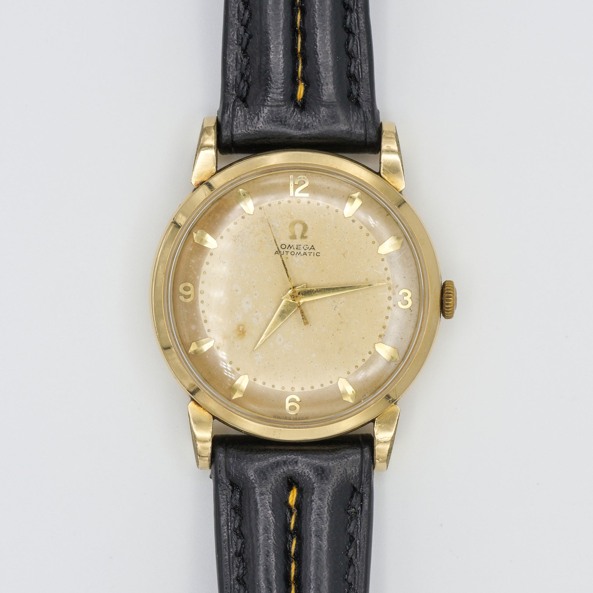 - The vintage Omega automatic watch has a well-worn aesthetic with a gold plated case showing signs of age, patina, and some scuffs, giving it a charming vintage look.