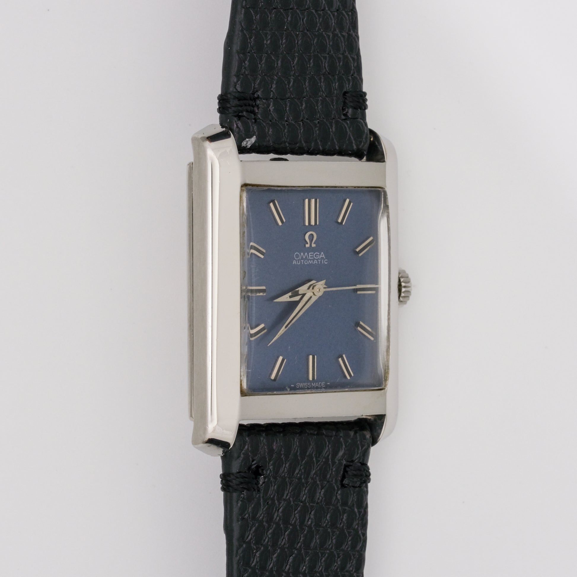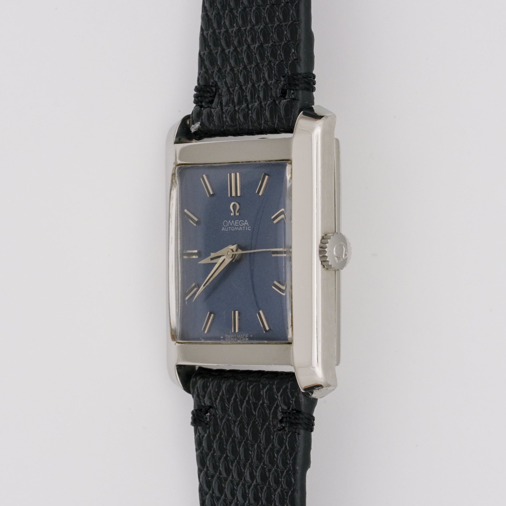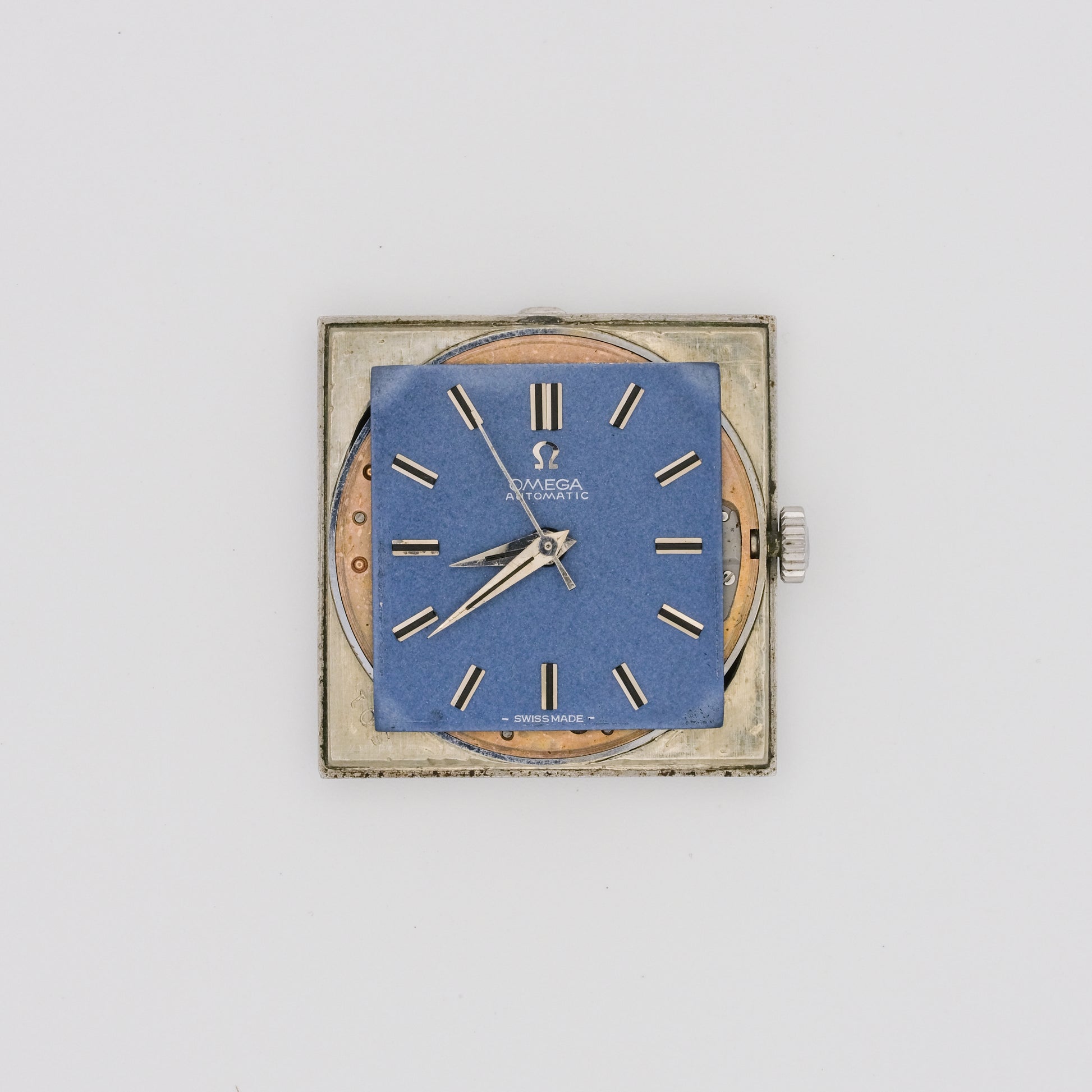 - Dial: has been repainted to an attractive blue color with a subtle sunburst effect and is in very good condition. The hour markers and hands are silver-toned and appear to be in good condition. The Omega logo and text are clear and legible.