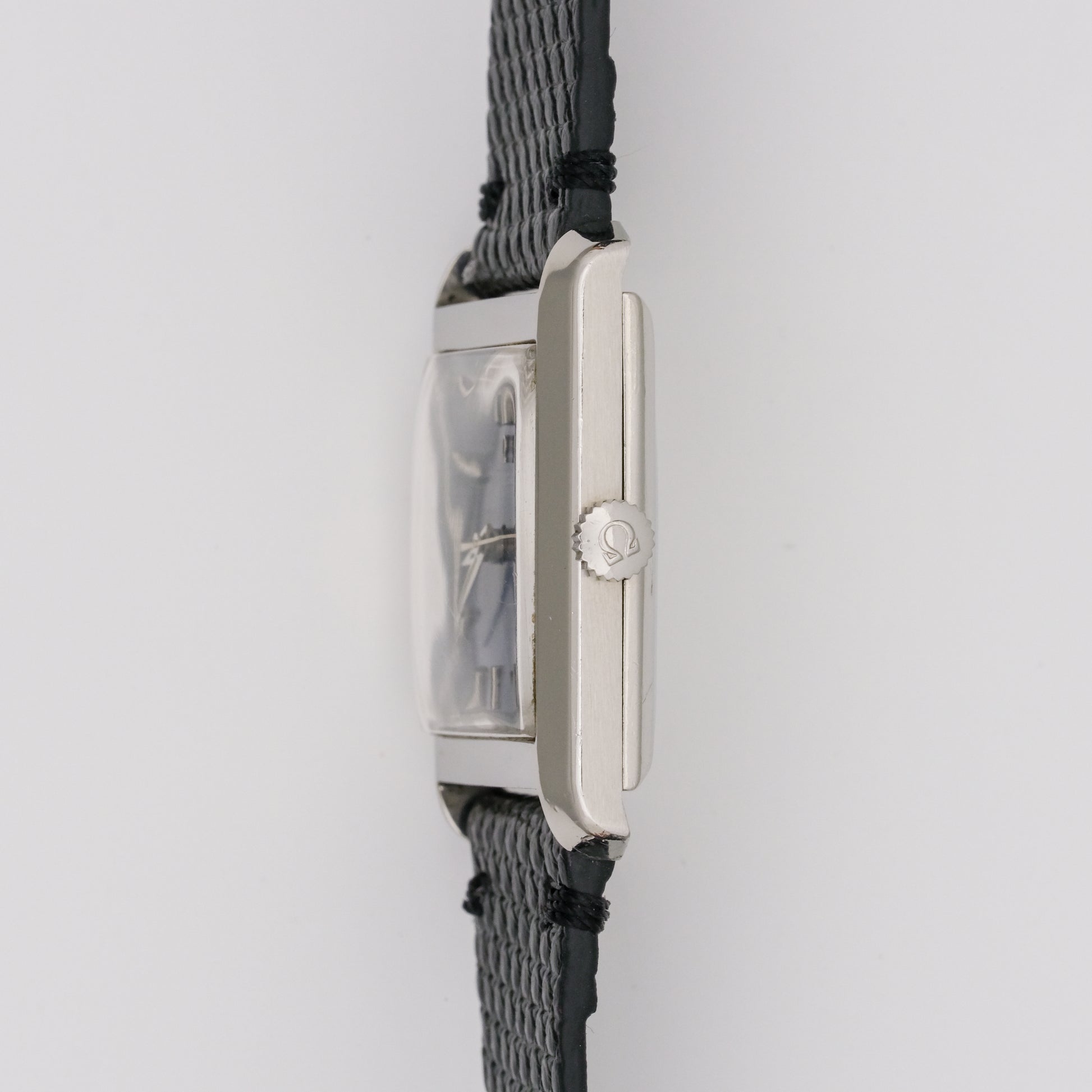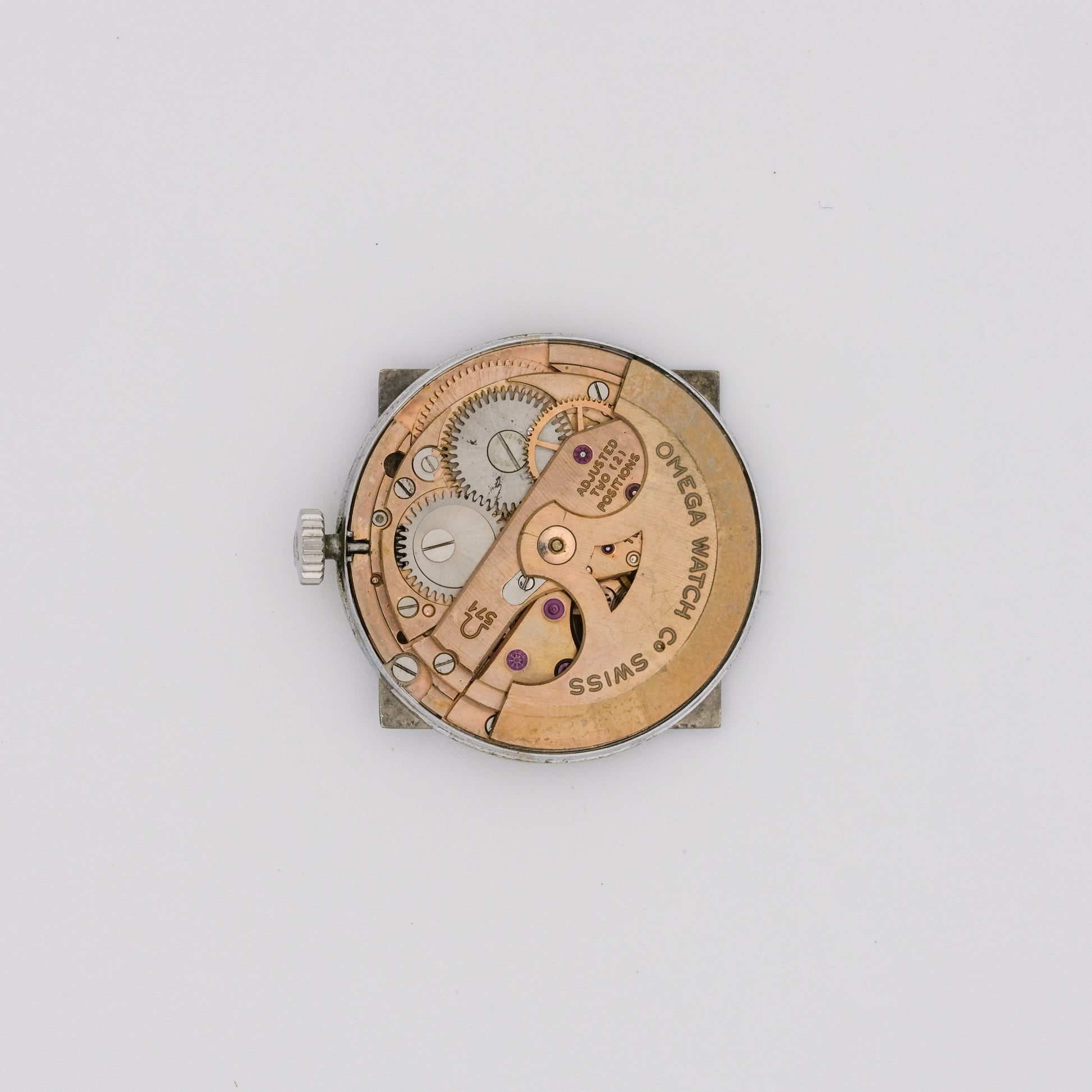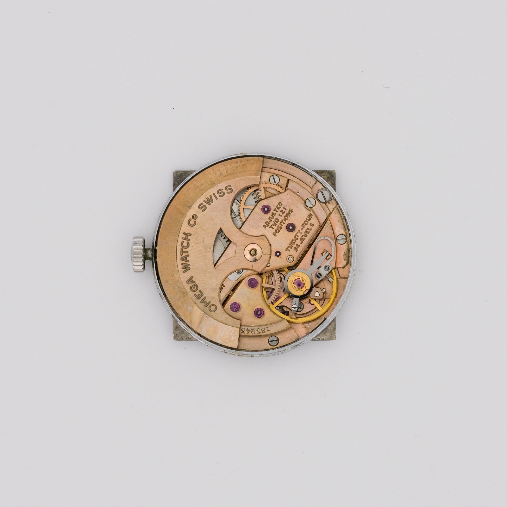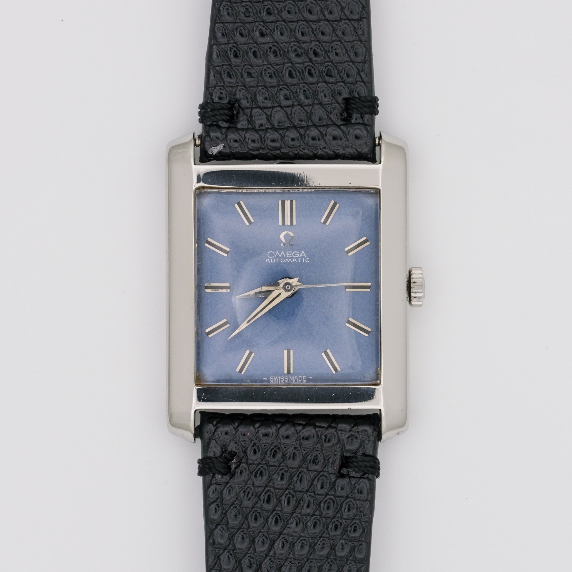 - Dial: has been repainted to an attractive blue color with a subtle sunburst effect and is in very good condition. The hour markers and hands are silver-toned and appear to be in good condition. The Omega logo and text are clear and legible.