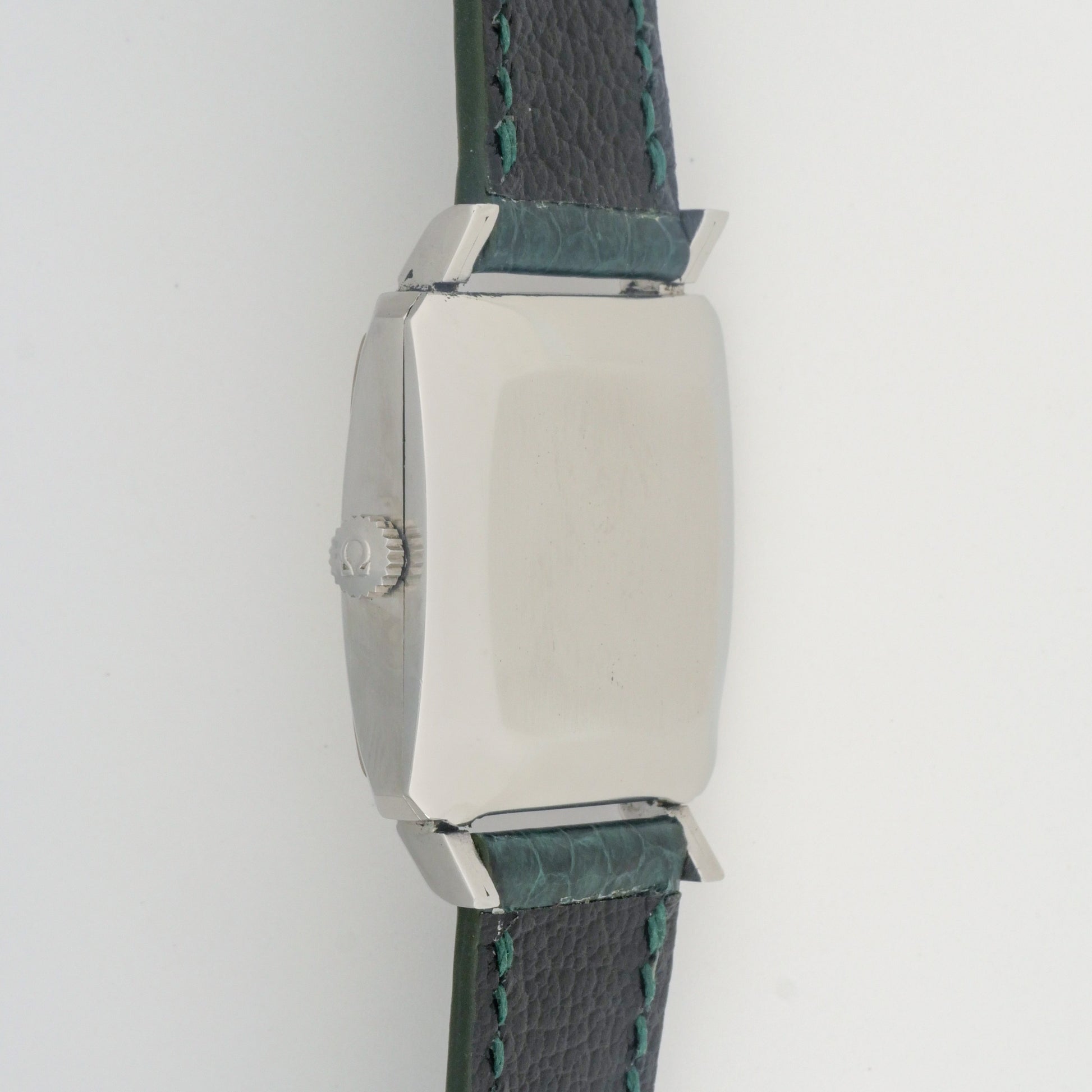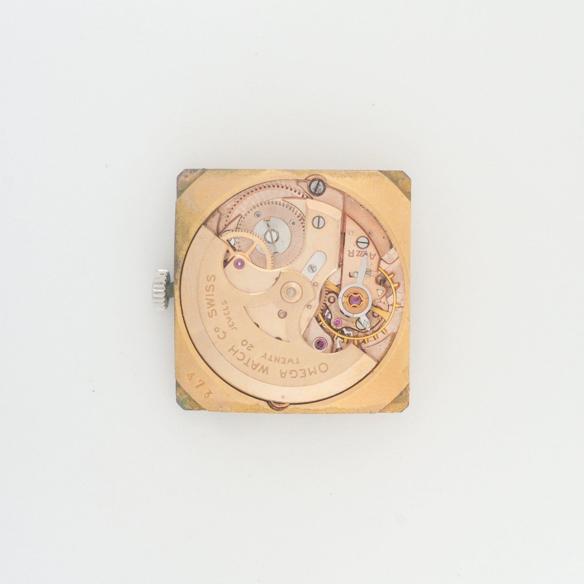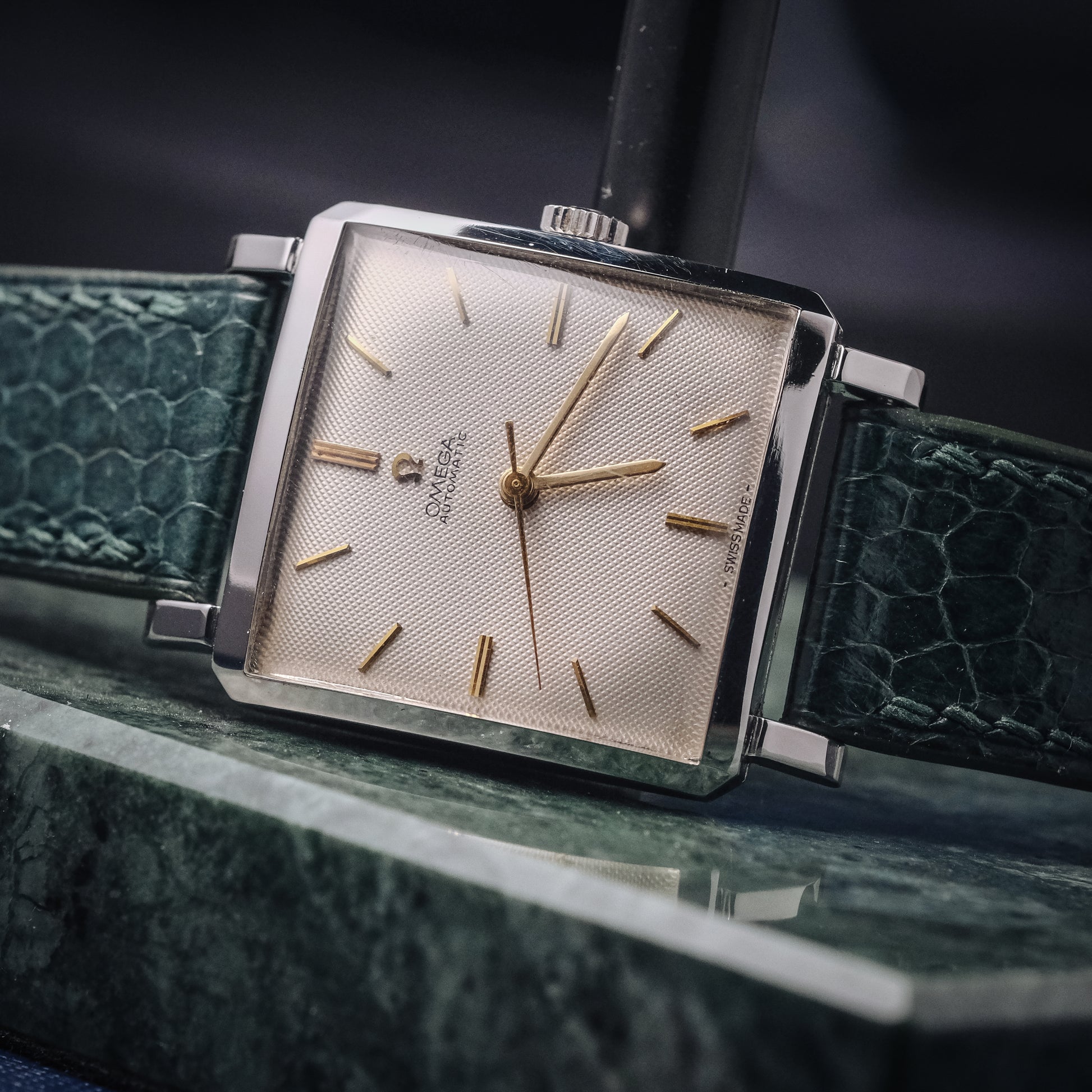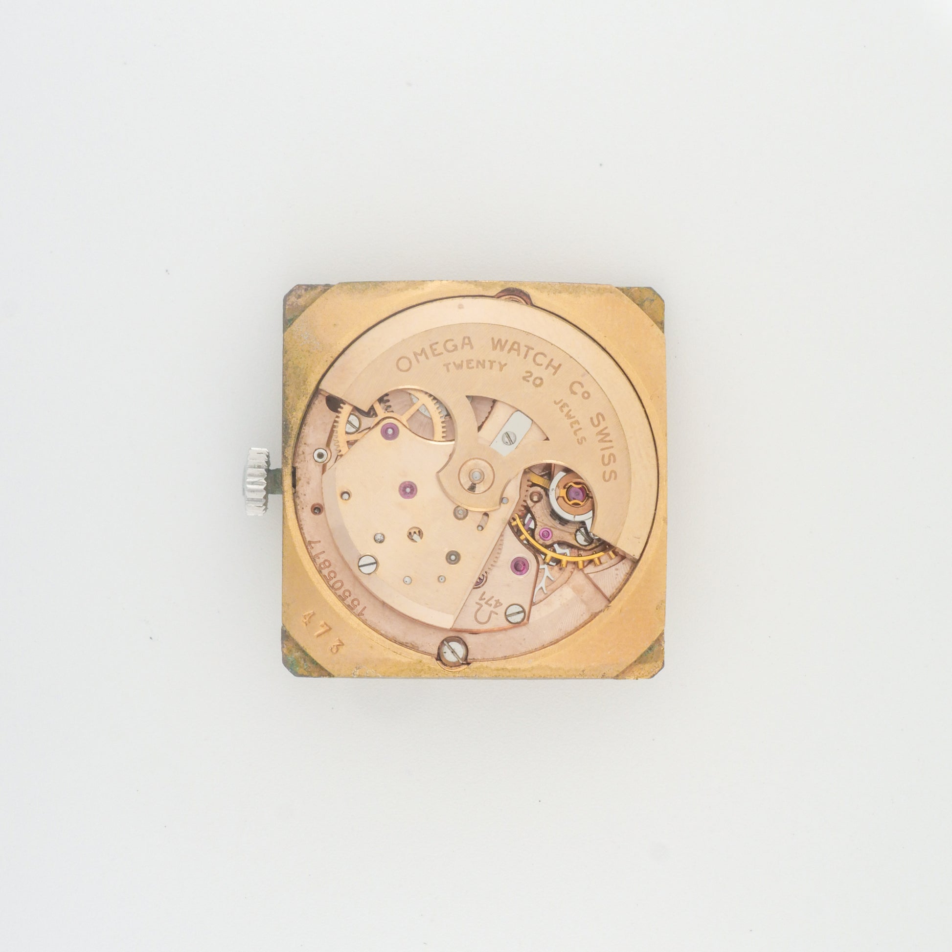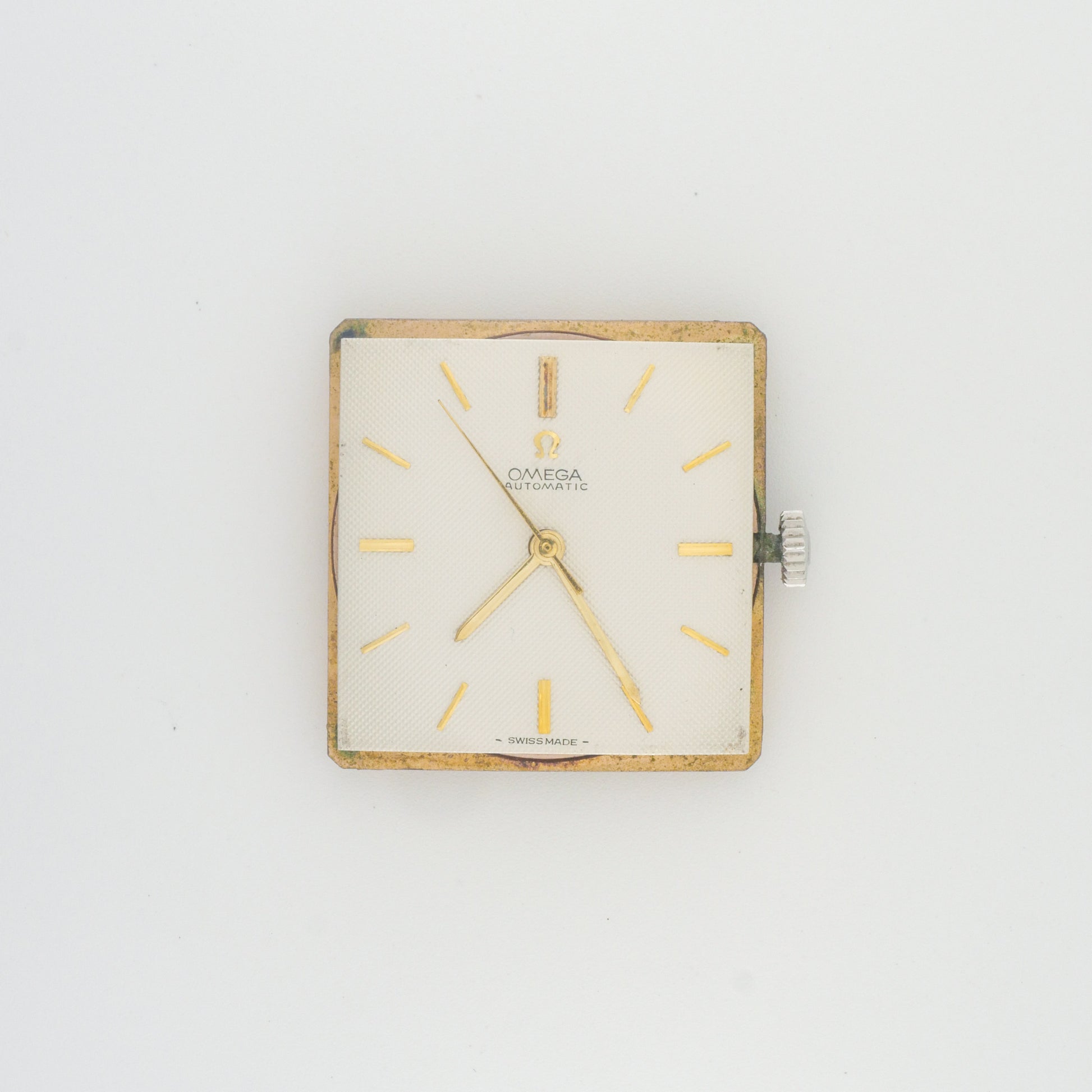 - Case: shows noticeable wear with visible scratches and aging marks on the polished surfaces. Some light scuffs appear on the sides and back of the case. The crown shows signs of use but remains intact with the Omega logo visible.
