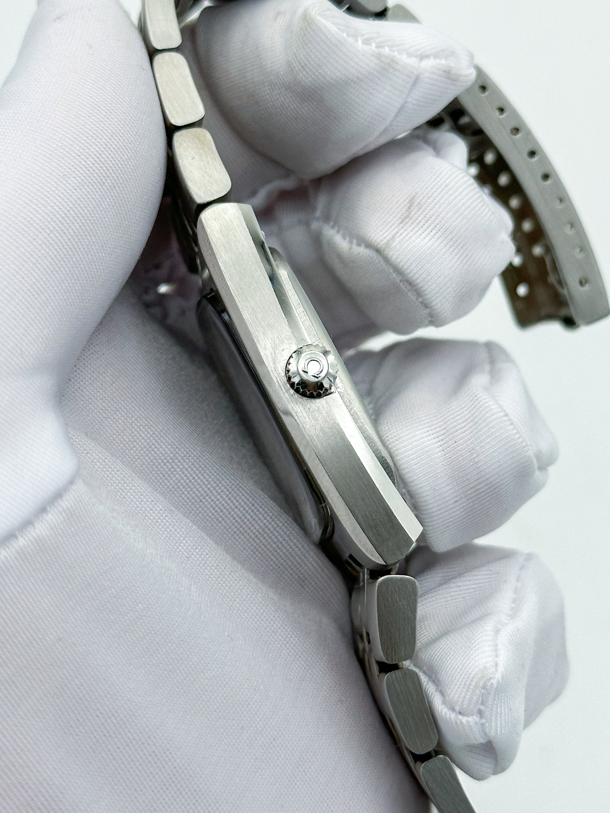 Points of Mention: Slight scratches overall on the case and bracelet. Hairline surface scratches the glass. The original dial in dark green has became "Spider's Web" form.