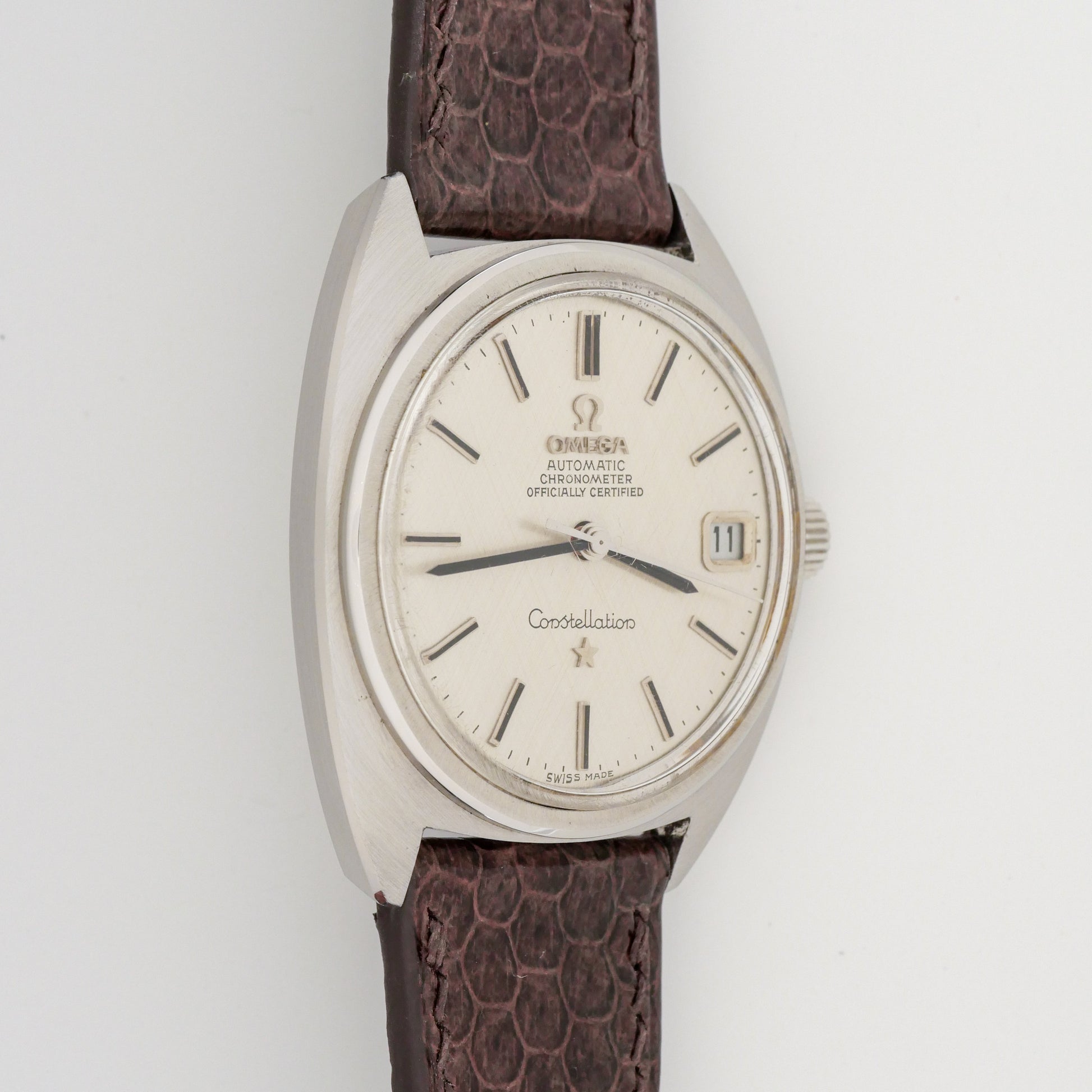 - Dial: has been refinished and is in good condition with clean, legible hour markers and text. The hands are original and properly aligned. There's minimal aging or discoloration visible, and the date window displays clearly at 3 o'clock. The Constellation star logo remains distinct.