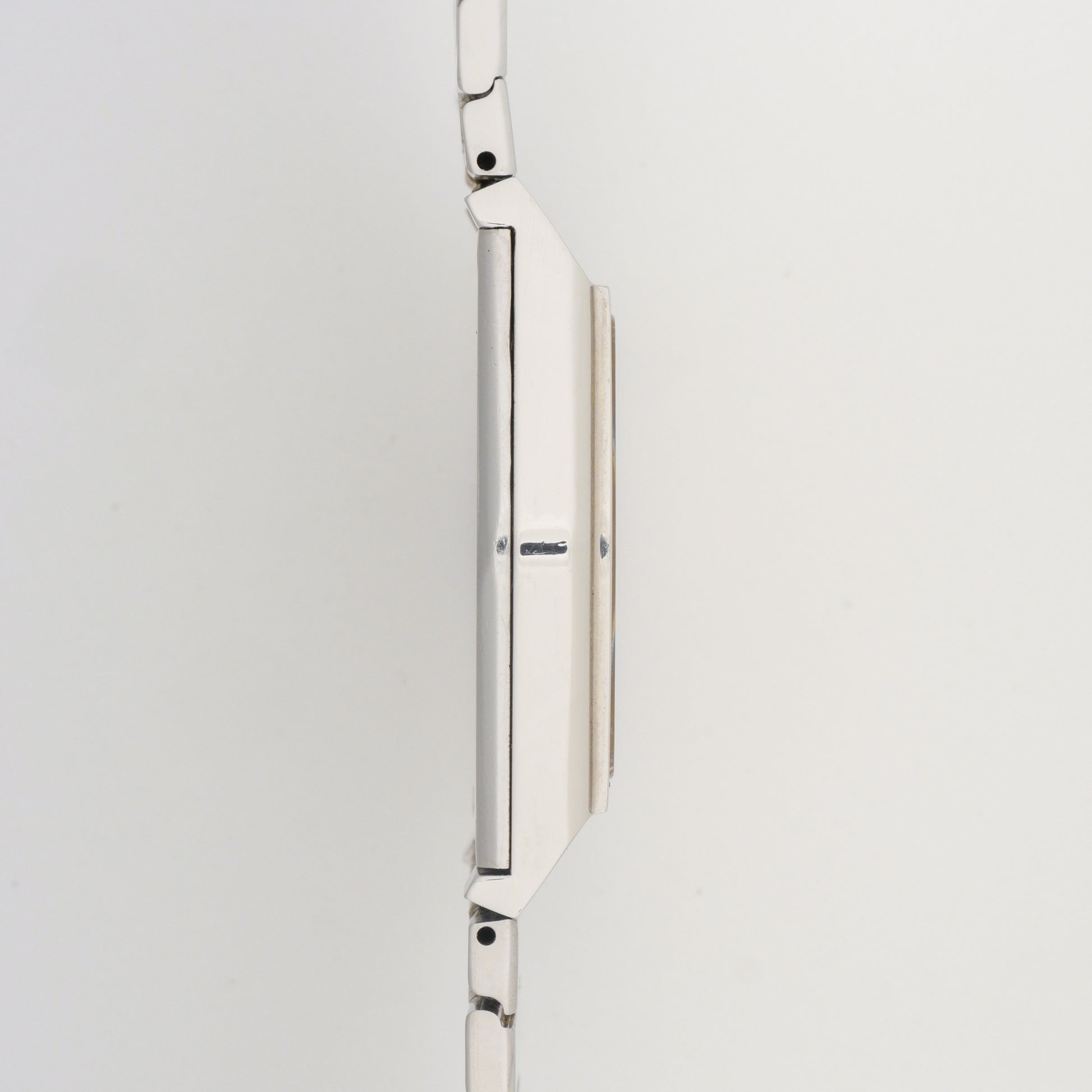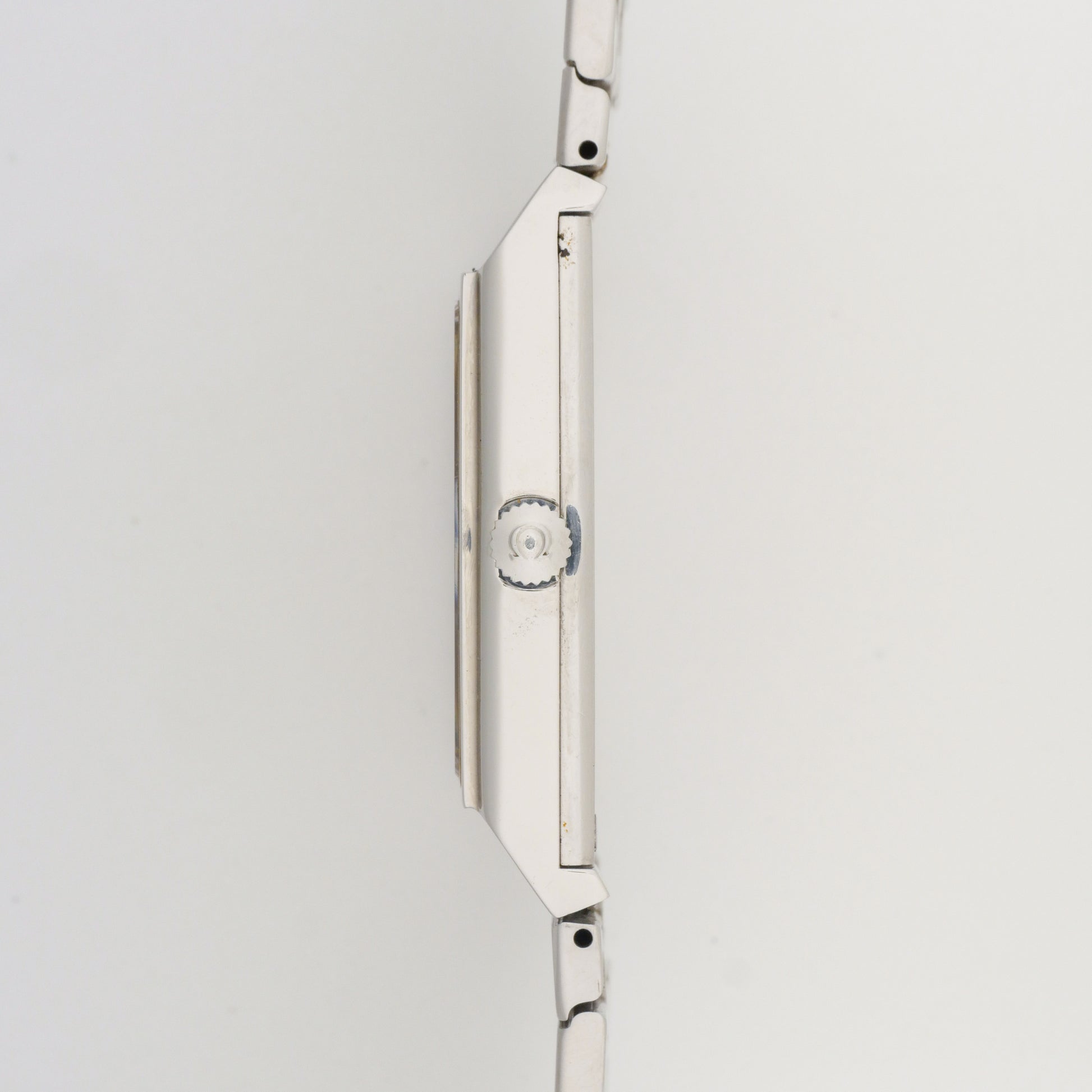 - Case: shows moderate wear consistent with regular use. There are visible scratches and scuffs on the case surfaces, particularly noticeable on the sides and edges. The integrated bracelet displays significant wear with scratches throughout the links and some areas showing more pronounced marking. The case back retains its shape well but shows surface scratches from normal wear.