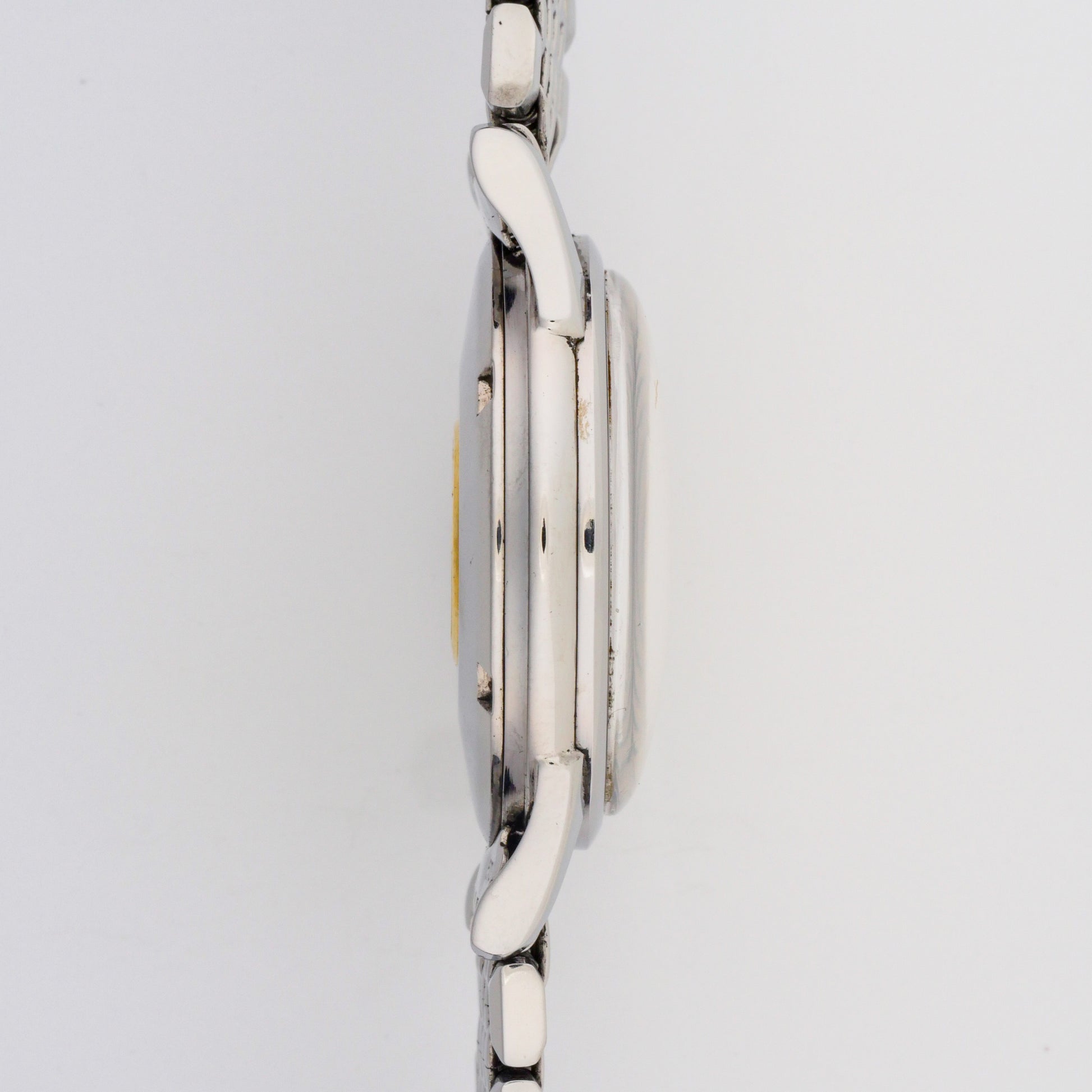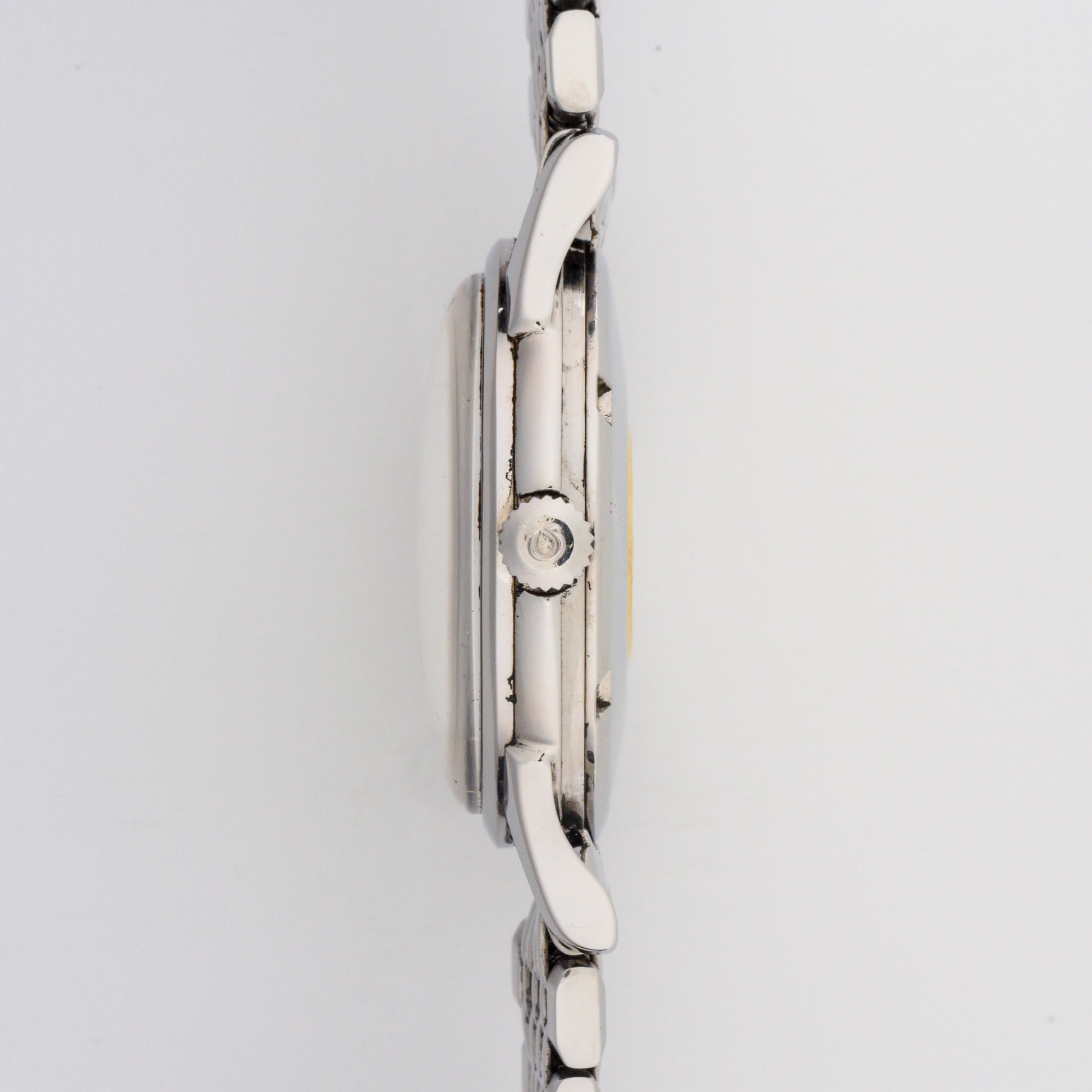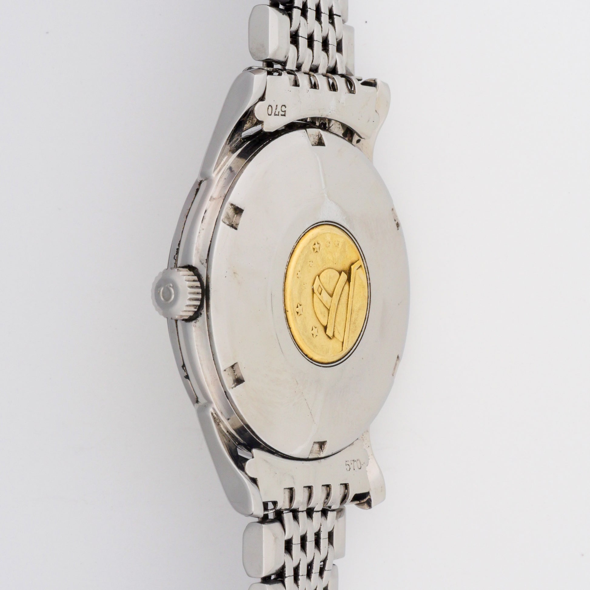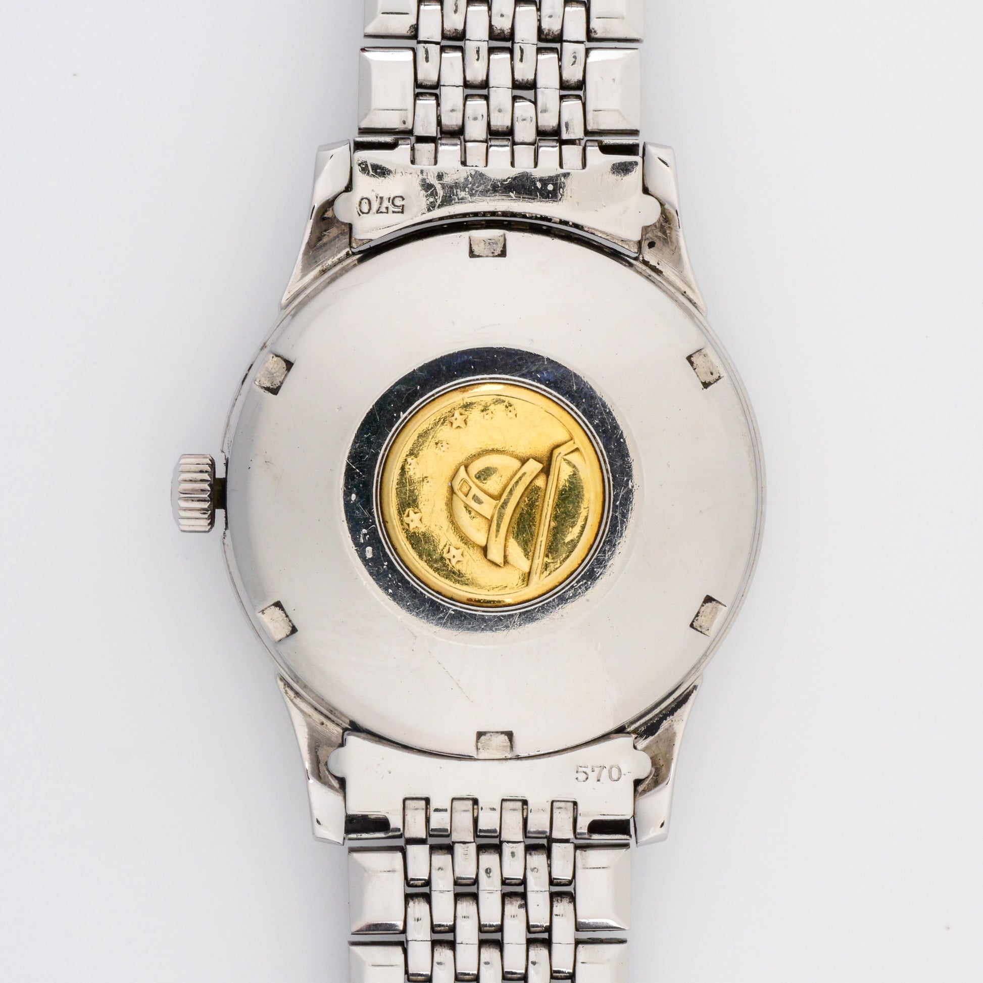 - Case: shows light to moderate wear consistent with age and use. The edges and lugs display some minor scratches and signs of polishing, but maintain their original shape and definition. The caseback features a gold medallion emblem that remains well-preserved despite some patina.