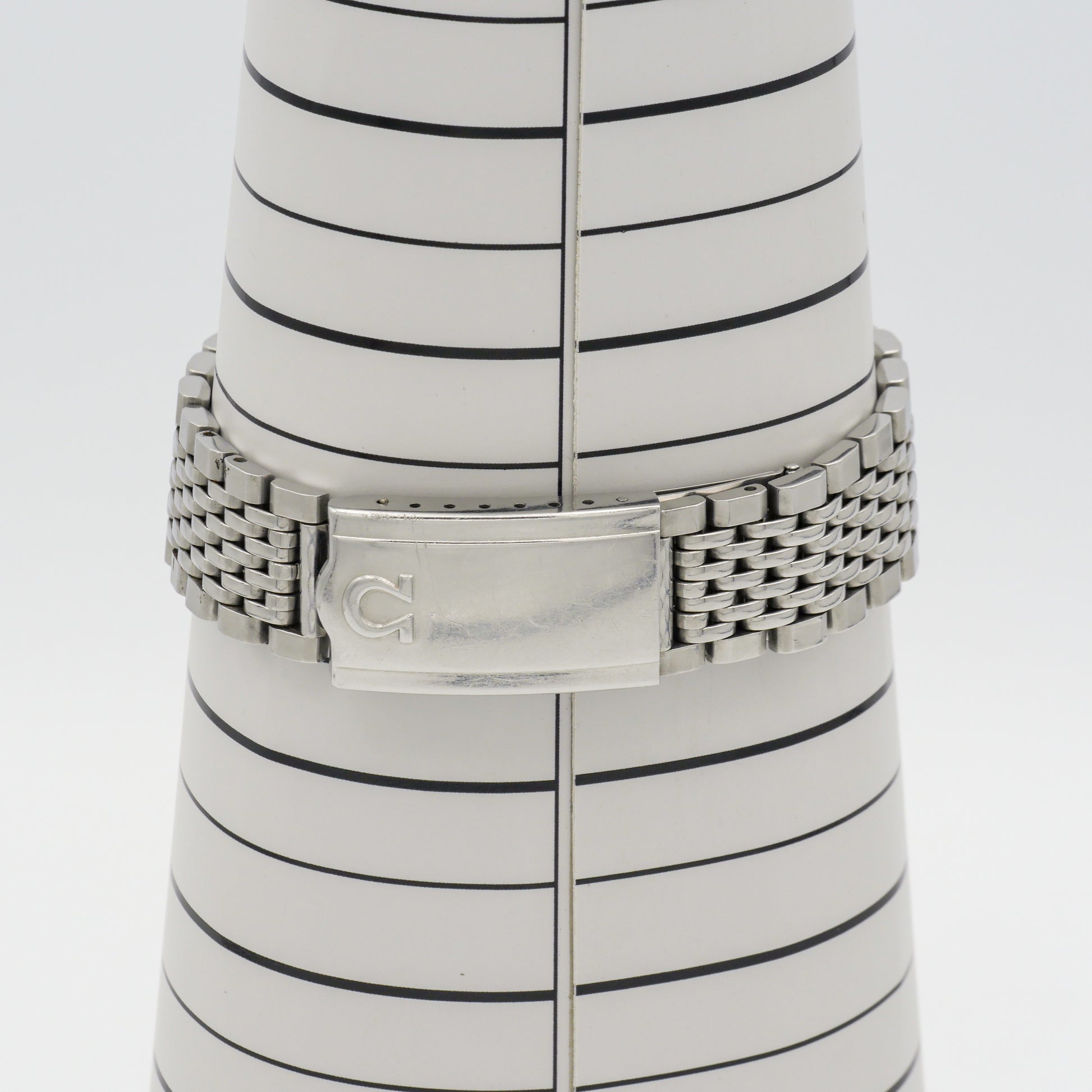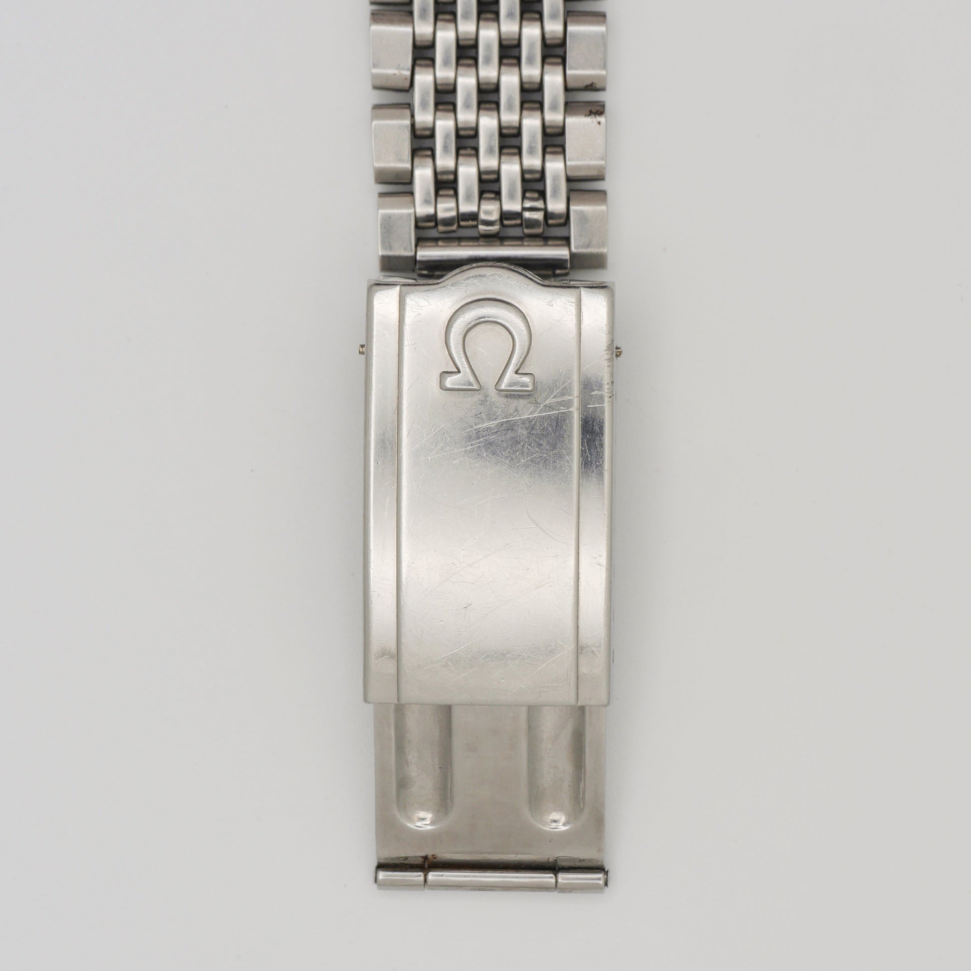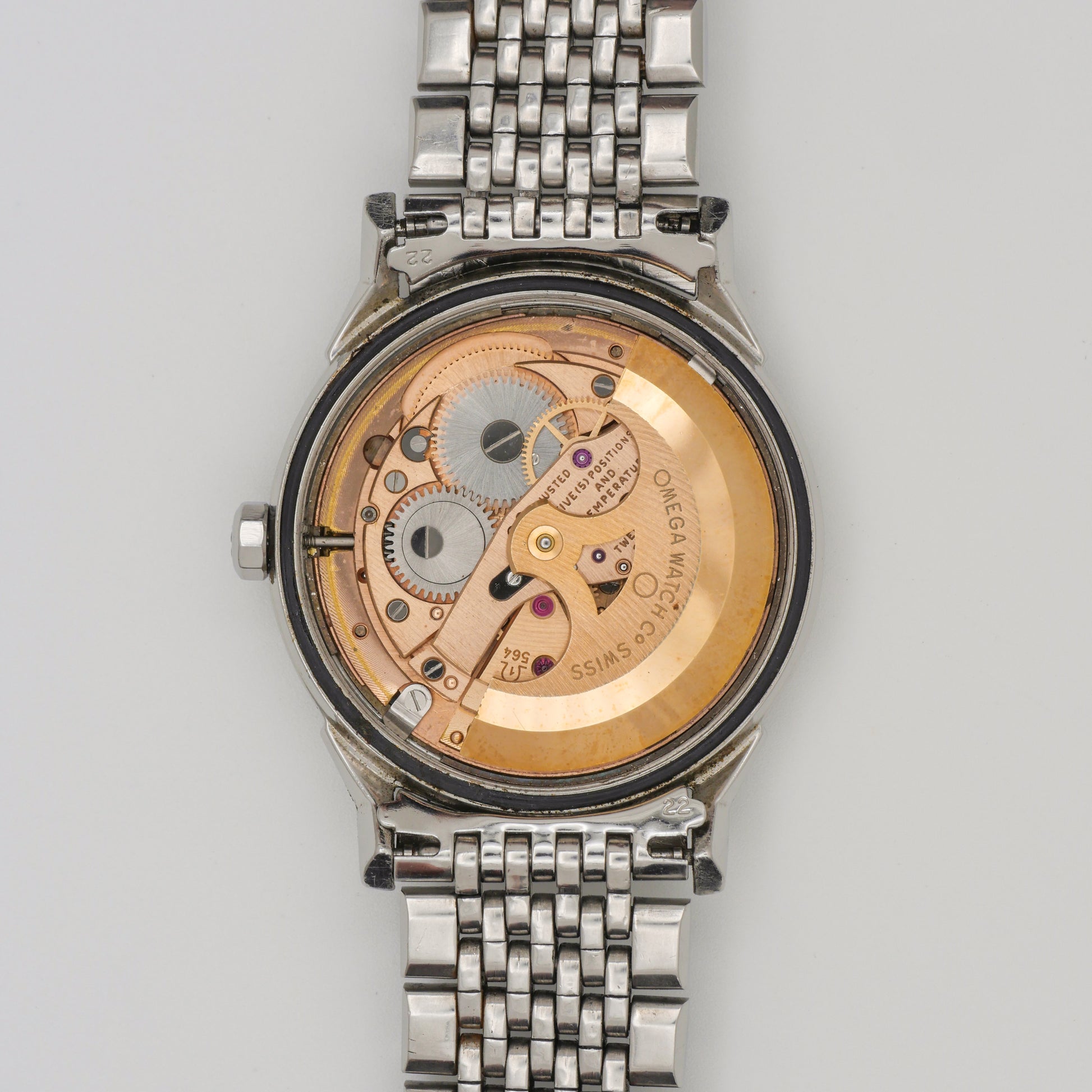 - Dial: shows significant patina, giving it a warm, aged champagne color. This patina is relatively even across the dial, creating an attractive vintage aesthetic. The hour markers and Omega logo are intact and legible. The date window at 3 o'clock is clear.