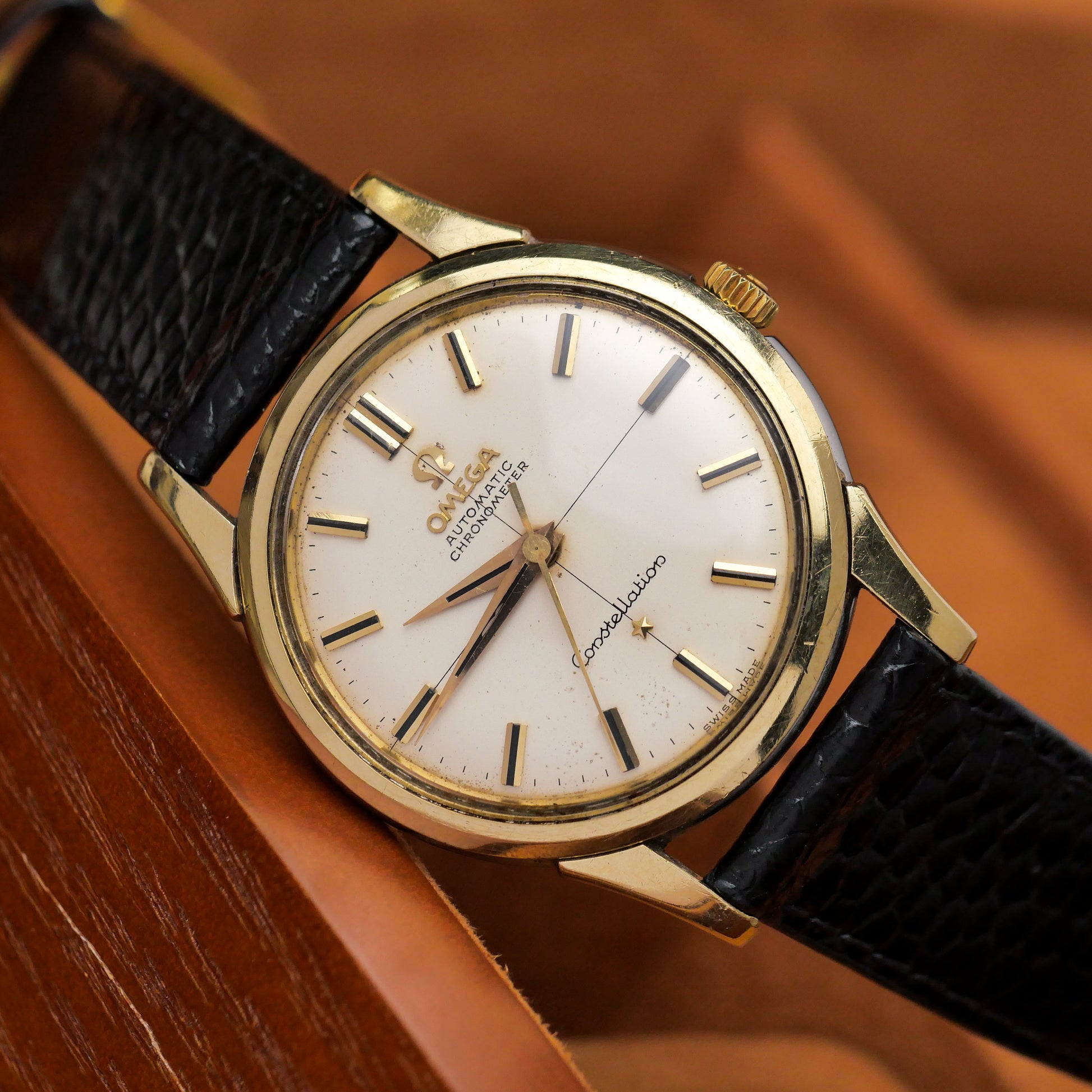 - The Omega Constellation's case shows signs of wear and aging, with some scratches and patina visible on the gold-toned surfaces.