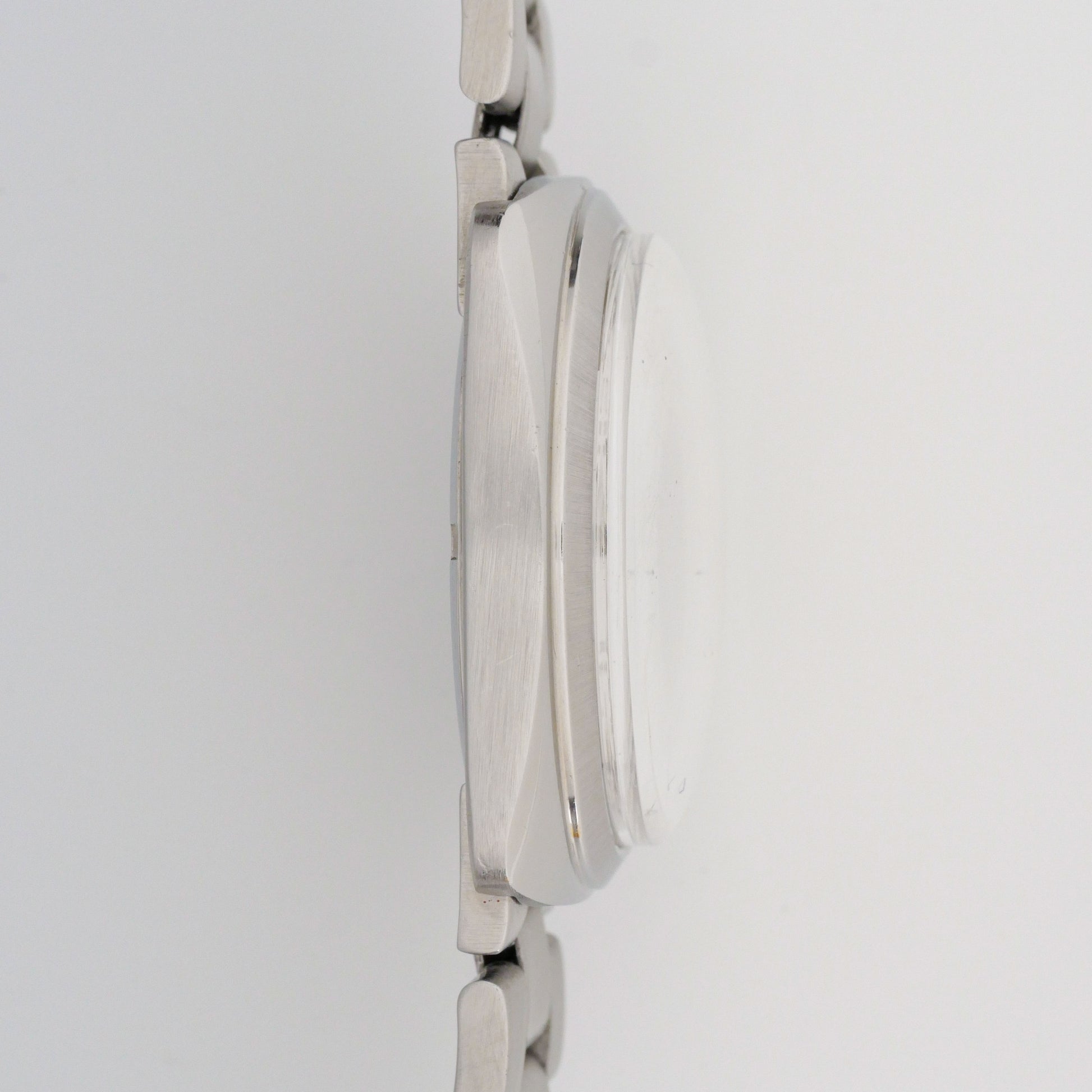 - Case: show moderate wear consistent with age, visible scratches and scuffs across the brushed surfaces, particularly on the case back and lugs. The original brushed finish has been dulled in areas. No deep dents or structural damage observed.
