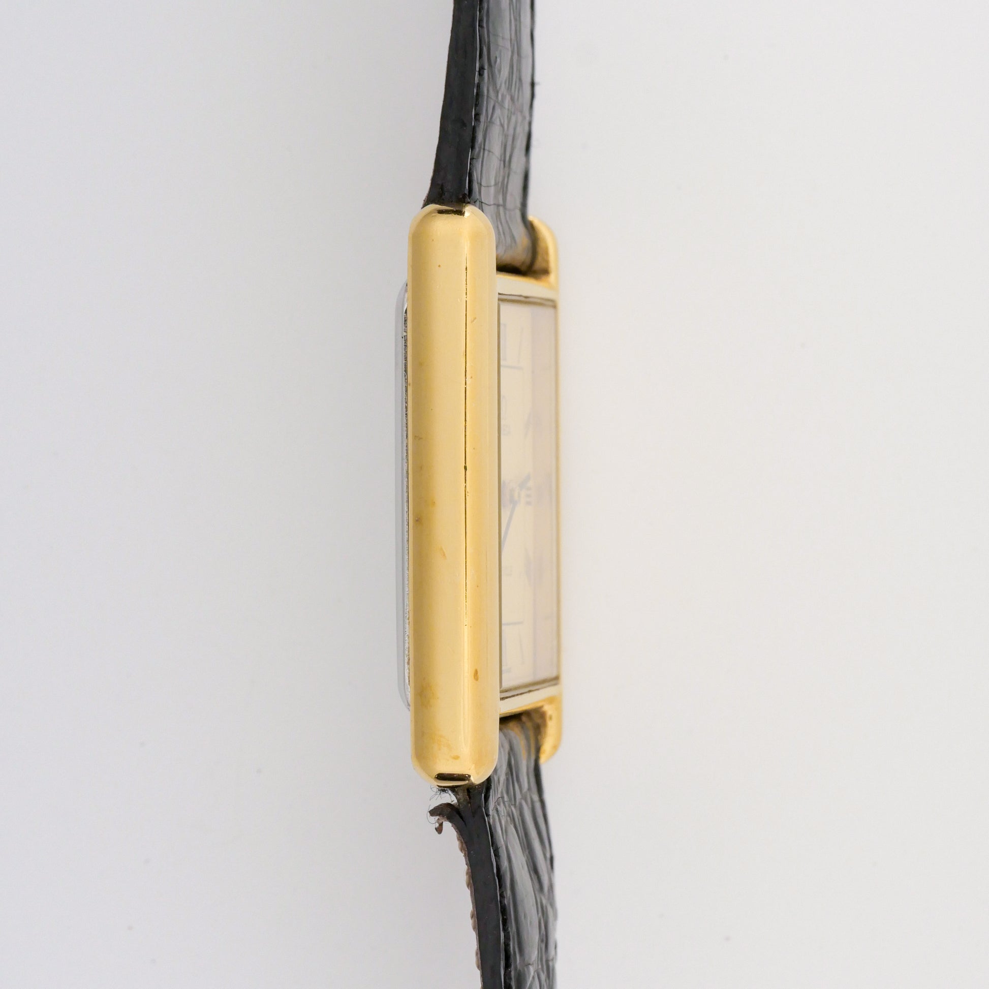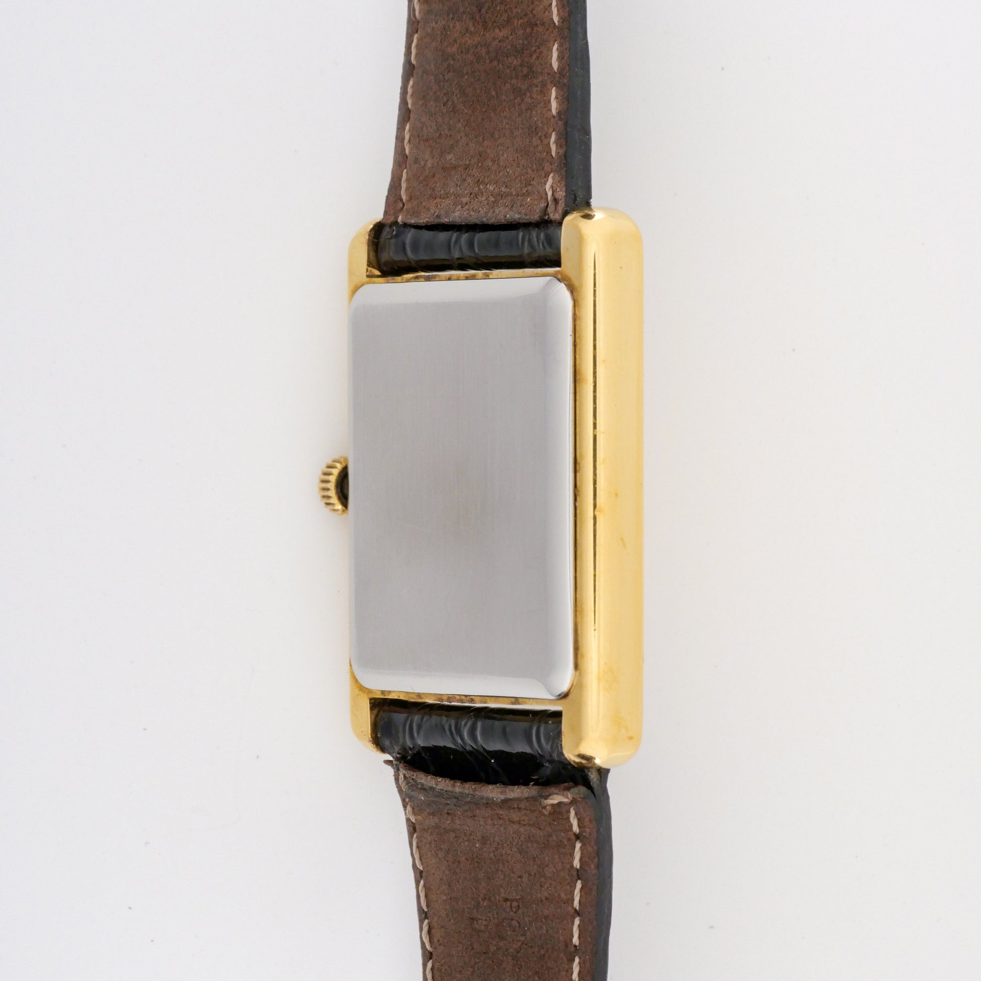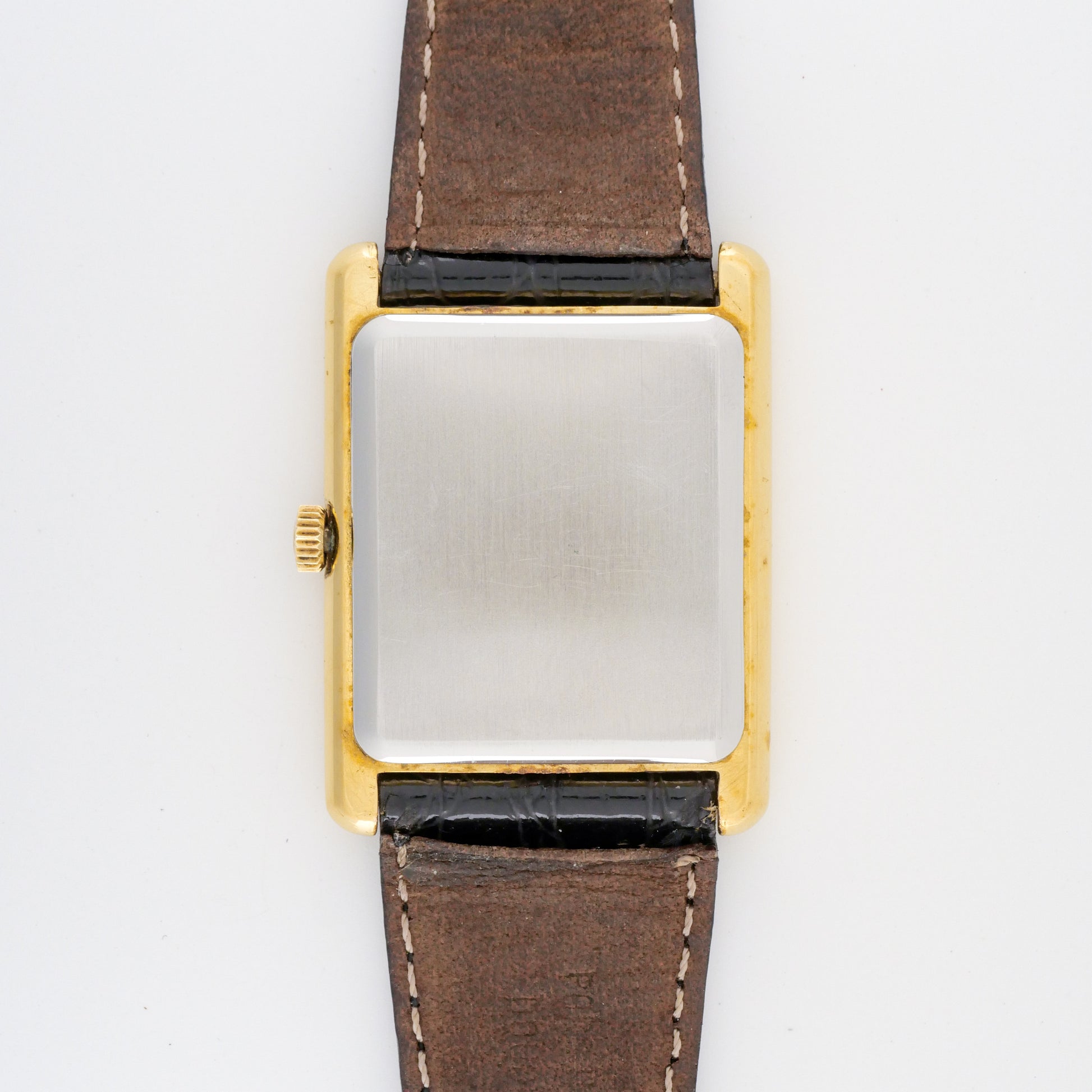 - Case: shows moderate wear consistent with regular use. There are visible scratches and scuffs on the surfaces, particularly noticeable on the sides and lugs. The gold plating has some wear spots but maintains its overall integrity without significant loss of material.