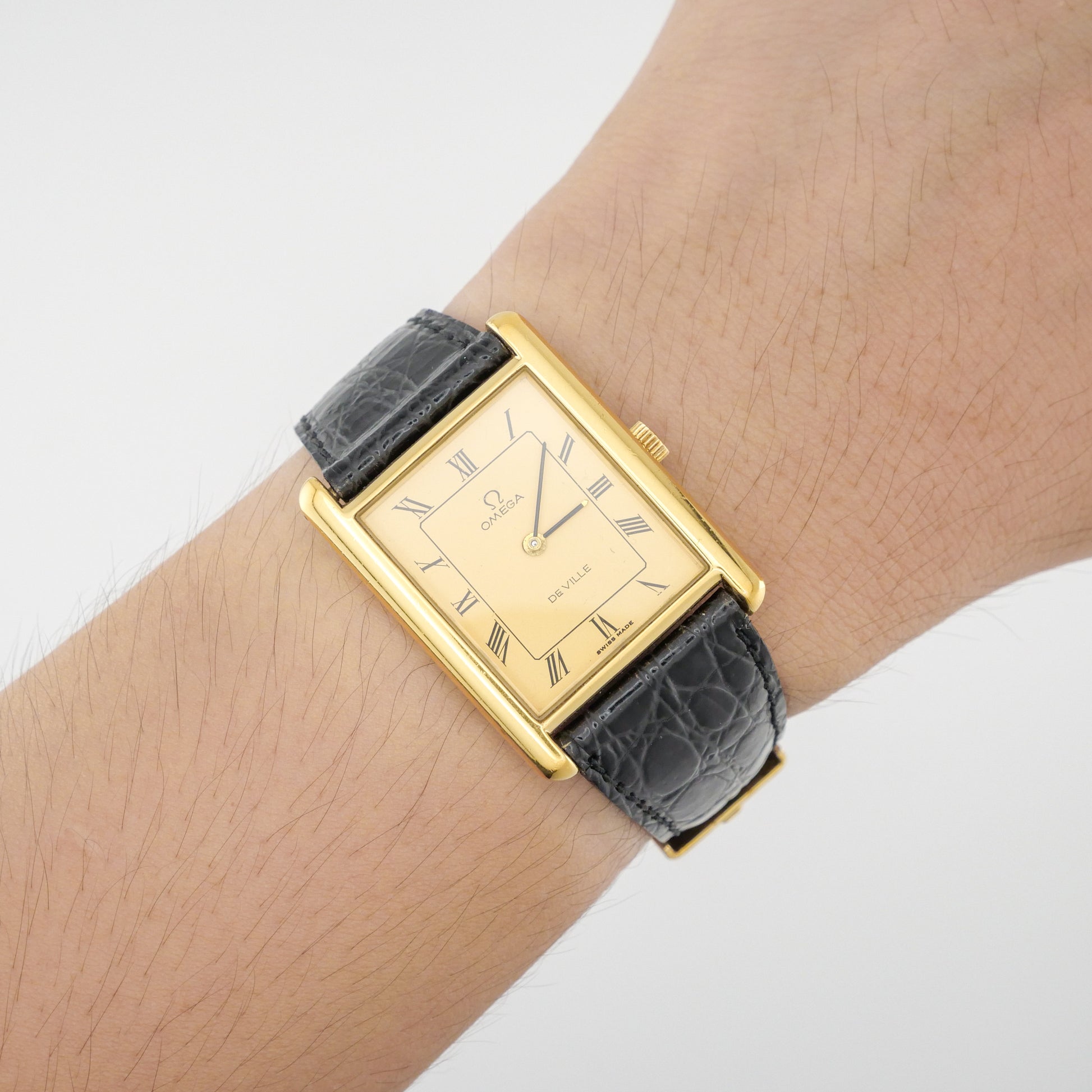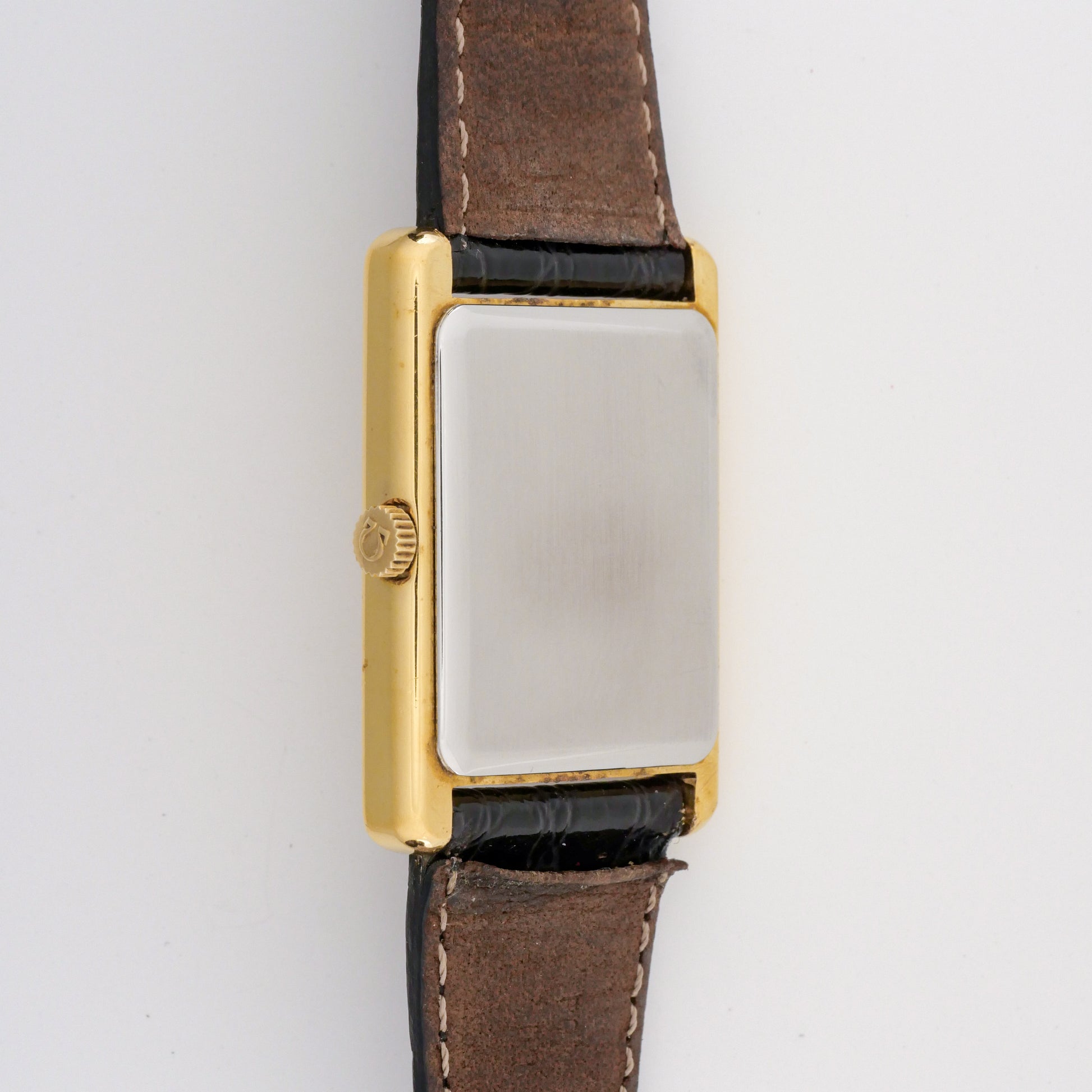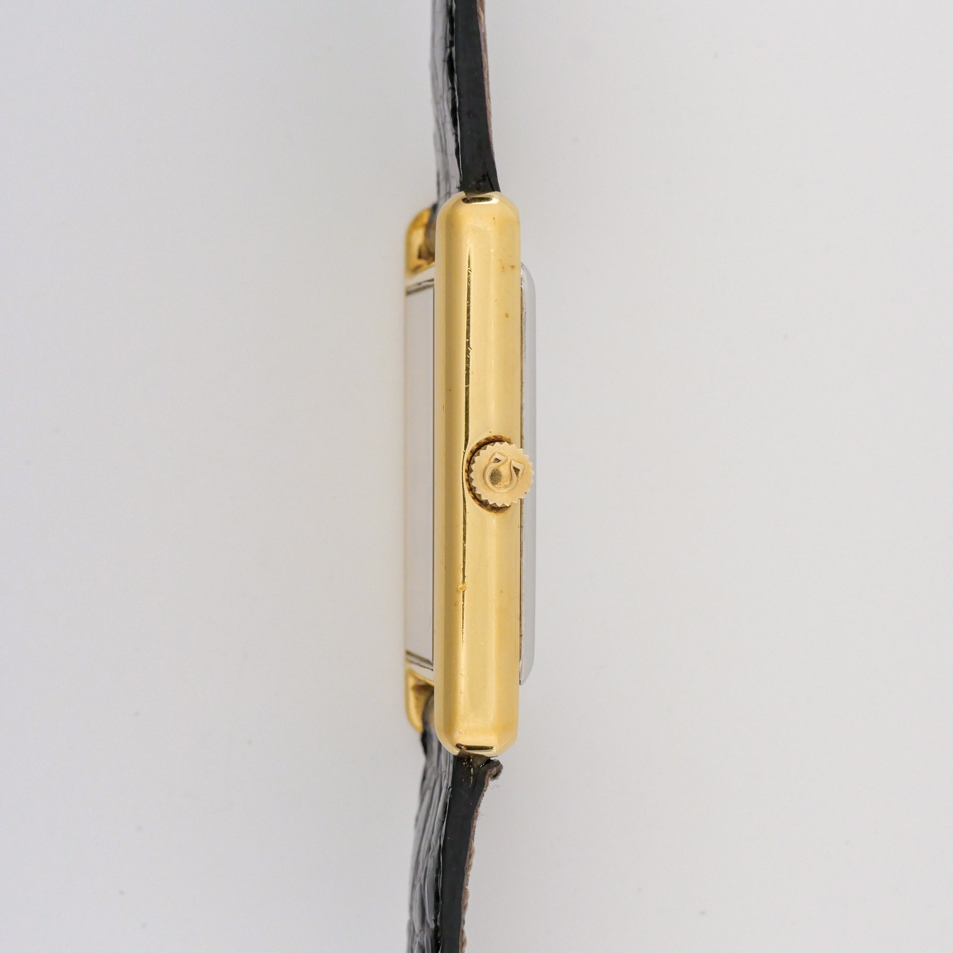 - Case: shows moderate wear consistent with regular use. There are visible scratches and scuffs on the surfaces, particularly noticeable on the sides and lugs. The gold plating has some wear spots but maintains its overall integrity without significant loss of material.