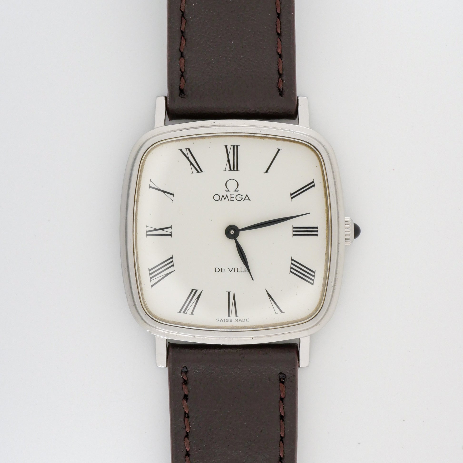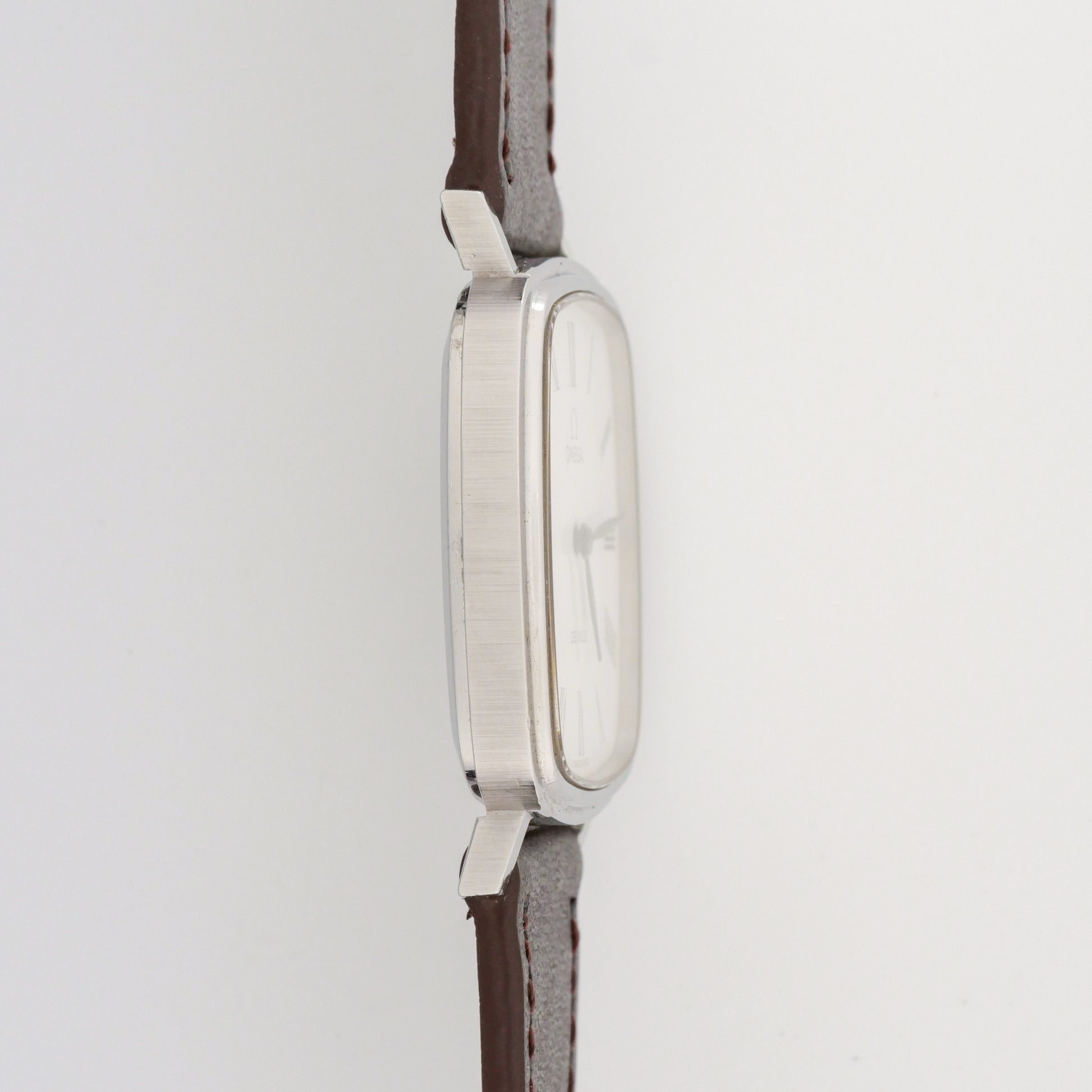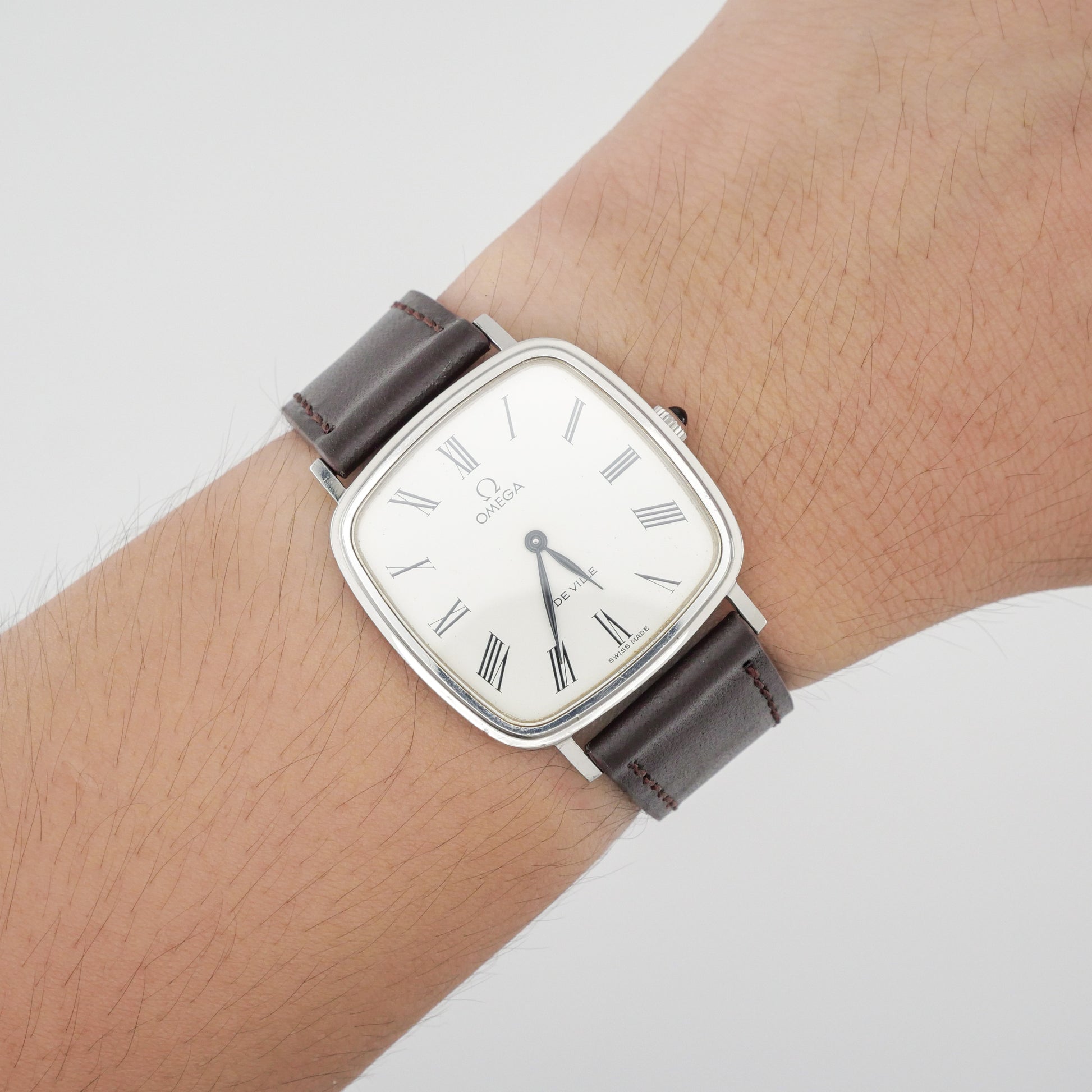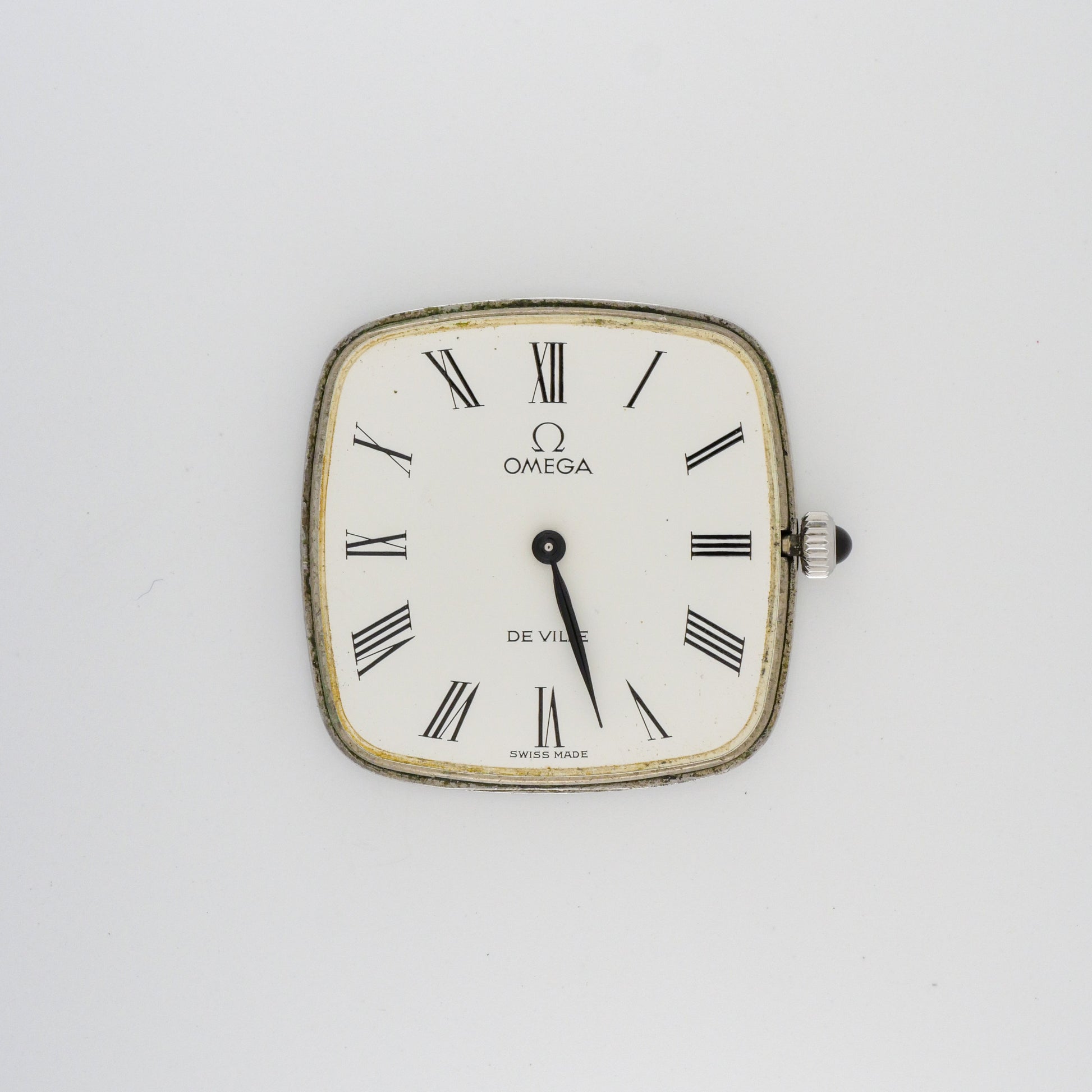 - Dial: displays age-related discoloration with a cream or ivory patina that's typical for vintage pieces. The Roman numeral markers and text remain clear and legible. There are some minor spots or marks visible on the dial surface, but no major damage, cracks, or significant staining.