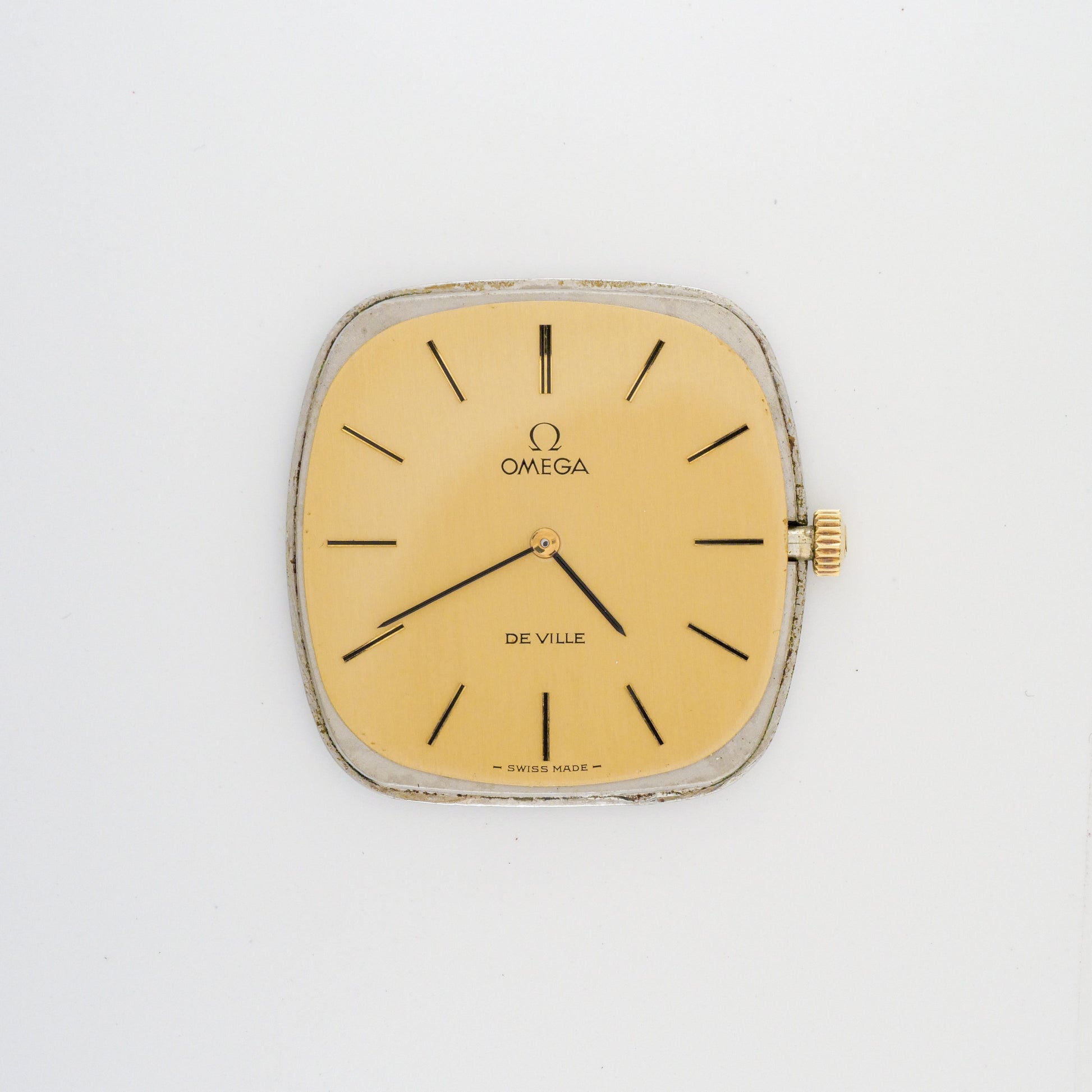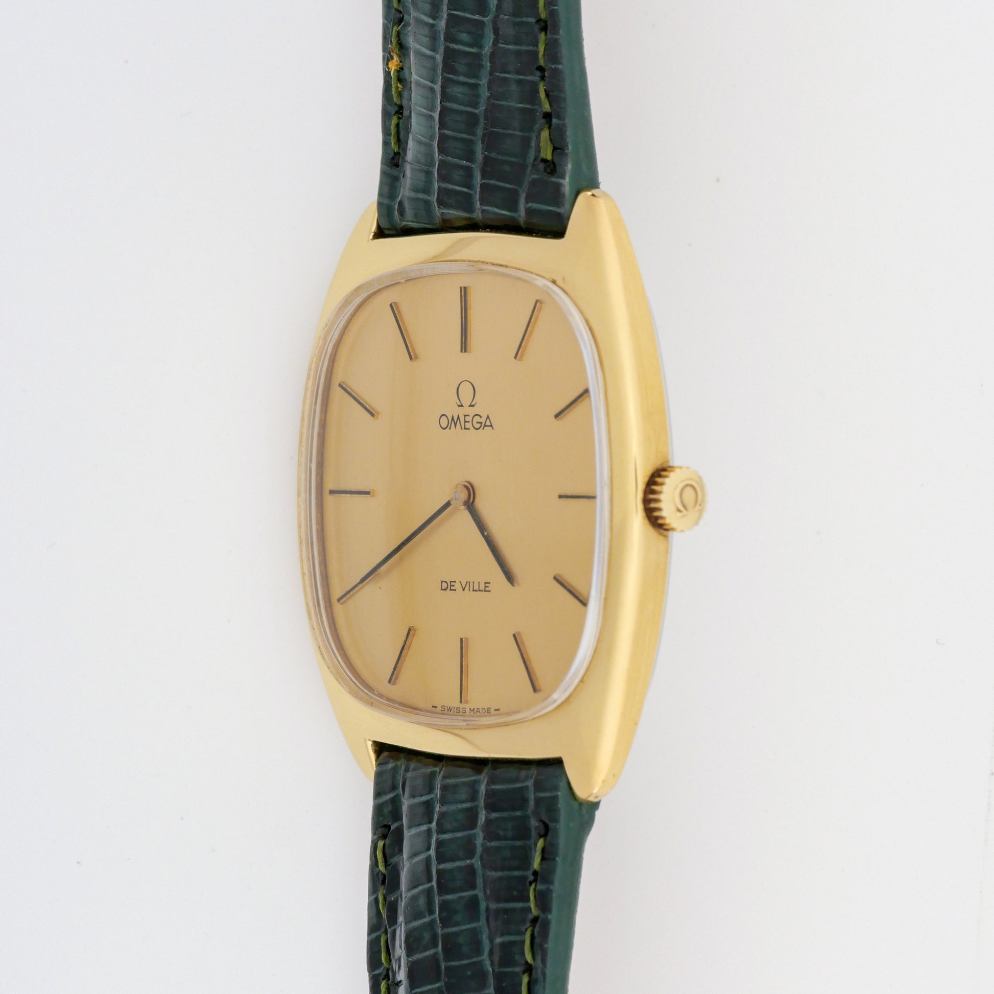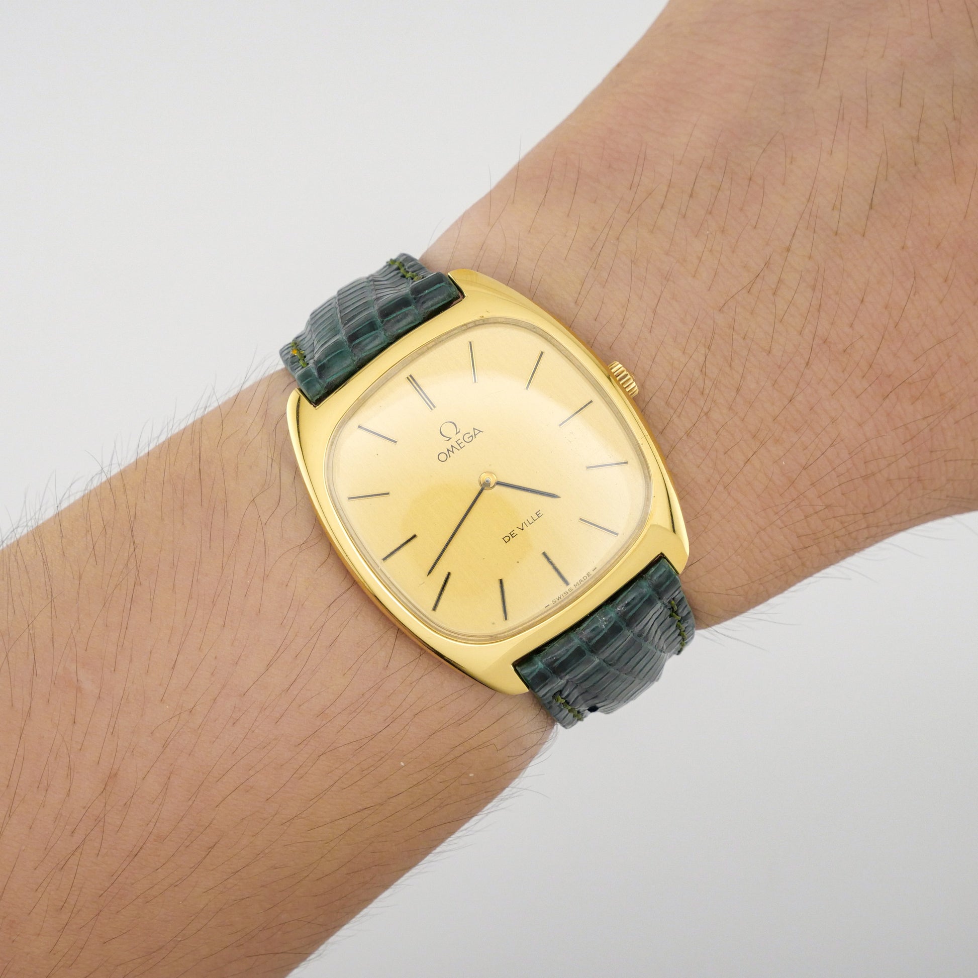 - Dial: is in good condition with minimal aging. The hour markers and hands retain their original appearance without significant discoloration or corrosion. The Omega logo and "De Ville" text remain crisp and legible.