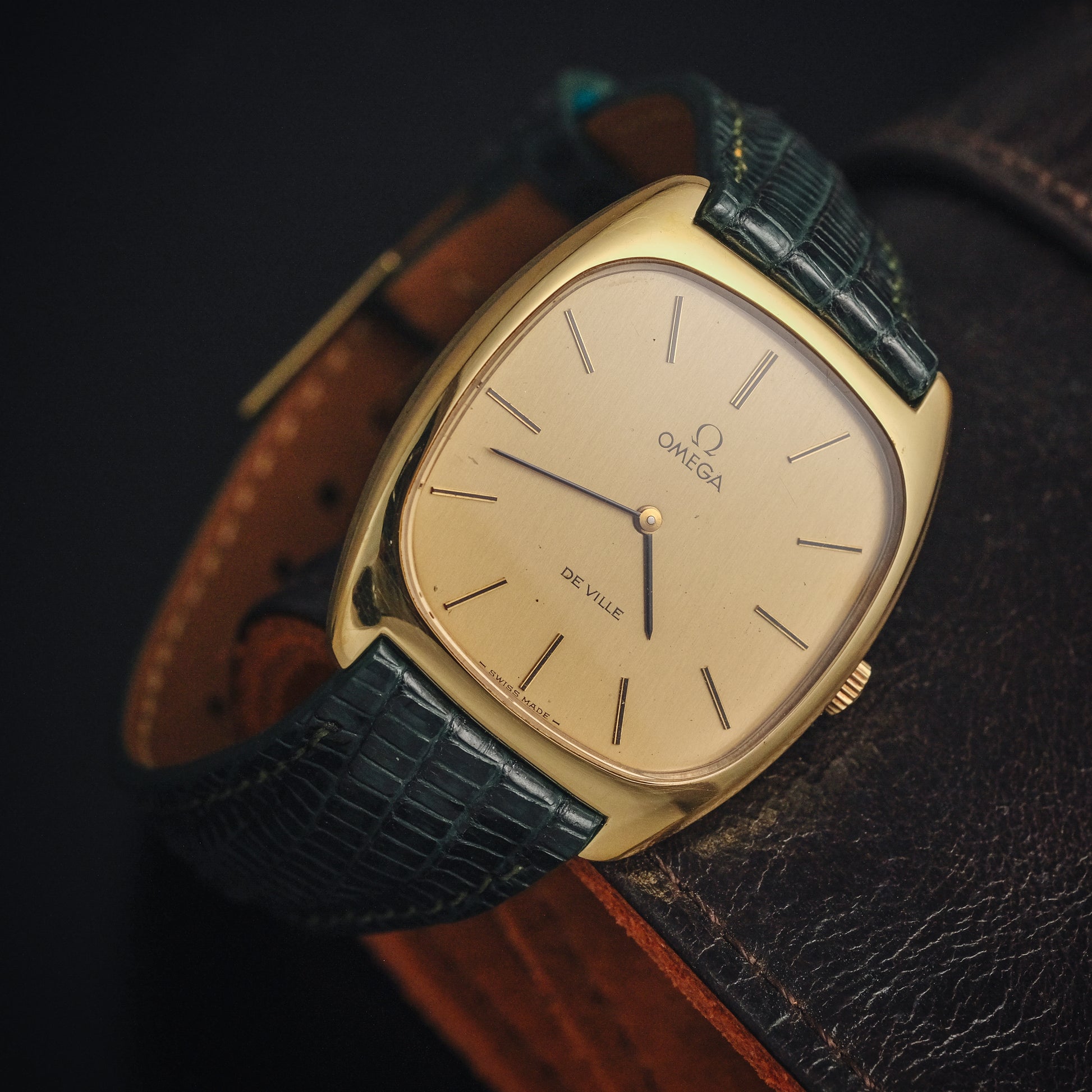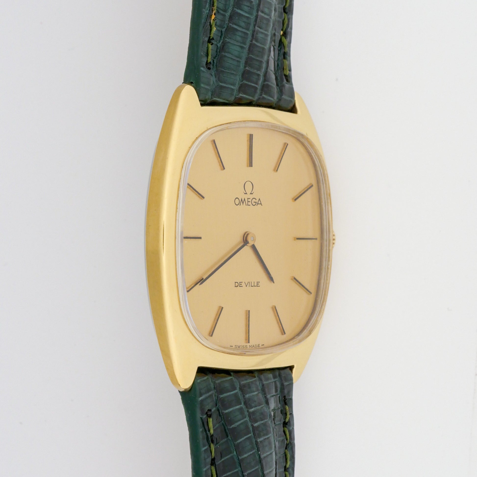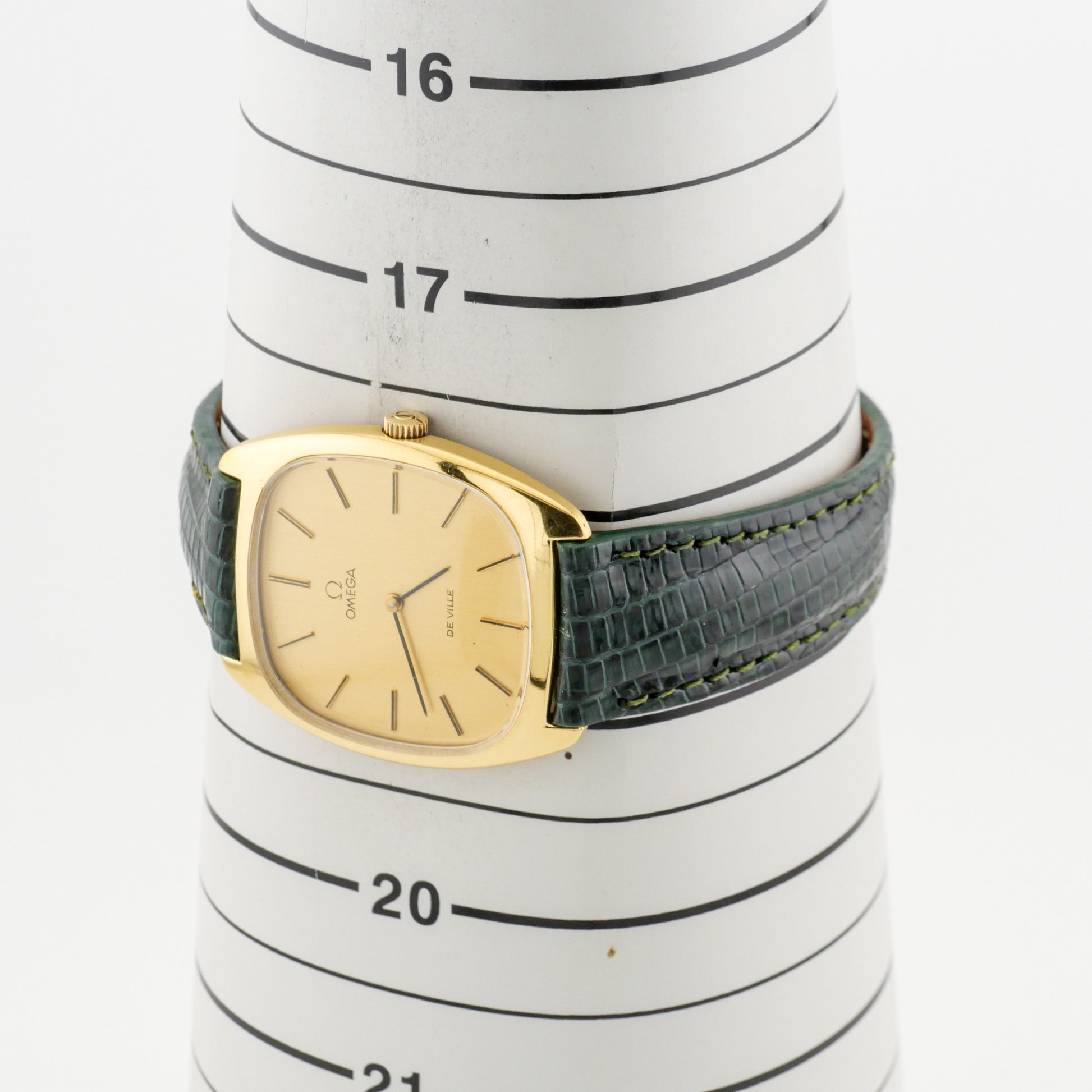 - Dial: is in good condition with minimal aging. The hour markers and hands retain their original appearance without significant discoloration or corrosion. The Omega logo and "De Ville" text remain crisp and legible.