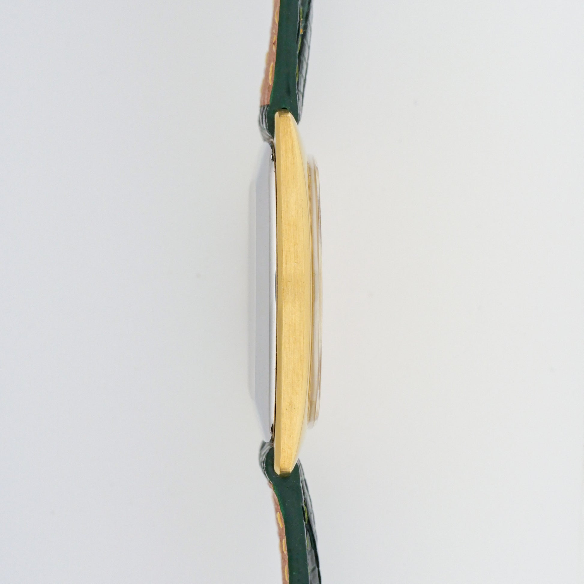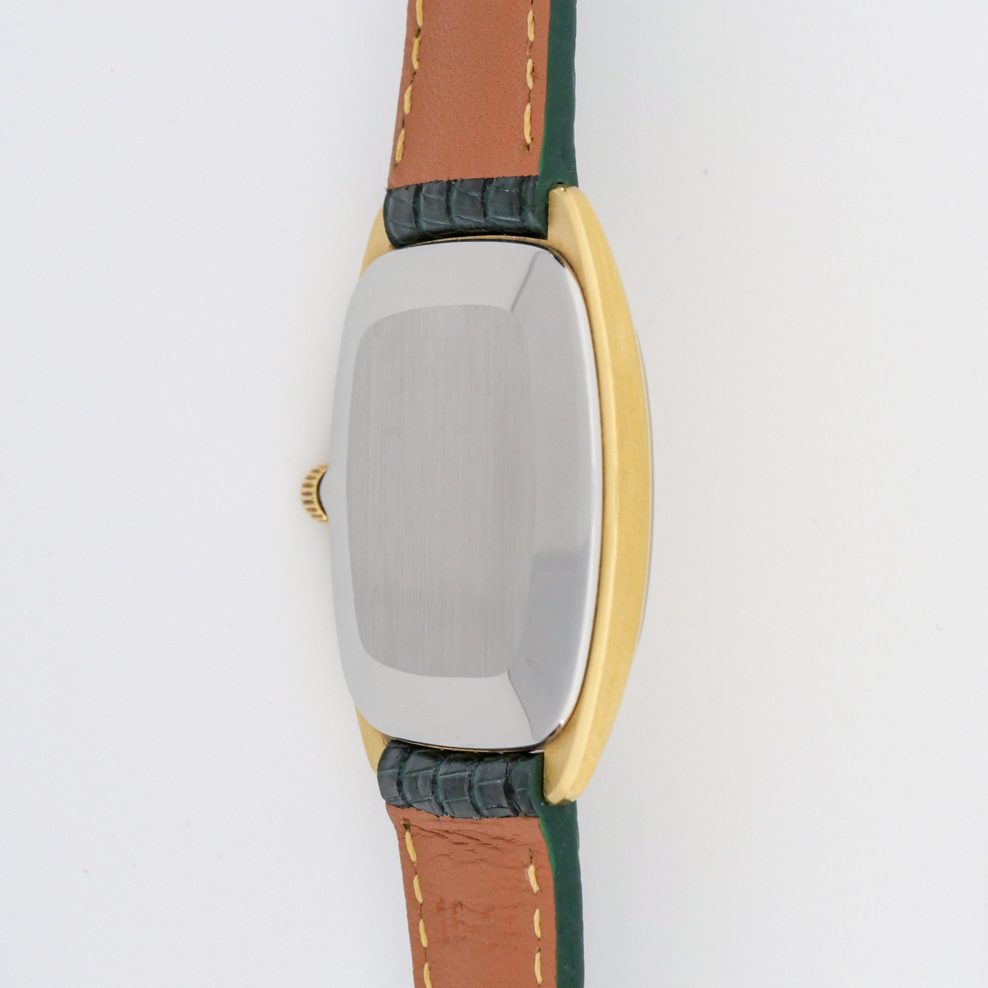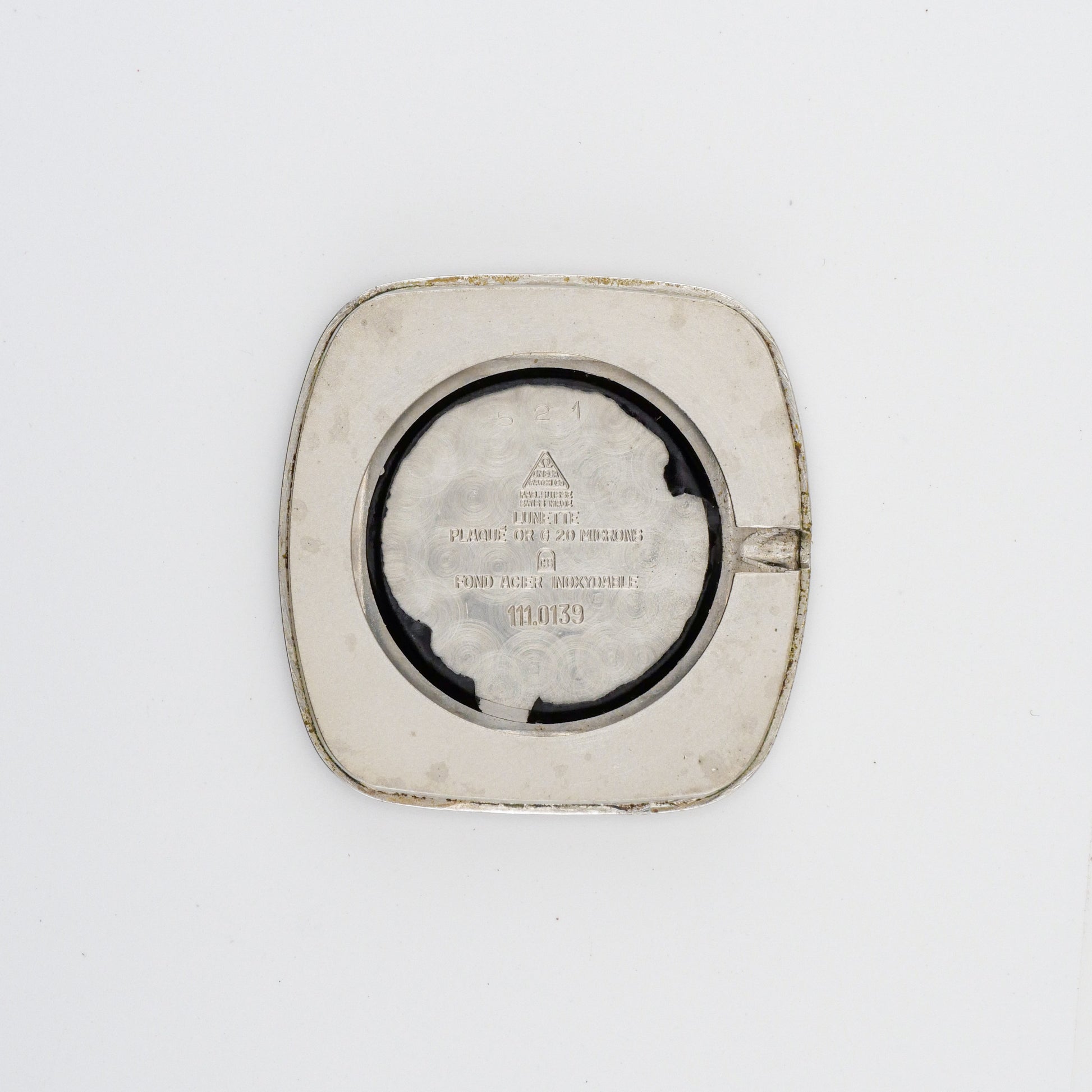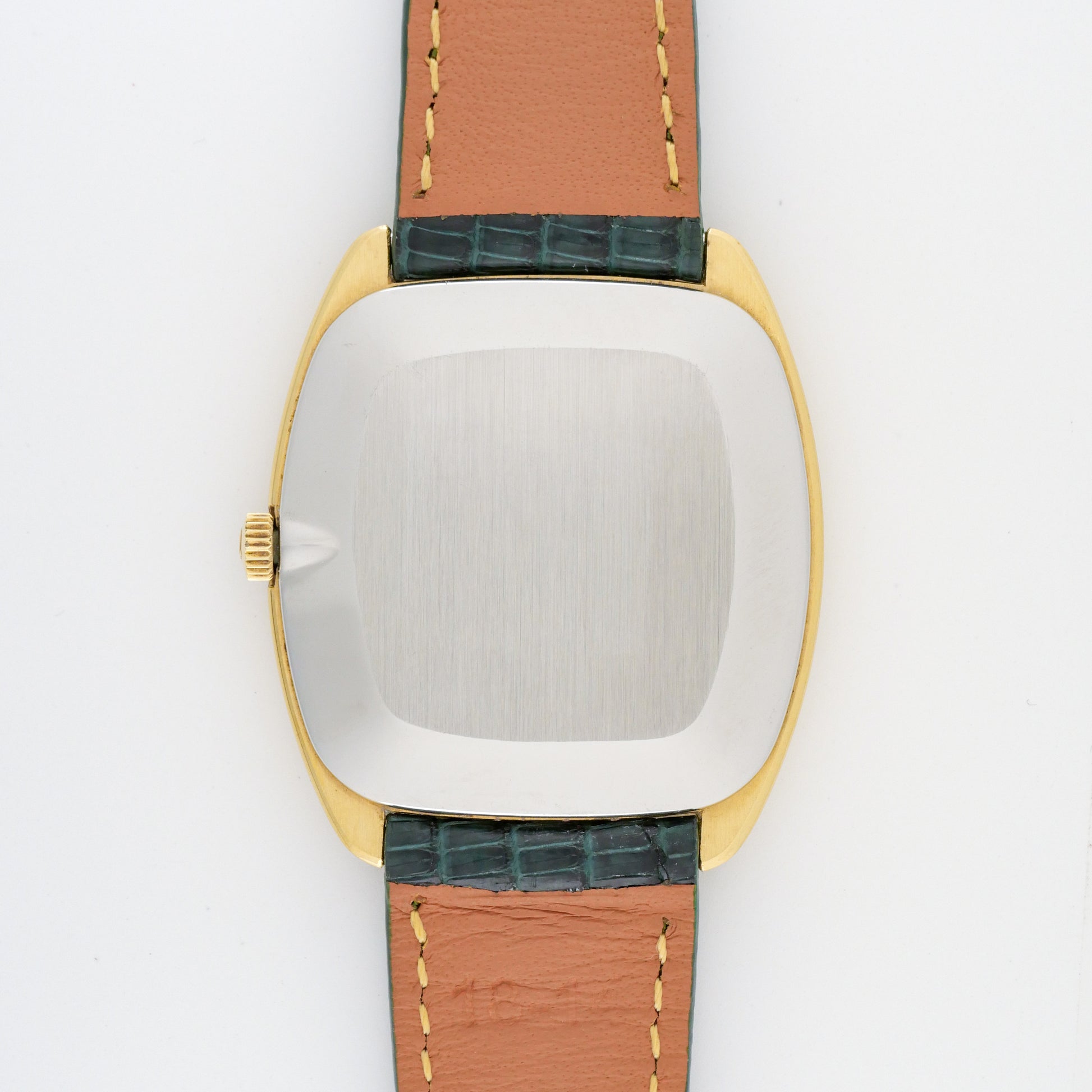 - Case: shows moderate wear consistent with age and use. There are visible scratches and scuffs throughout the surface, particularly noticeable on the sides and lugs. The plating appears to be wearing thin in some areas, revealing darker metal underneath, especially around the edges and high-contact points.