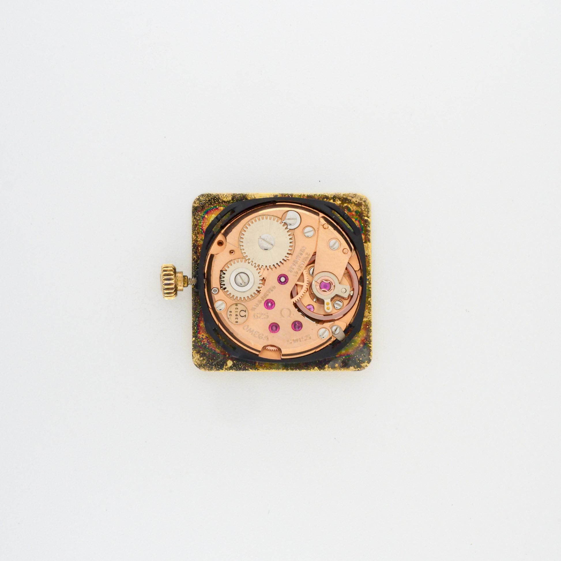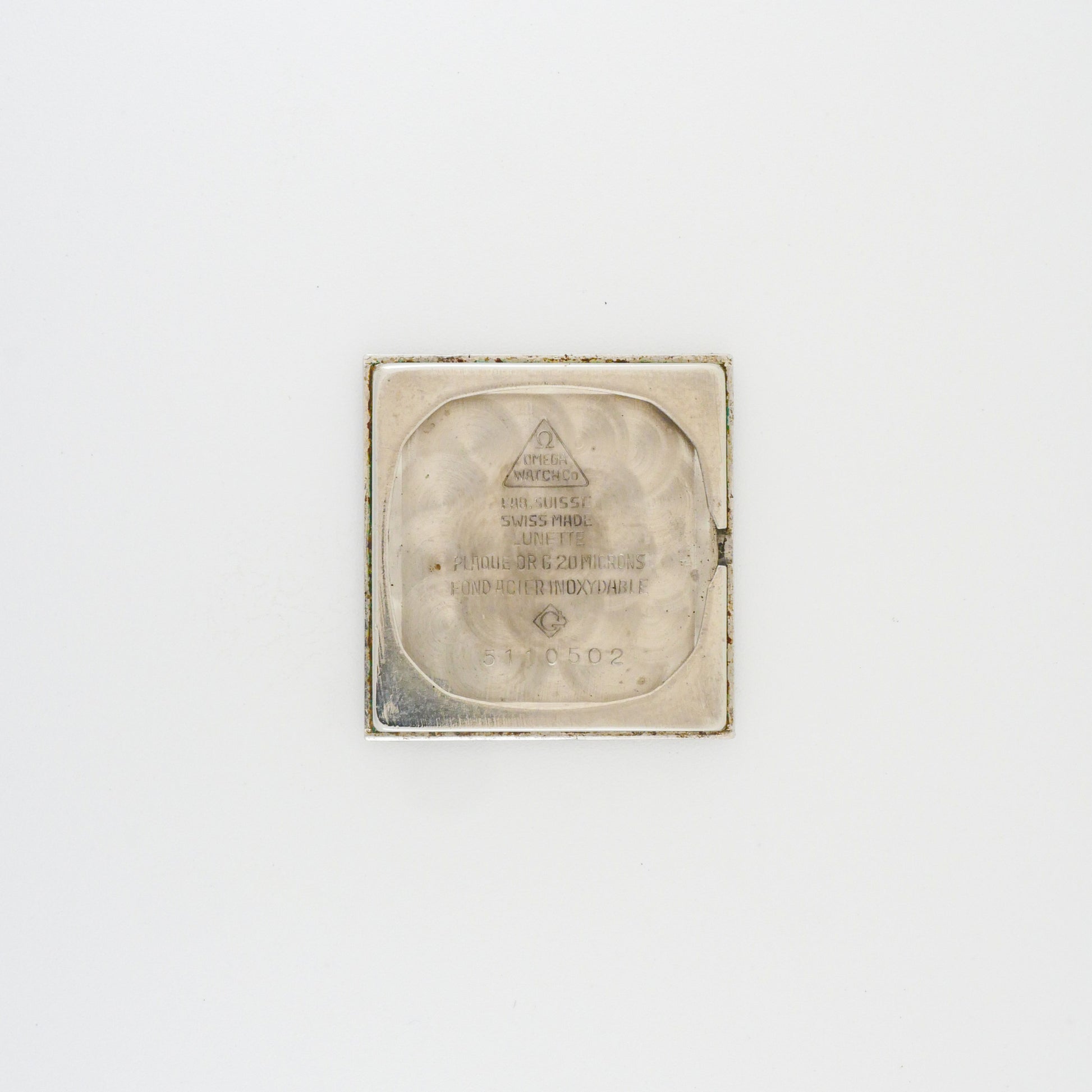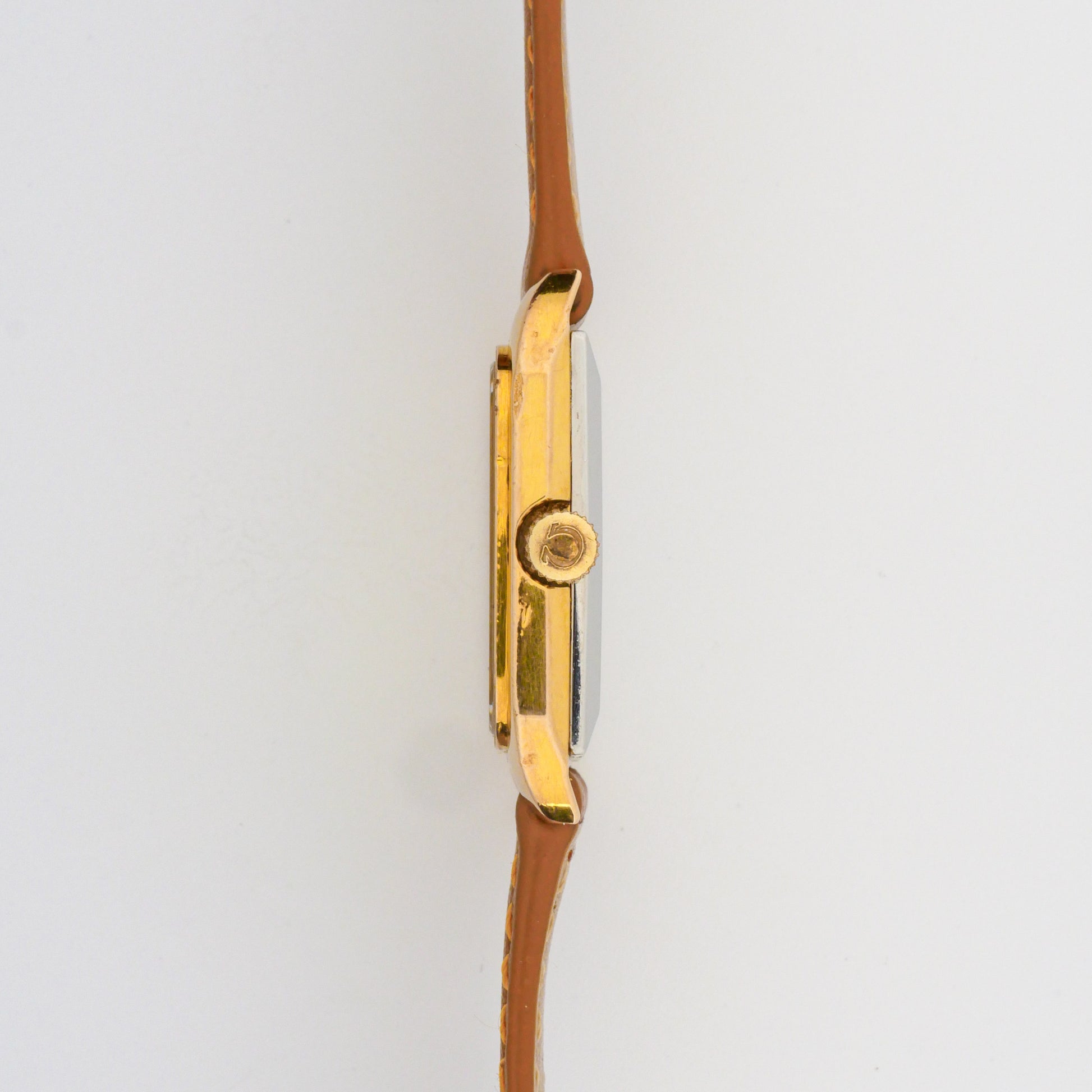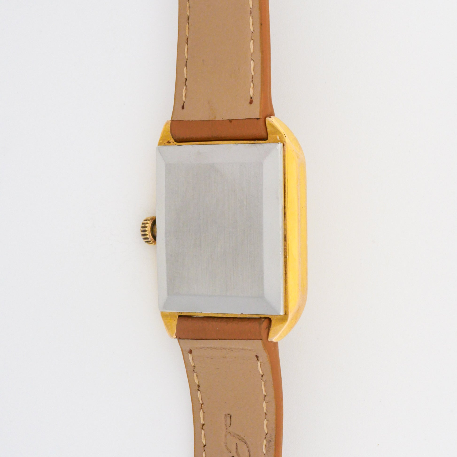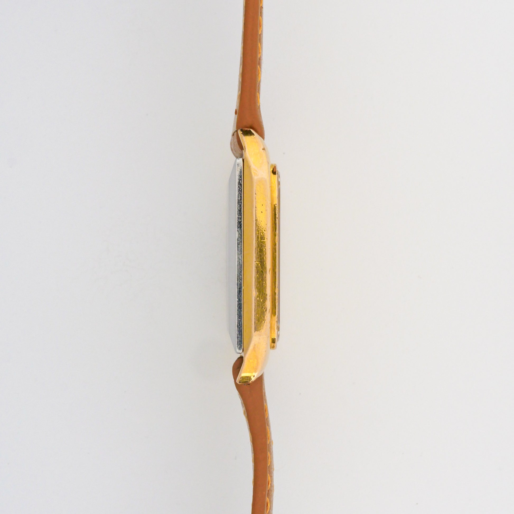 - Case: shows noticeable signs of wear and aging, with visible scratches and some wear to the plating, particularly around the edges and lugs. The overall shape remains intact, and the crown shows signs of use. The case maintains its squared shape but has developed a patina consistent with its age.