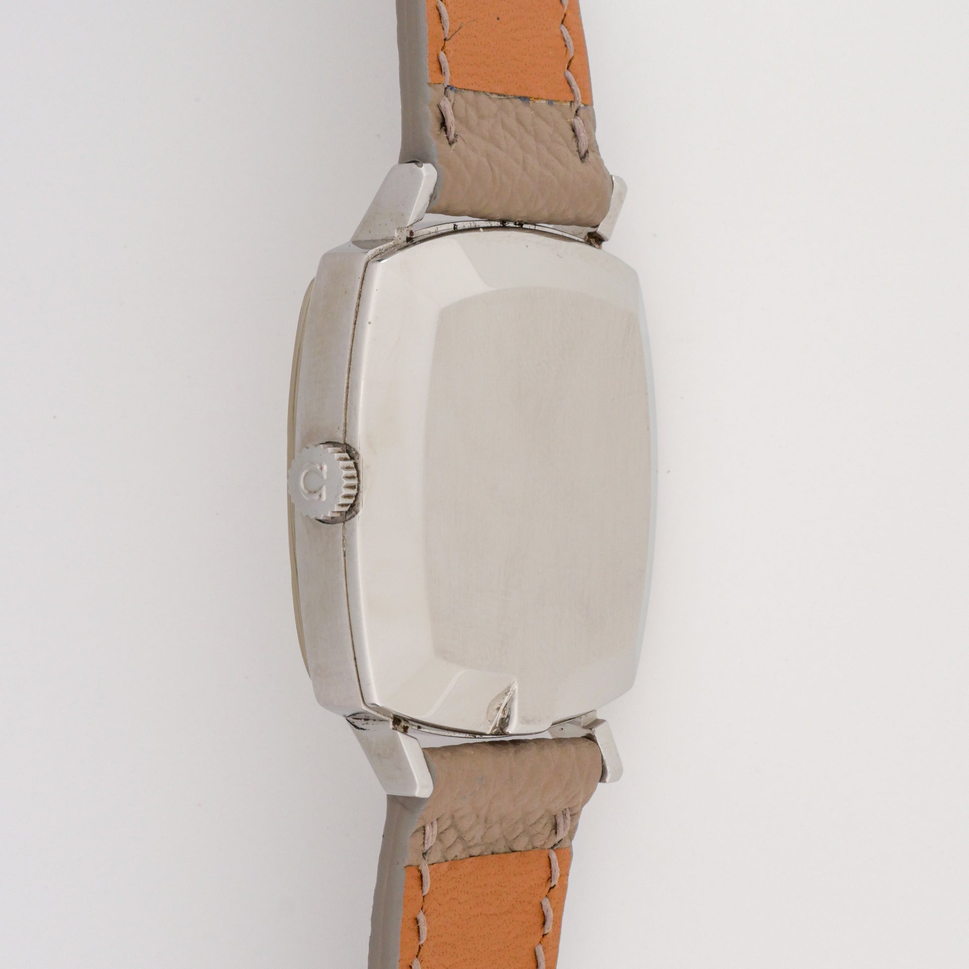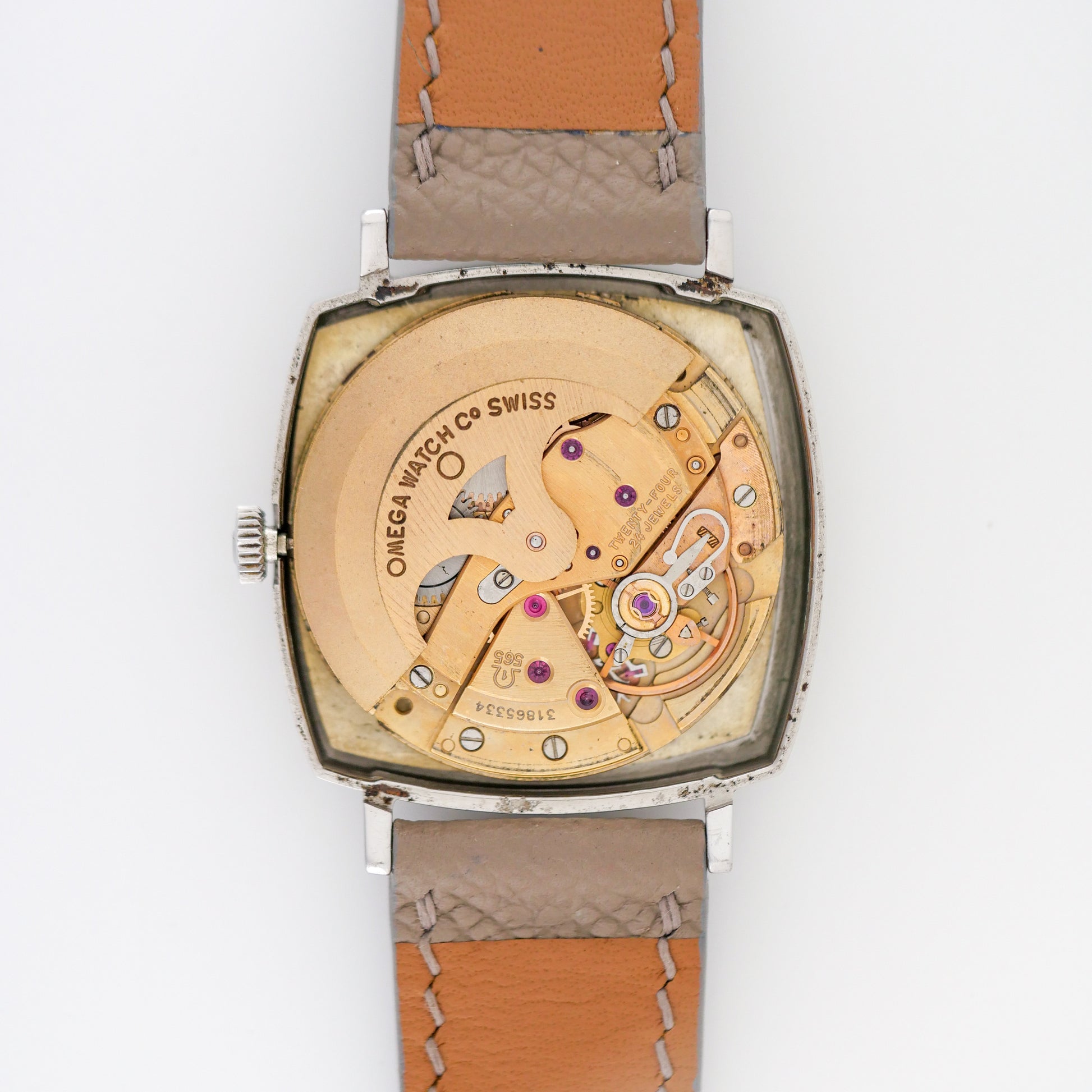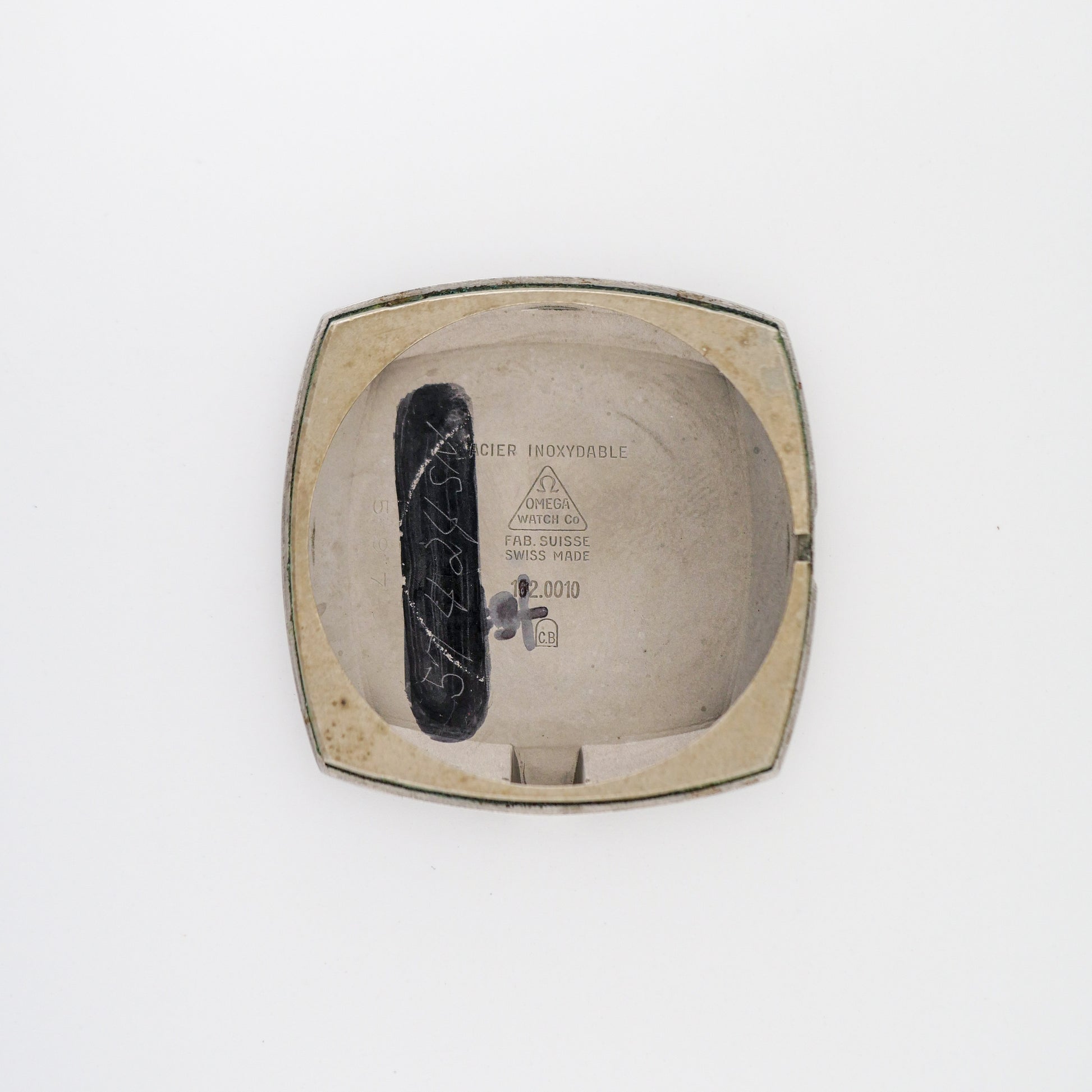 - Dial: in good vintage condition, showing some aging but maintaining good legibility. The hour markers and Omega logo are intact, though there may be some slight discoloration or oxidation around the edges. The date window at 3 o'clock is clear and functional.