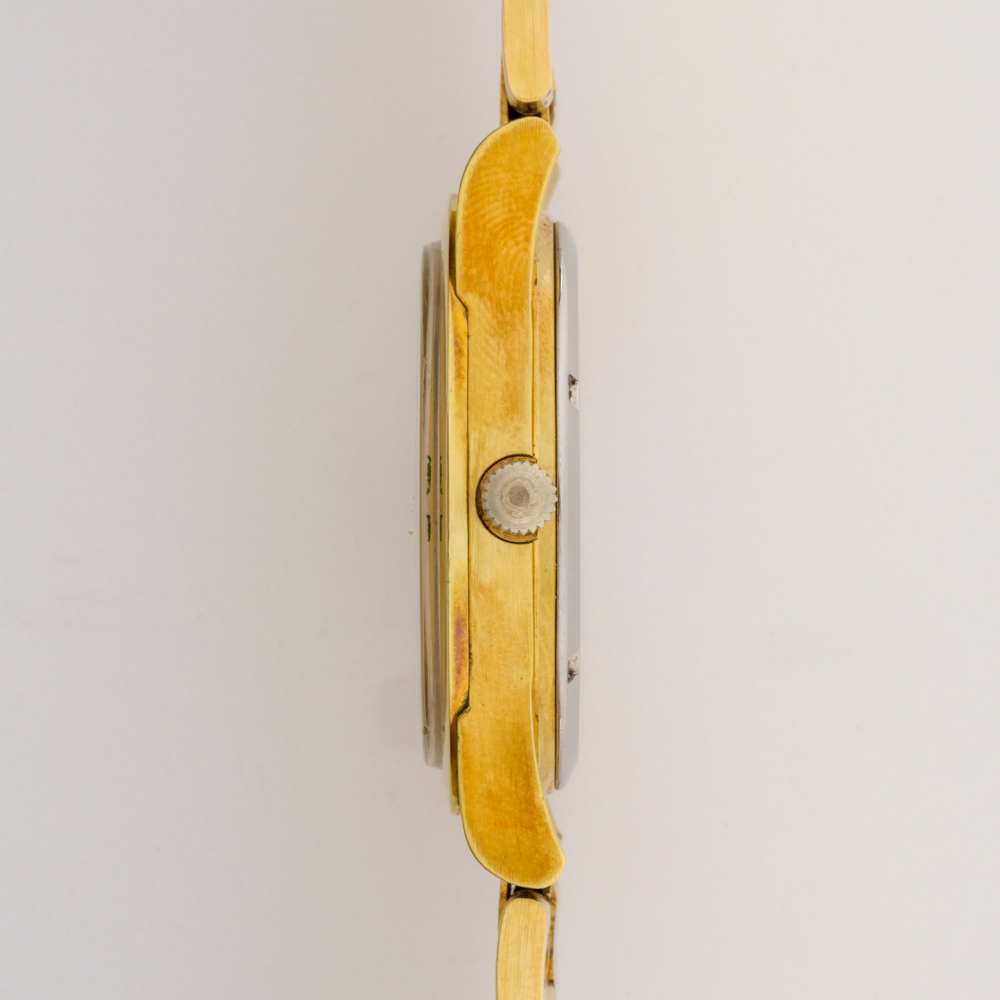 - Case: shows noticeable signs of wear and aging. There are areas of discoloration and patina, particularly visible around the lugs where there appears to be some reddish oxidation. The case edges retain their original shape but show scratches and surface wear consistent with regular use over time.