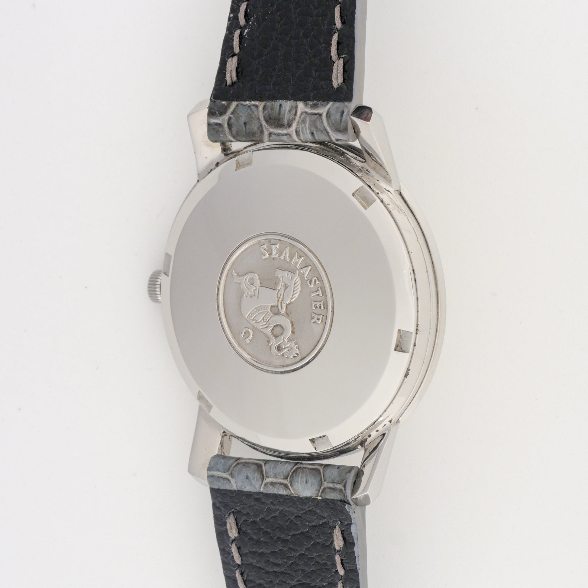 - Case: shows moderate signs of wear with visible scratches and light polishing marks on the bezel and lugs. The case back displays a well-preserved Seamaster emblem with a seahorse motif, though there are some minor scratches around the edges. The crown is intact with minimal wear.