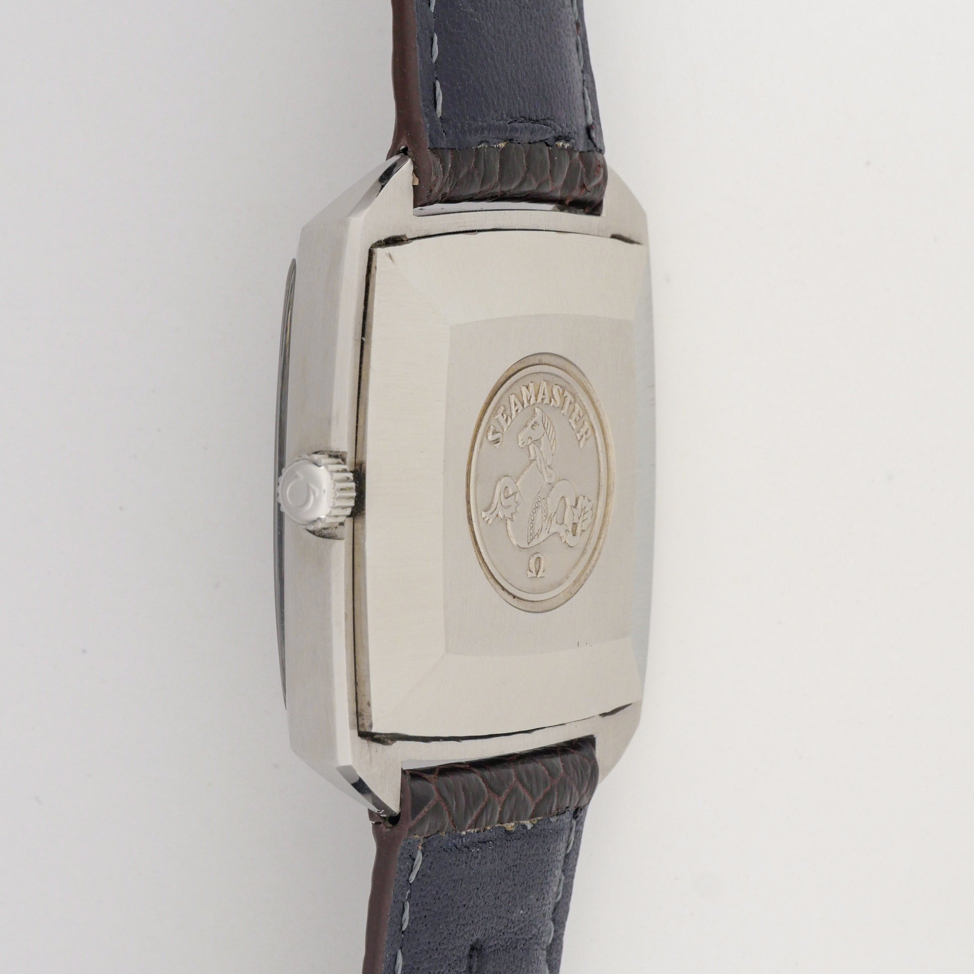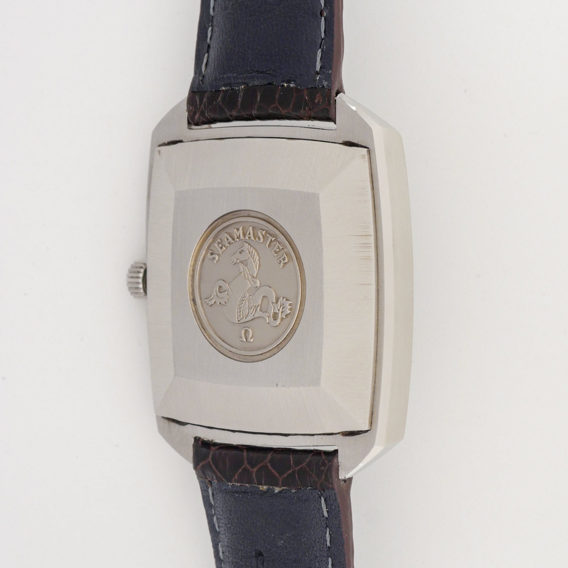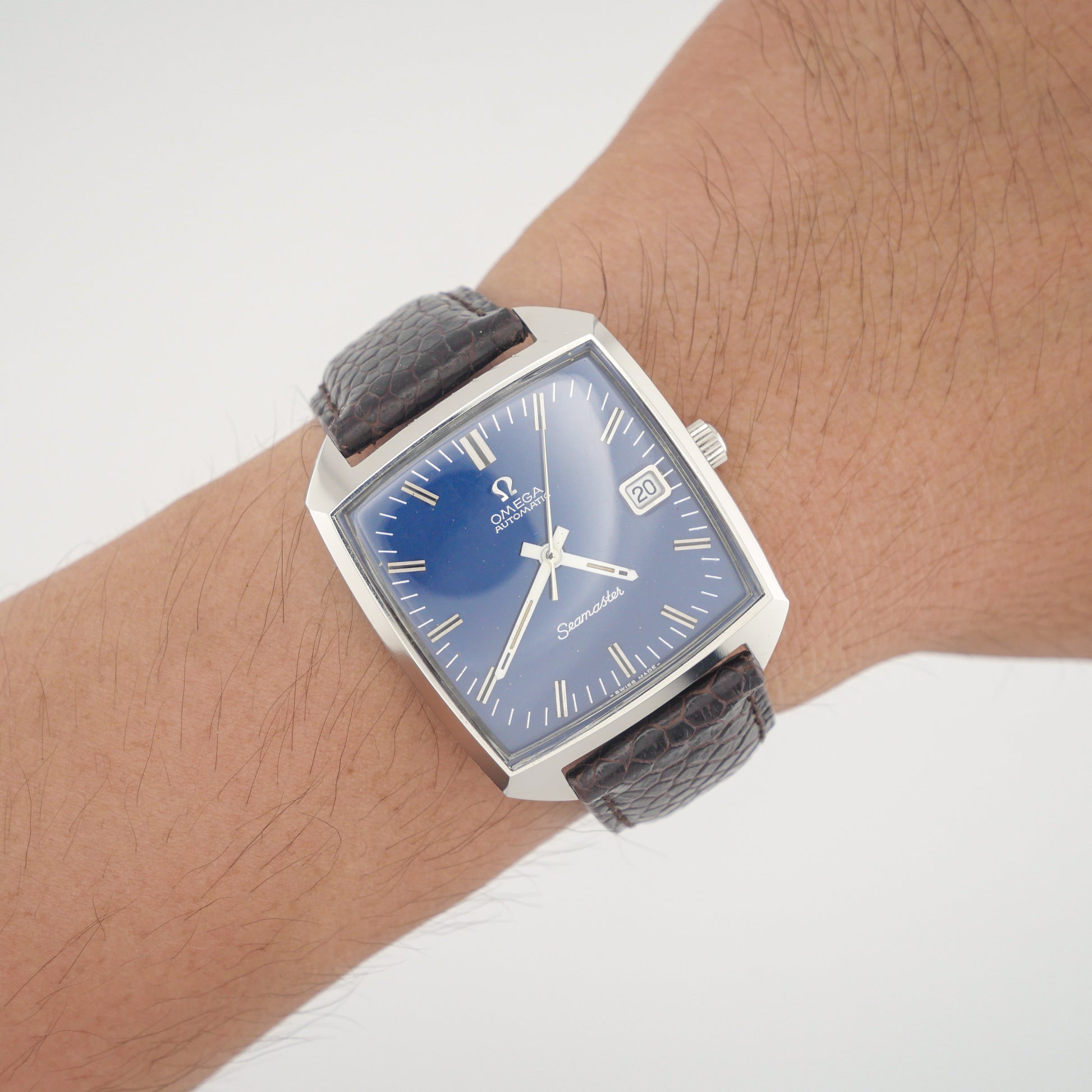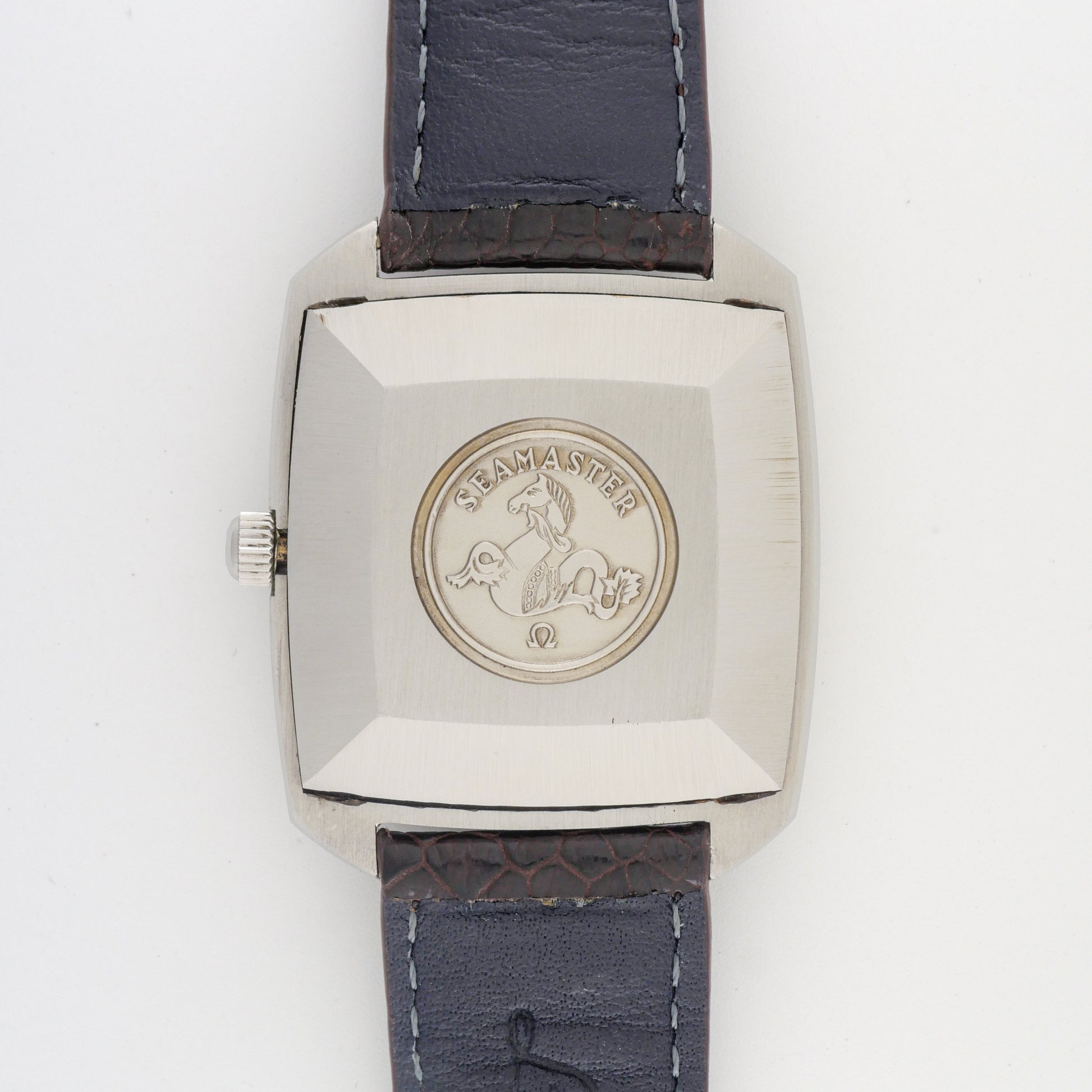 - Case: shows light signs of wear consistent with age but remains in good condition overall. The faceted, square-shaped case has maintained its polished finish with minor surface scratches visible. The caseback features a well-preserved Seamaster emblem with the distinctive seahorse logo.