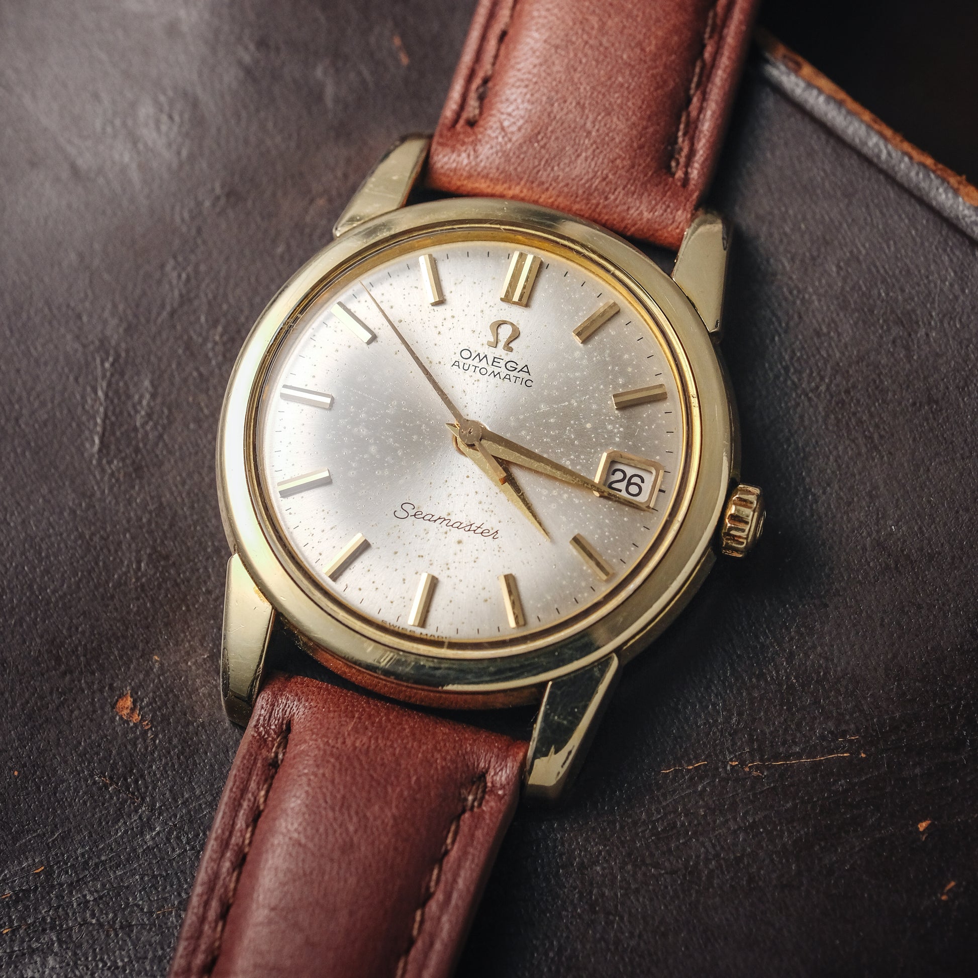 Dial: in relatively good vintage condition, showing some patina and aging that's consistent with its age. The gold hour markers and hands are intact and well-preserved. The text remains clear and legible, and the date window at 3 o'clock is clean and functional.