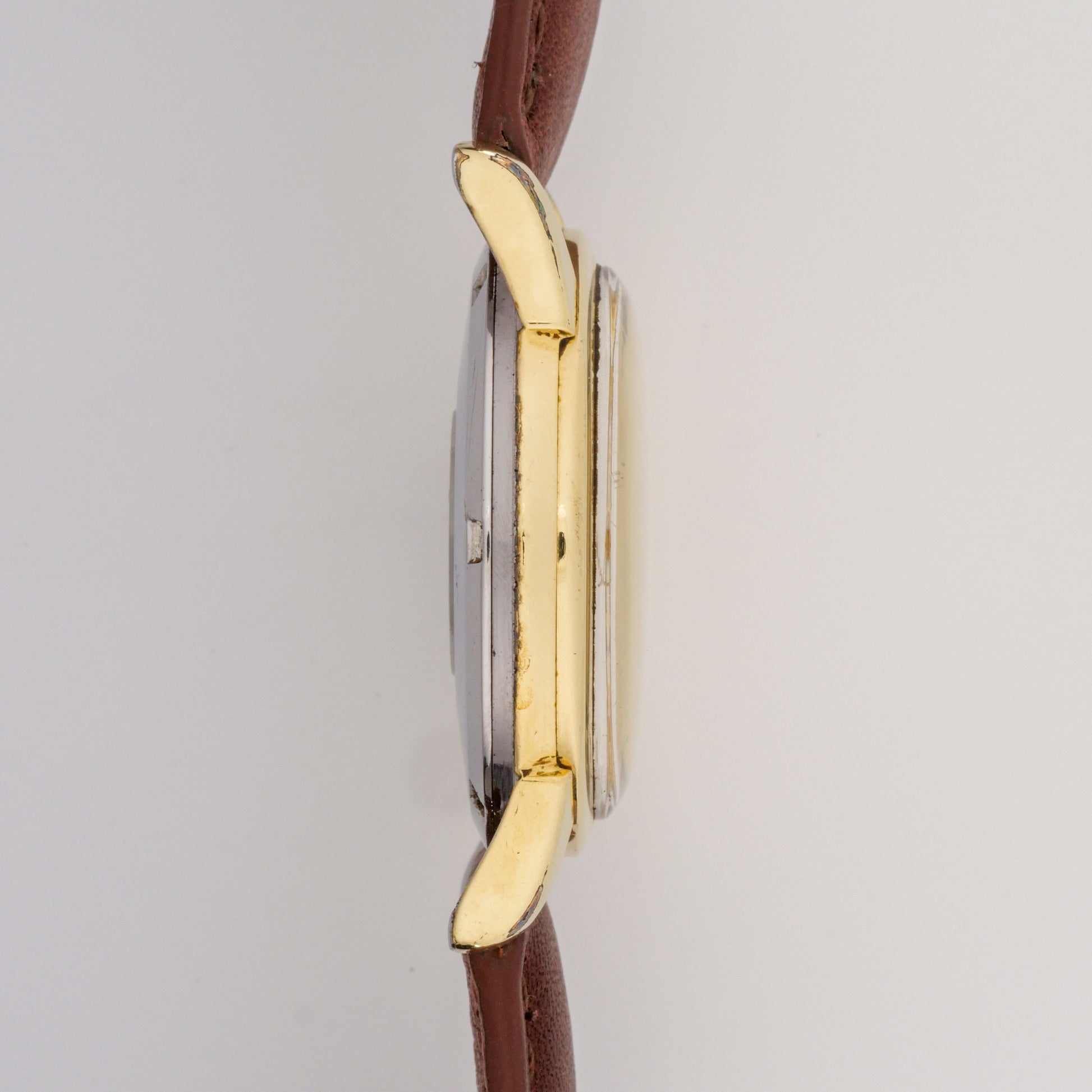 - Case: shows noticeable wear and aging, particularly visible through areas where the plating appears to be wearing thin or rubbed. There are some scratches and signs of use, especially on the lugs. The case retains its original shape and design elements, with a mix of polished and brushed surfaces still visible despite the wear.
