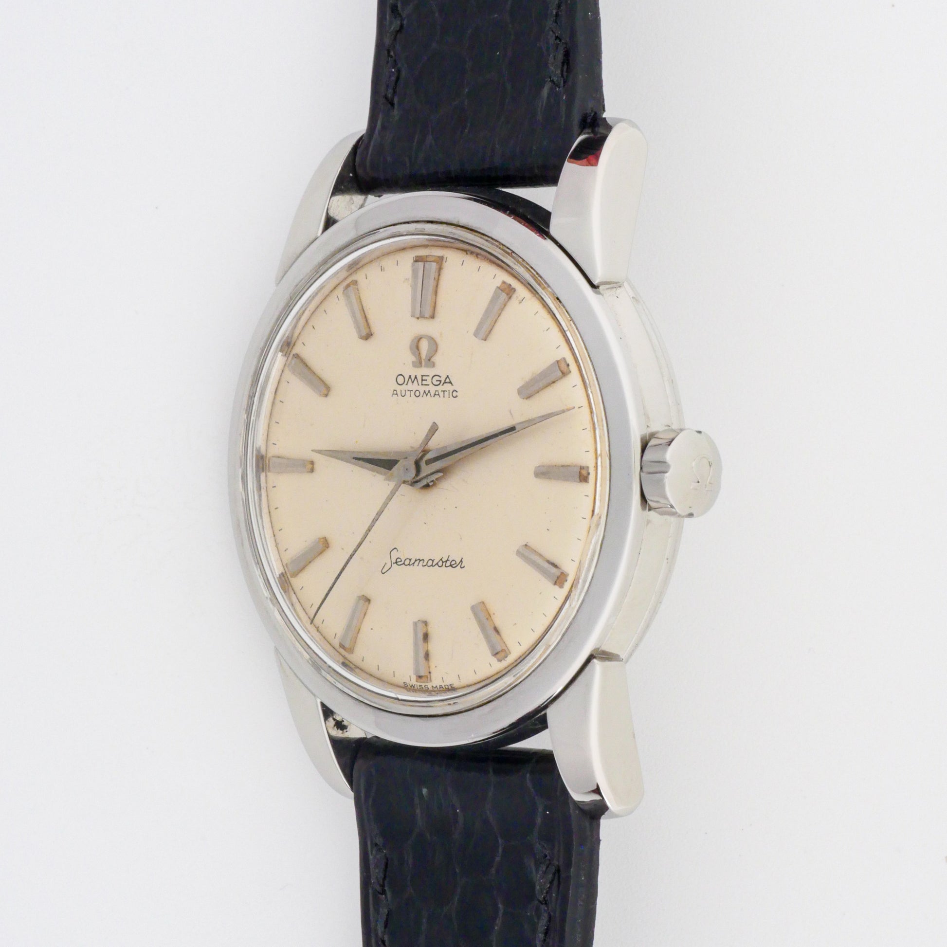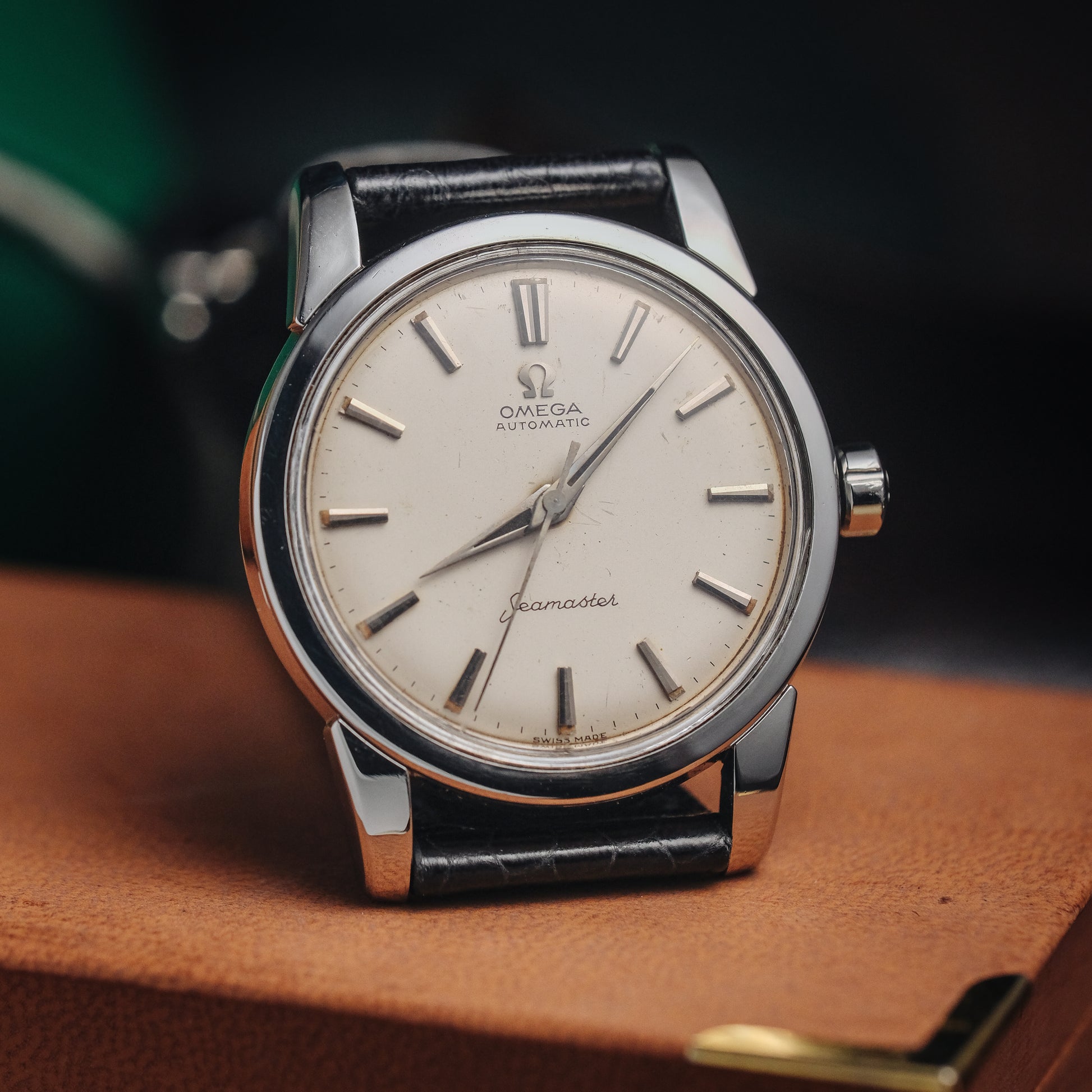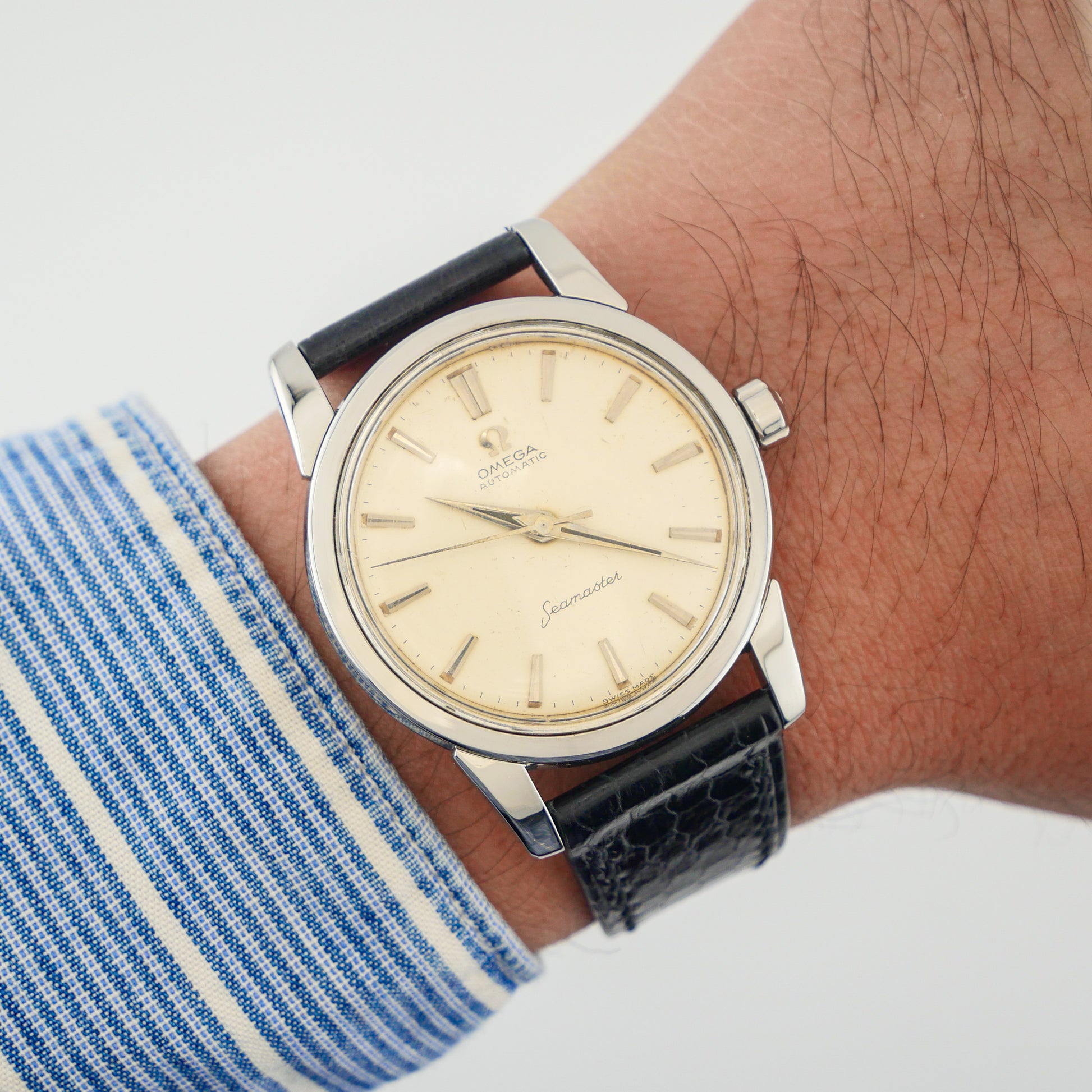 - Dial: exhibits signs of aging with some patina, which is typical for a vintage Seamaster. The applied hour markers are intact, showing slight tarnishing but maintaining their original finish. The logo and text are all clearly legible, though there are some very mild aging spots on the dial surface.