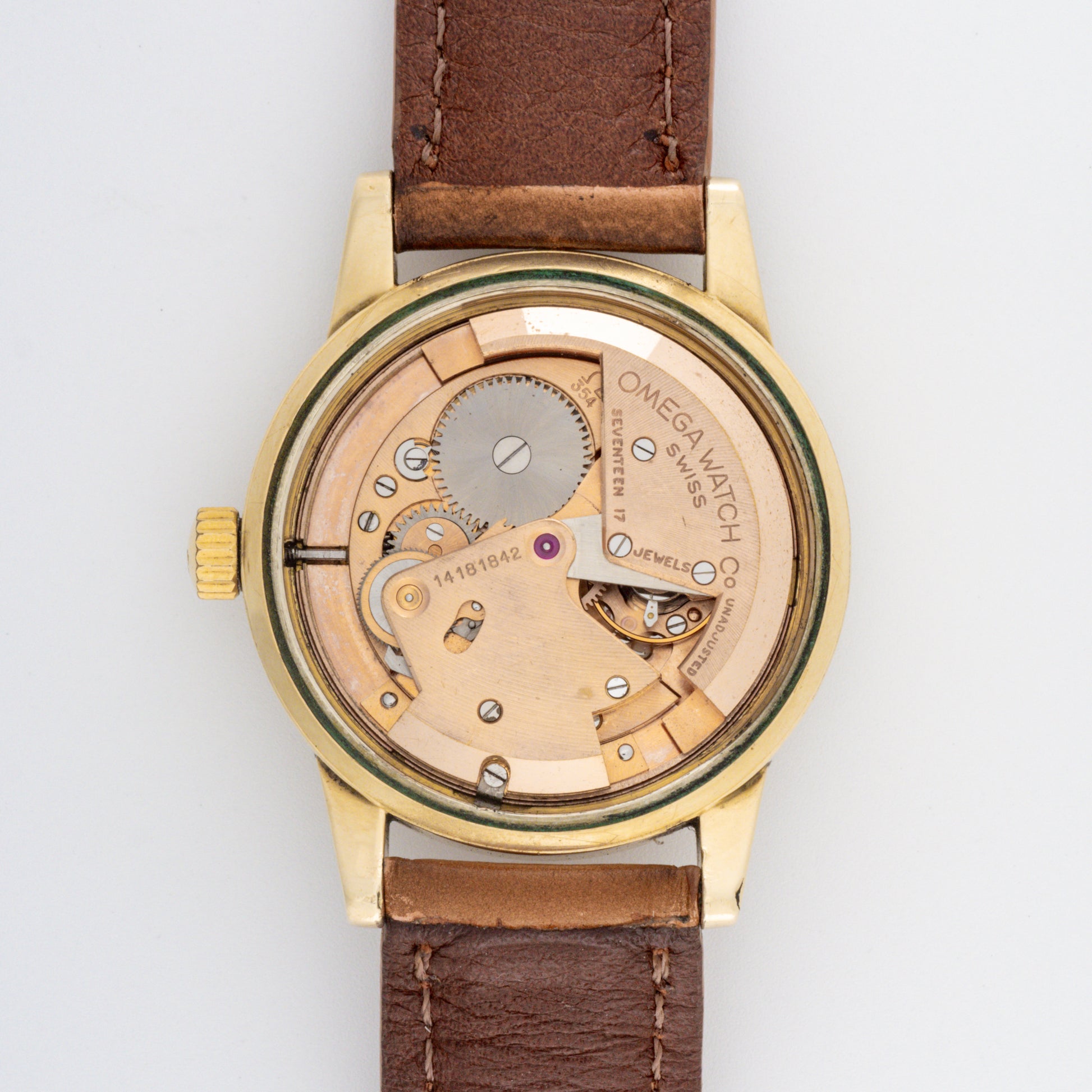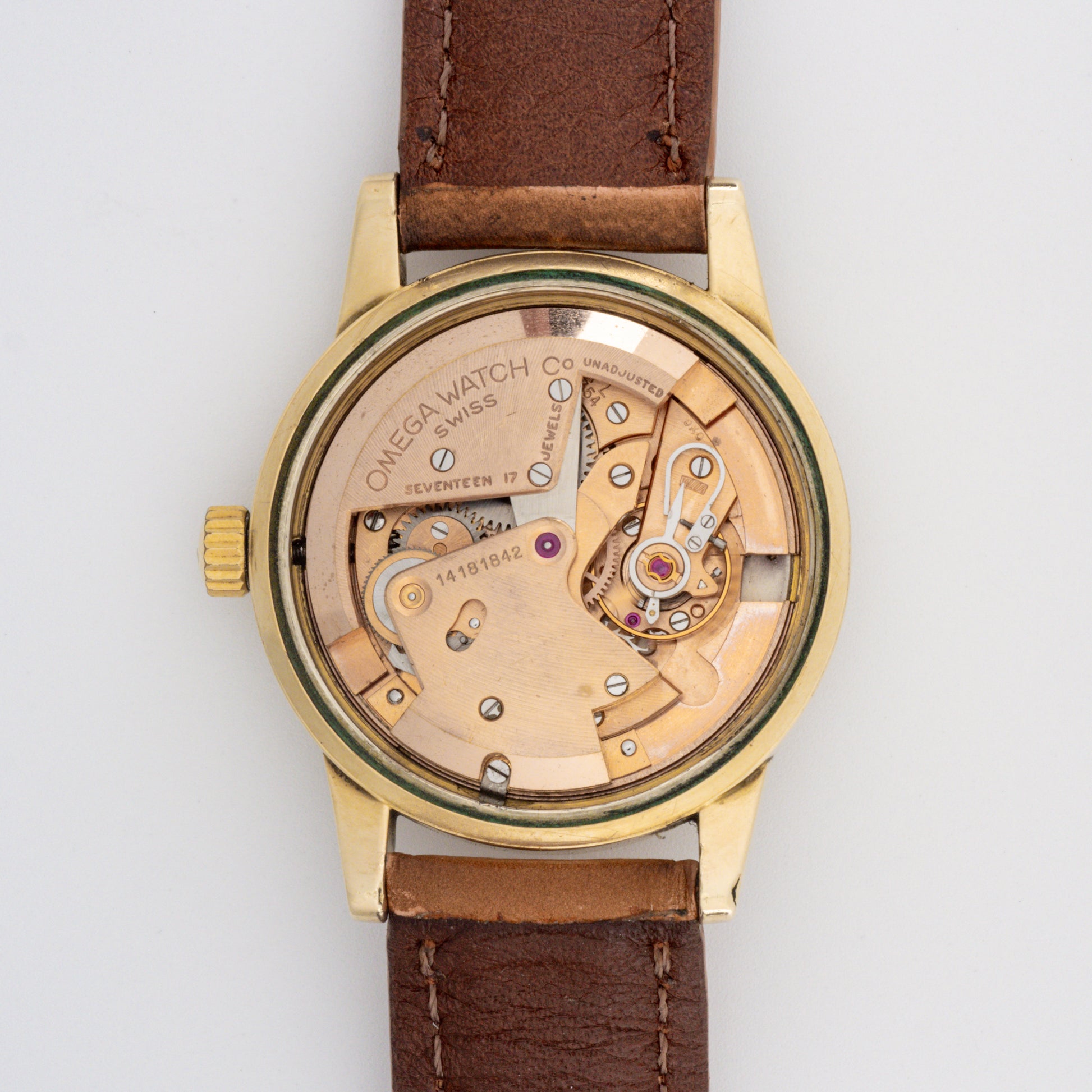 - Dial: exhibits patina and aging, with some spotting and discoloration visible across its surface. The hour markers and Omega logo remain clear and legible. The dial has developed a warm, vintage patina that appears even across the surface, without any major damage or restoration evident.