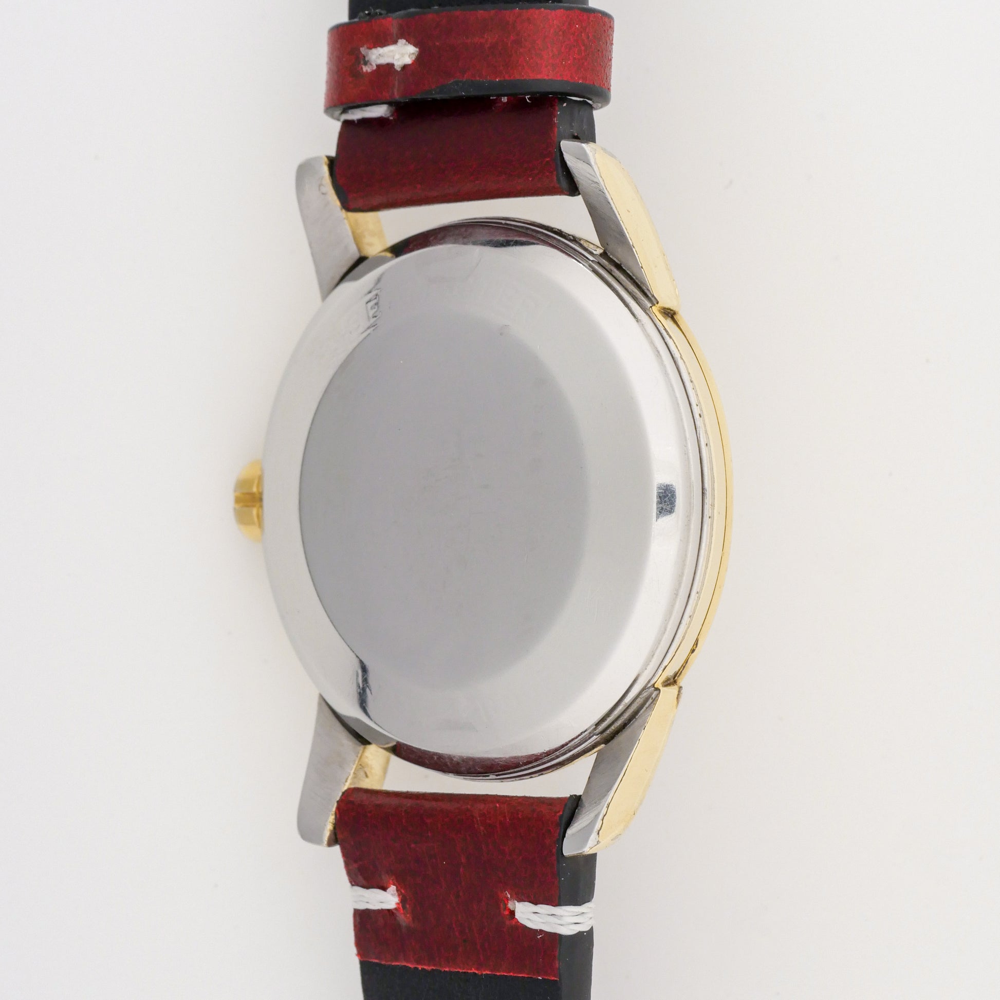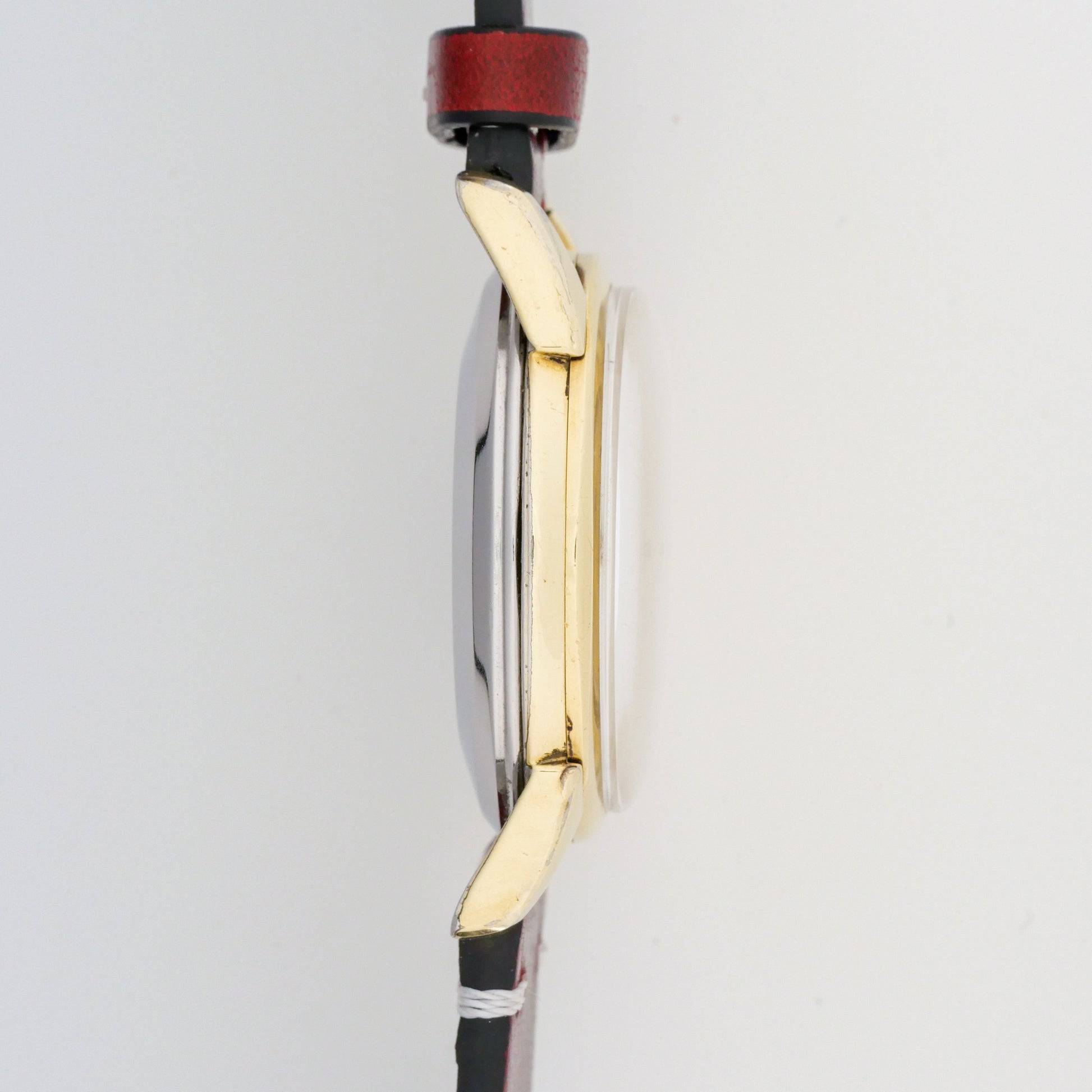 - Case: shows moderate wear consistent with age and use. There are visible scratches and scuffs throughout the case, particularly noticeable on the lugs and sides. The gold plating is intact but shows some dulling and minor wear spots. The case back has scratches and marks from normal handling over time.