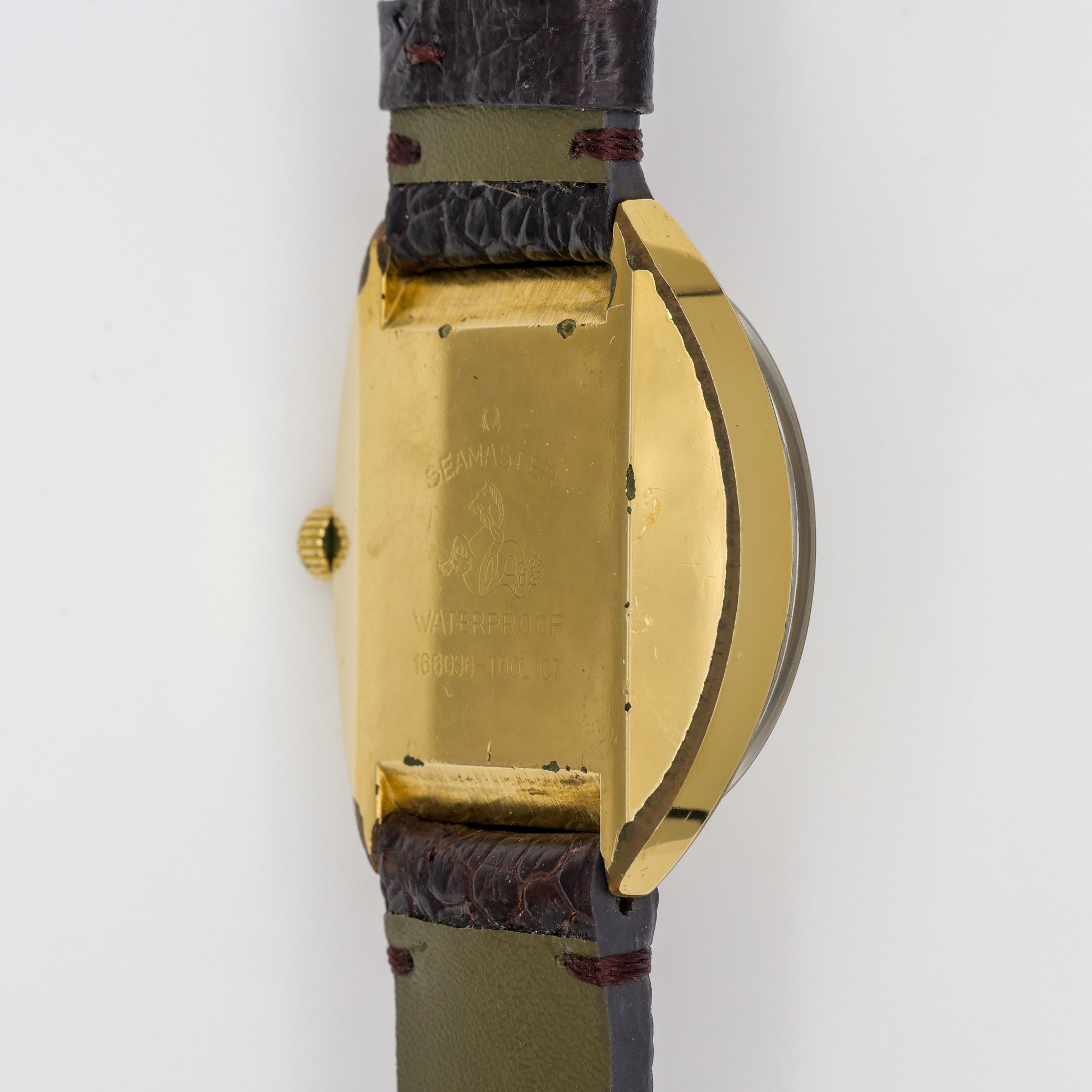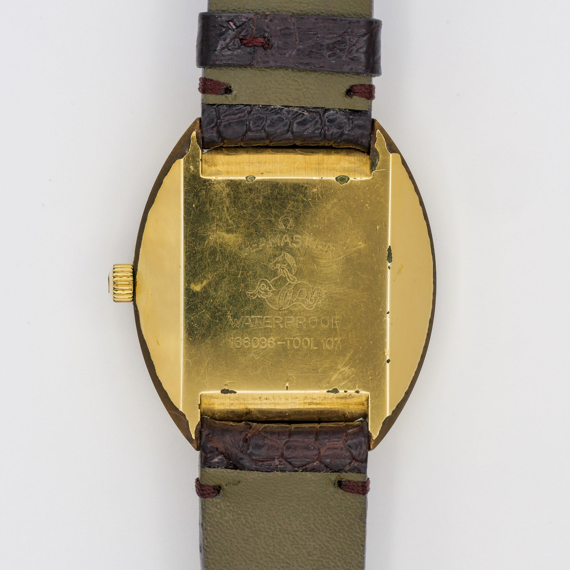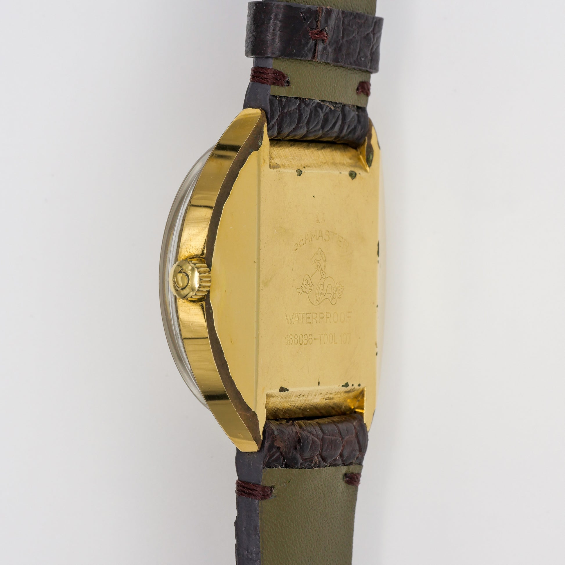 - The dial has a clean, off-white color with gold applied hour markers and an Omega logo, no major dial damage or discoloration.