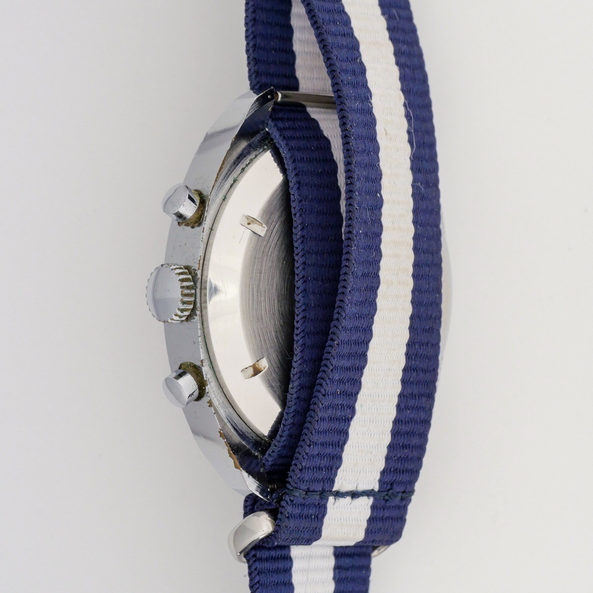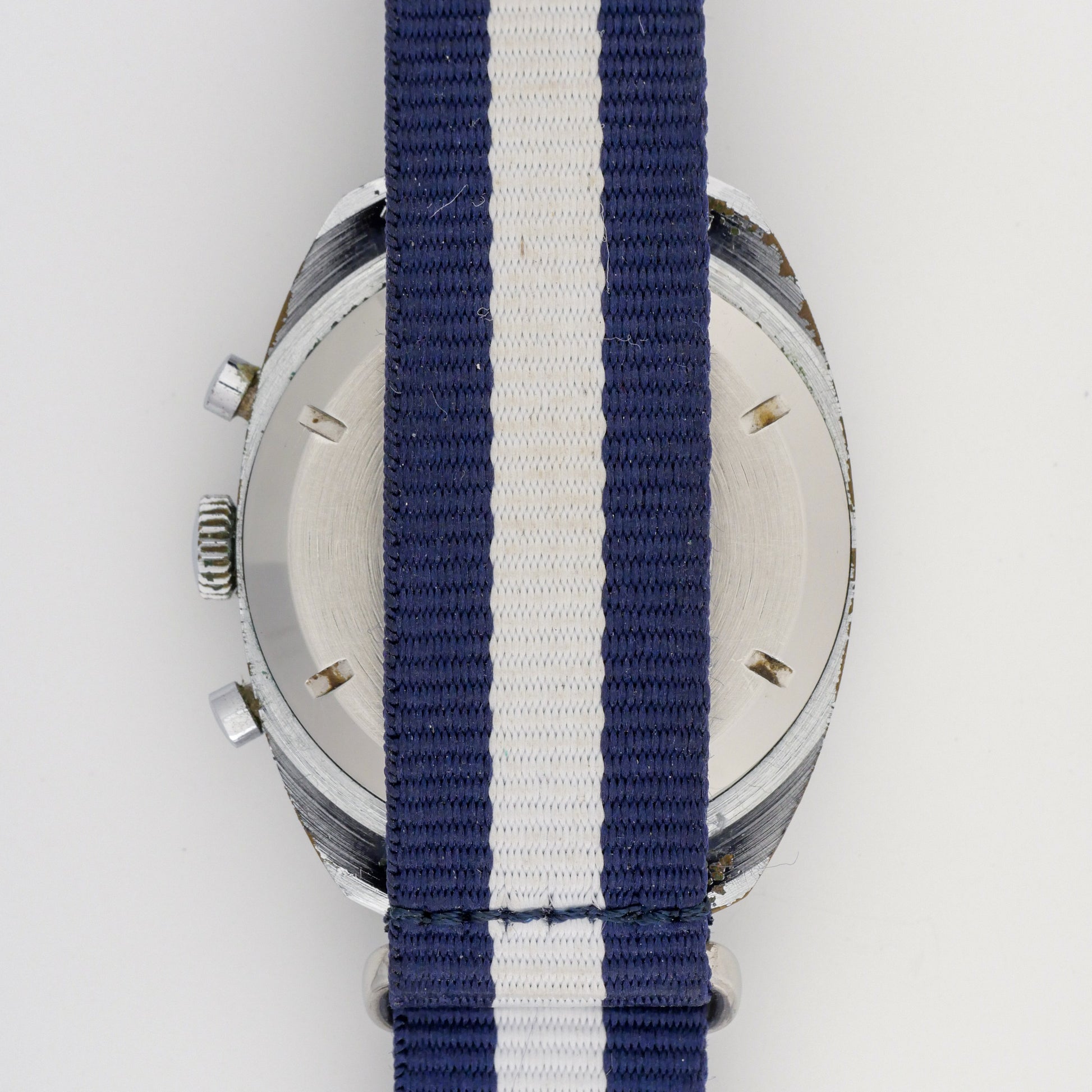 - Dial: displays considerable aging with noticeable patina development on the lume plots, which have turned a creamy yellow color. The dial surface shows some spotting and signs of aging. The printing remains legible, though there are some imperfections. The subdials maintain their cream color with some minor aging, and the distinctive orange chronograph hands show their original vibrant color.