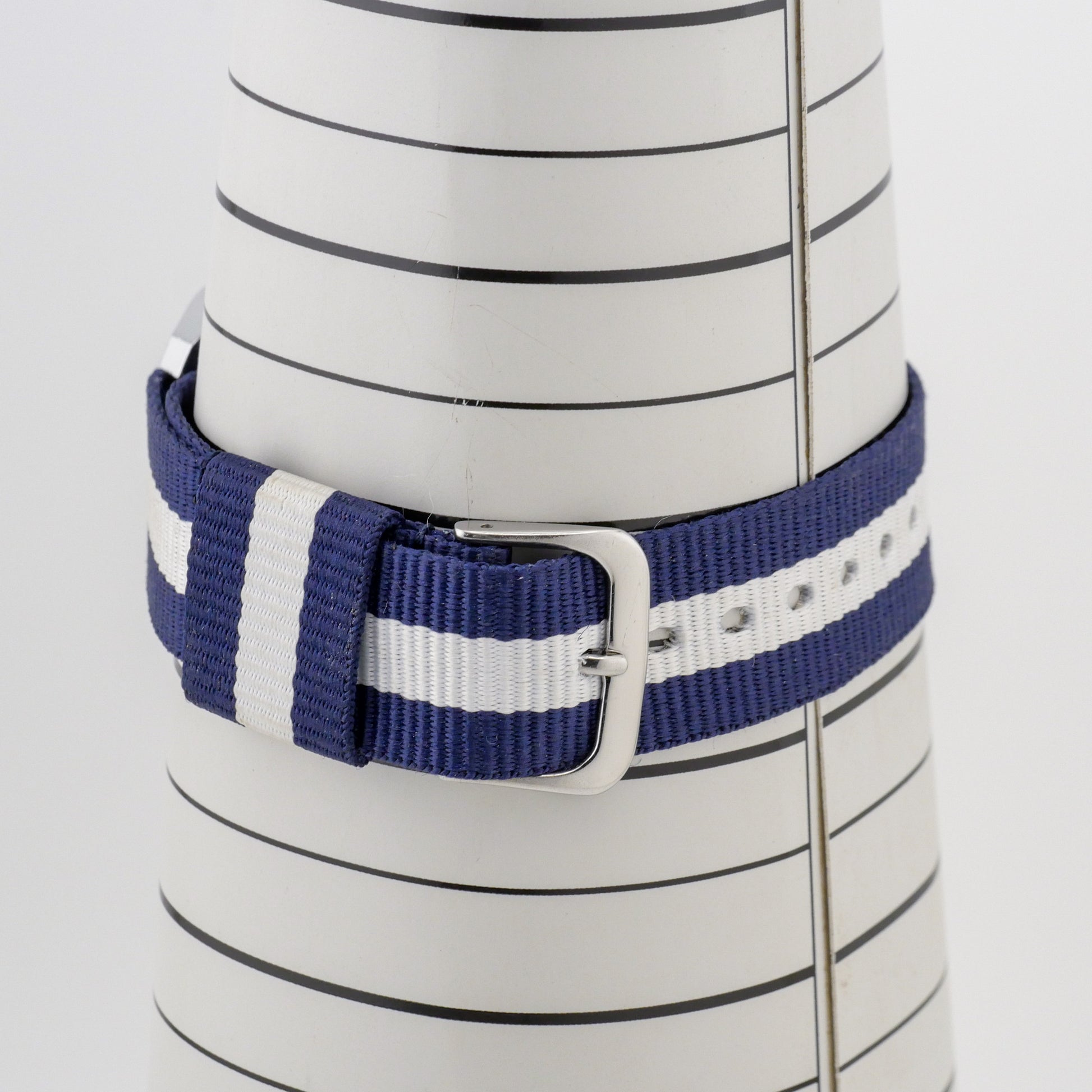 - Blue dial with applied luminous Arabic numerals at 12, 2, 4, 6, 8, and 10 positions