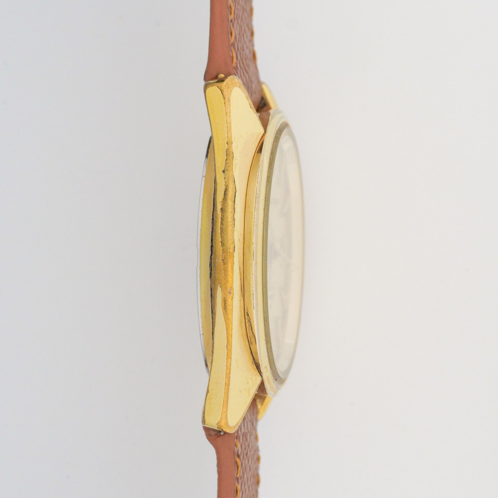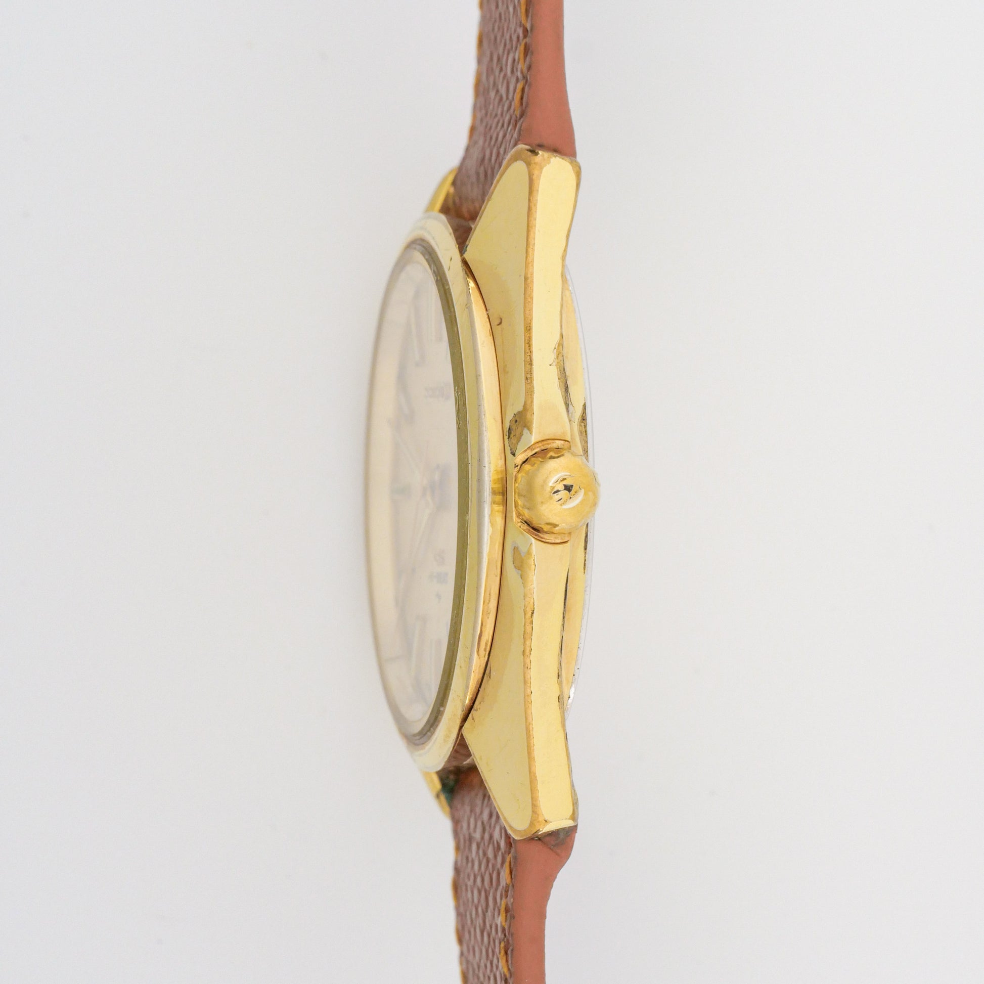 - Dial: Refinished dial with champagne gold finish. Shows minor spotting and light discoloration around edges. Printing and applied markers intact.